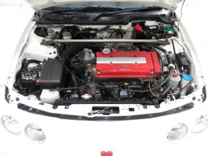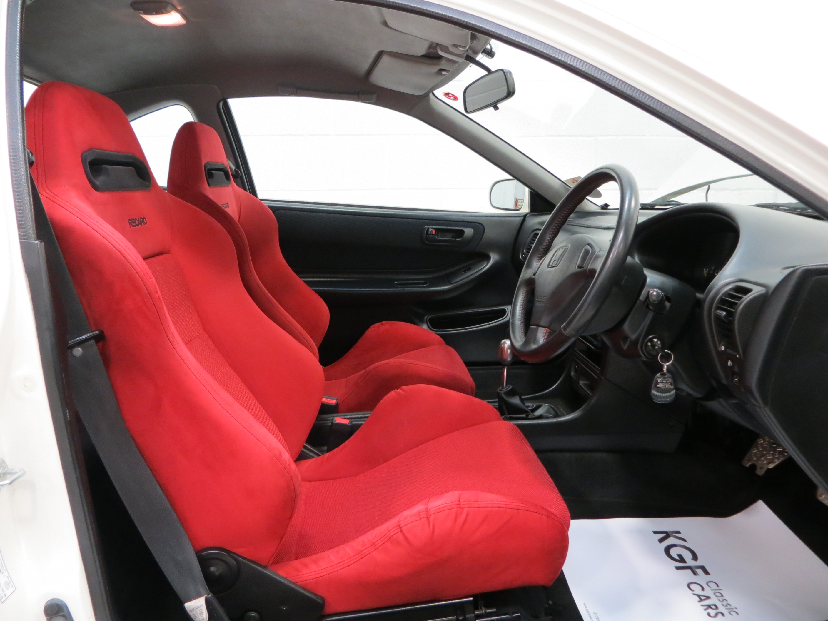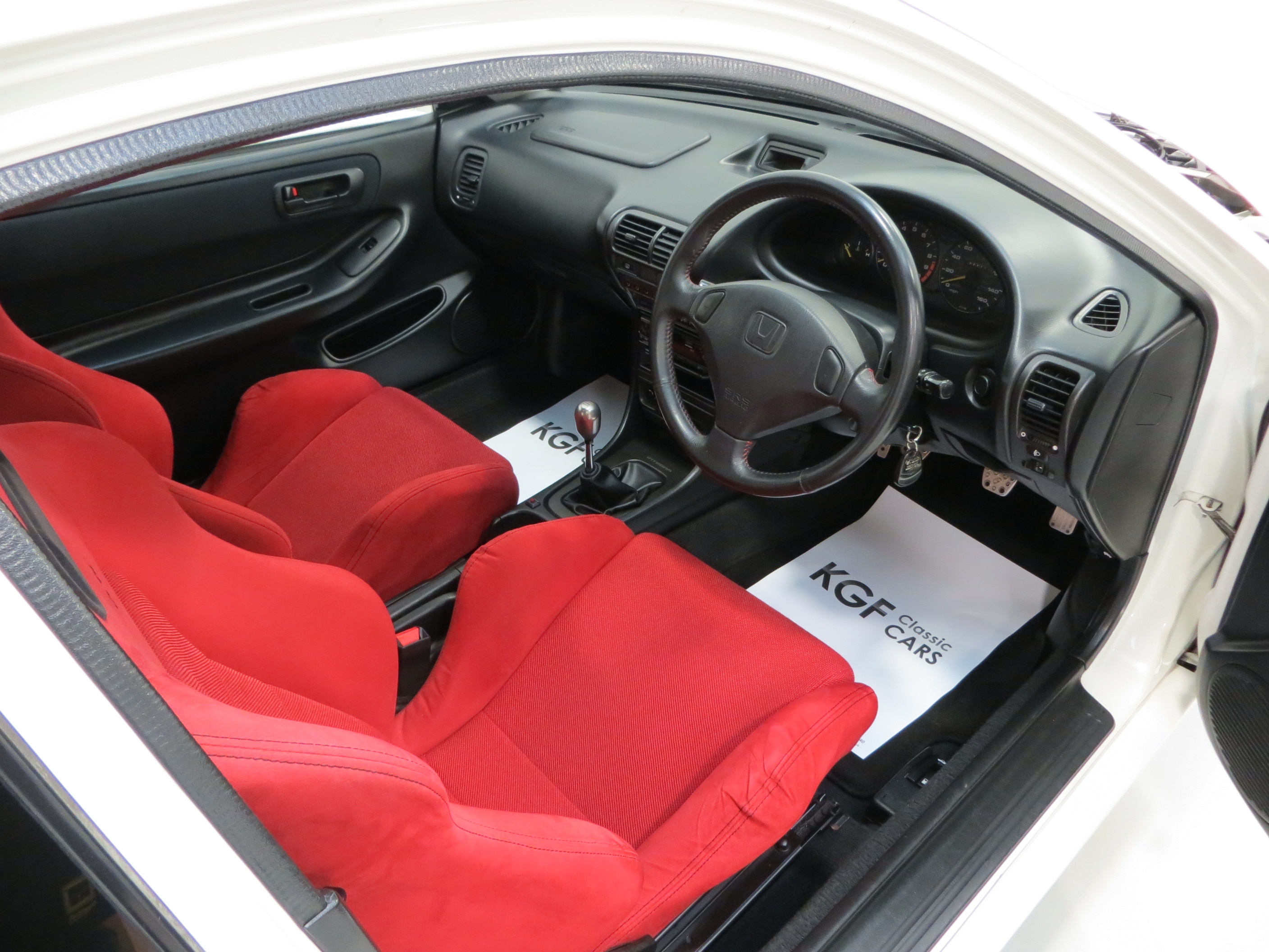 Peer into the cabin of this factory original example and the bold bright red Recaro front seats catch the eye instantly. These fantastic sporting seats hold the front seat occupants absolutely firm, even upon spirited cornering! Only very minor creasing to the fabric on the driver’s seat outer bolster can be seen and the contrasting rear bench in black is as new, along with all other interior upholstery and trimmings. Once positioned securely and safely, the lightweight titanium gearknob, leather bound wheel with red stitching and optional sports pedals hint towards the excitement in store. All switches, knobs and dials function correctly and the fascia is pristine. Hondas focused and near obsessive desire to save weight has resulted in the removal of sound insulation in some areas and even the transmission dampening. Factory stickers remain in the door shuts and the numbered badge 00196 still proudly on display as it left the factory. Wonderful.
