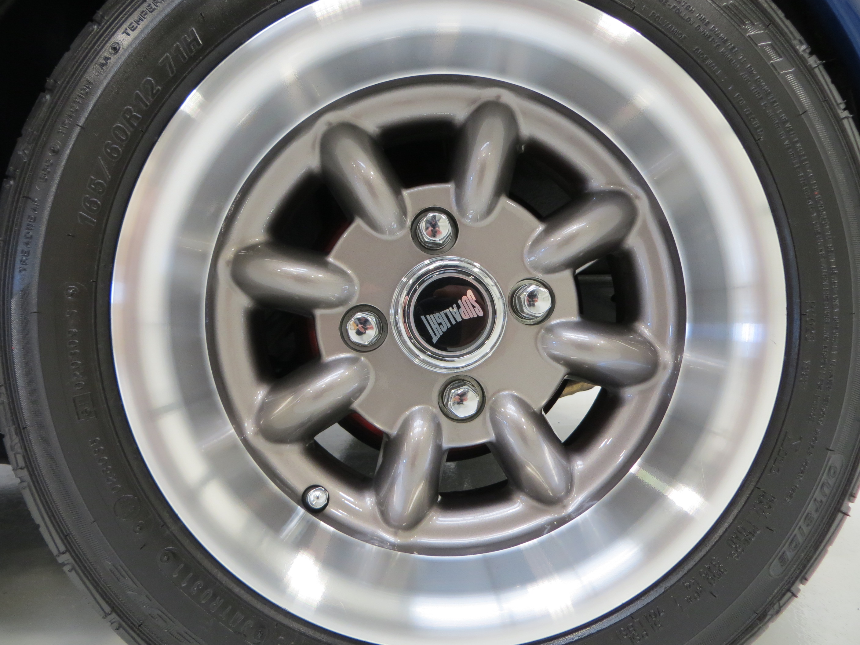 Eye catching and pristine 12in Superlight deep dish alloy wheels look brilliant with absolutely no damage whatsoever. Quality Falken Ziex 165/60 R12 tyres have masses of tread remaining. The spare wheel is housed correctly alongside the battery in a fully trimmed boot area. The dual line hydraulic brakes incorporate the original drum set up all round to offer adequate stopping power.