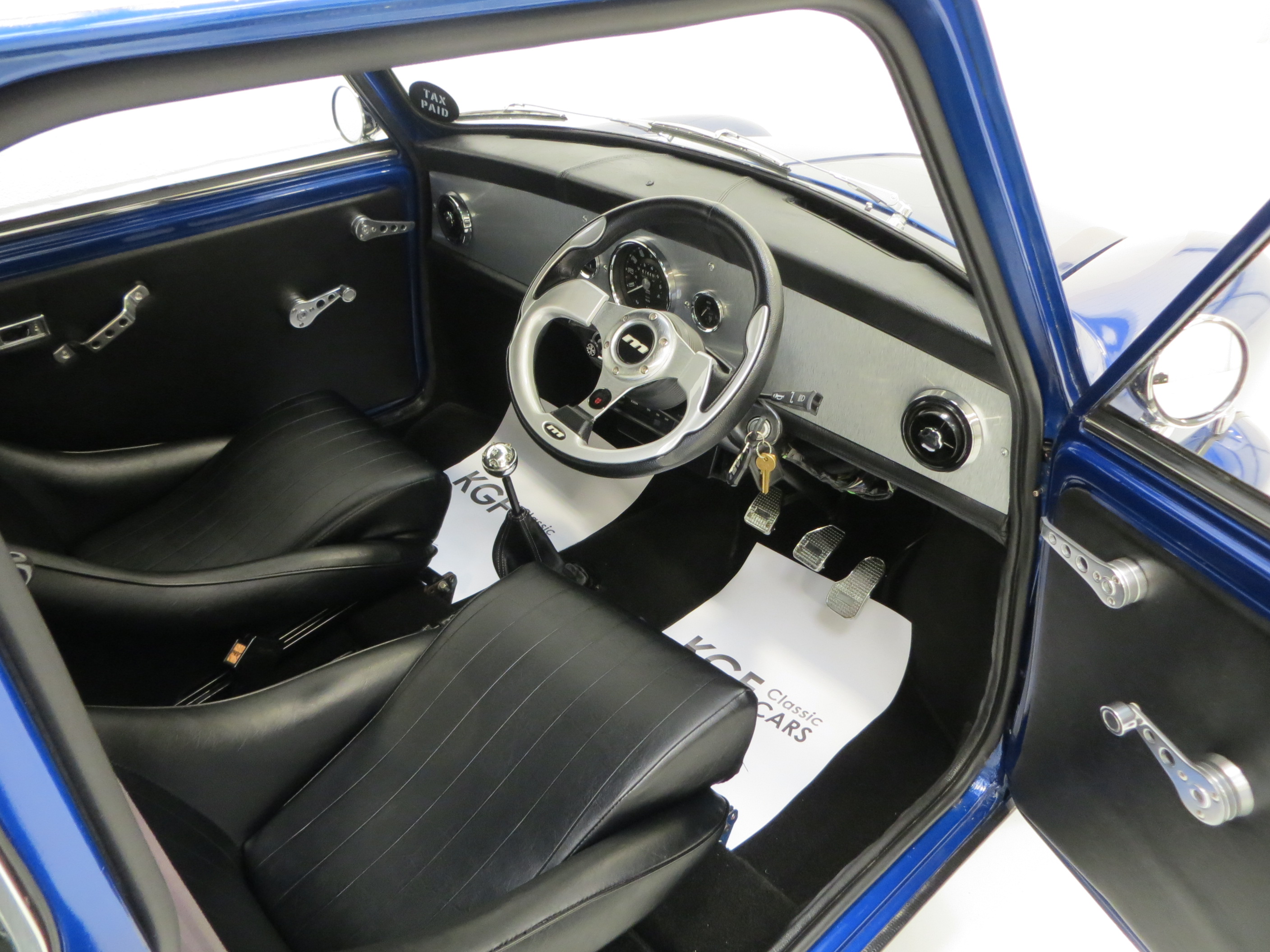The figure hugging buckets seats to the front hold the occupants tightly and safely and are pristine, as is the matching rear bench. The matching black door cards are dressed with alloy fitments to compliment the cars styling immensely. Brand new black carpeting and leatherette headlining are further enhancements to the interior. Completing the package is the leather topped dash and stainless steel fascia tastefully upgraded but still retaining the original smith speedometer and gauges. All functions and controls operate. A specialist Mini parts supplier invoice is in the file with documented spend of £718.35 on interior trim in September 2014 alone!