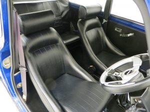 All steel unitary construction, hinged rear quarter windows, inertia reel front seatbelts, two speed windscreen wipers with electric wash, flick wipe facility, electrically heated rear window, fresh air heater/demister, central speedometer and instrument cluster. ‘Electric Blue’ upgrades to include; torpedo mirrors, chrome bumpers and grille, Aston quick release fuel filler, chrome spot lamps, wide Sportspack style arch spats, Classic front bucket seats, M Range sports steering wheel, alloy gear knob, alloy sports pedals, 10 piece alloy interior handle set, full carpet and insulation set, boot lining kit, stainless steel fascia, leather dash top, chrome rear view mirror, black head lining, remote Scorpion alarm system.