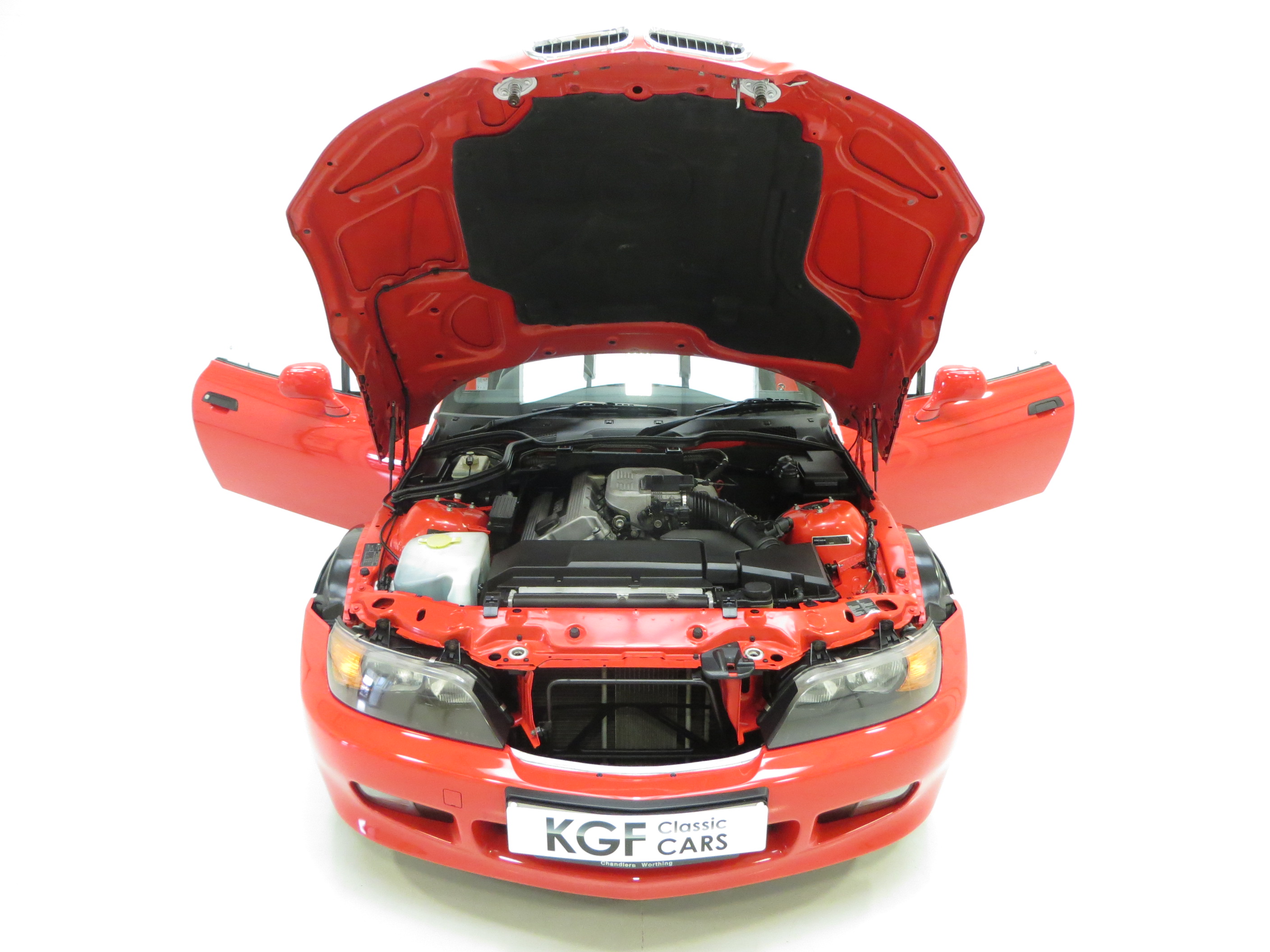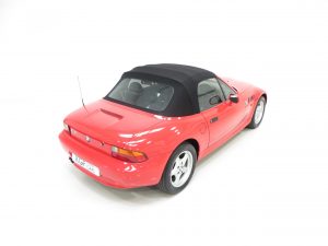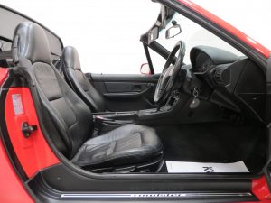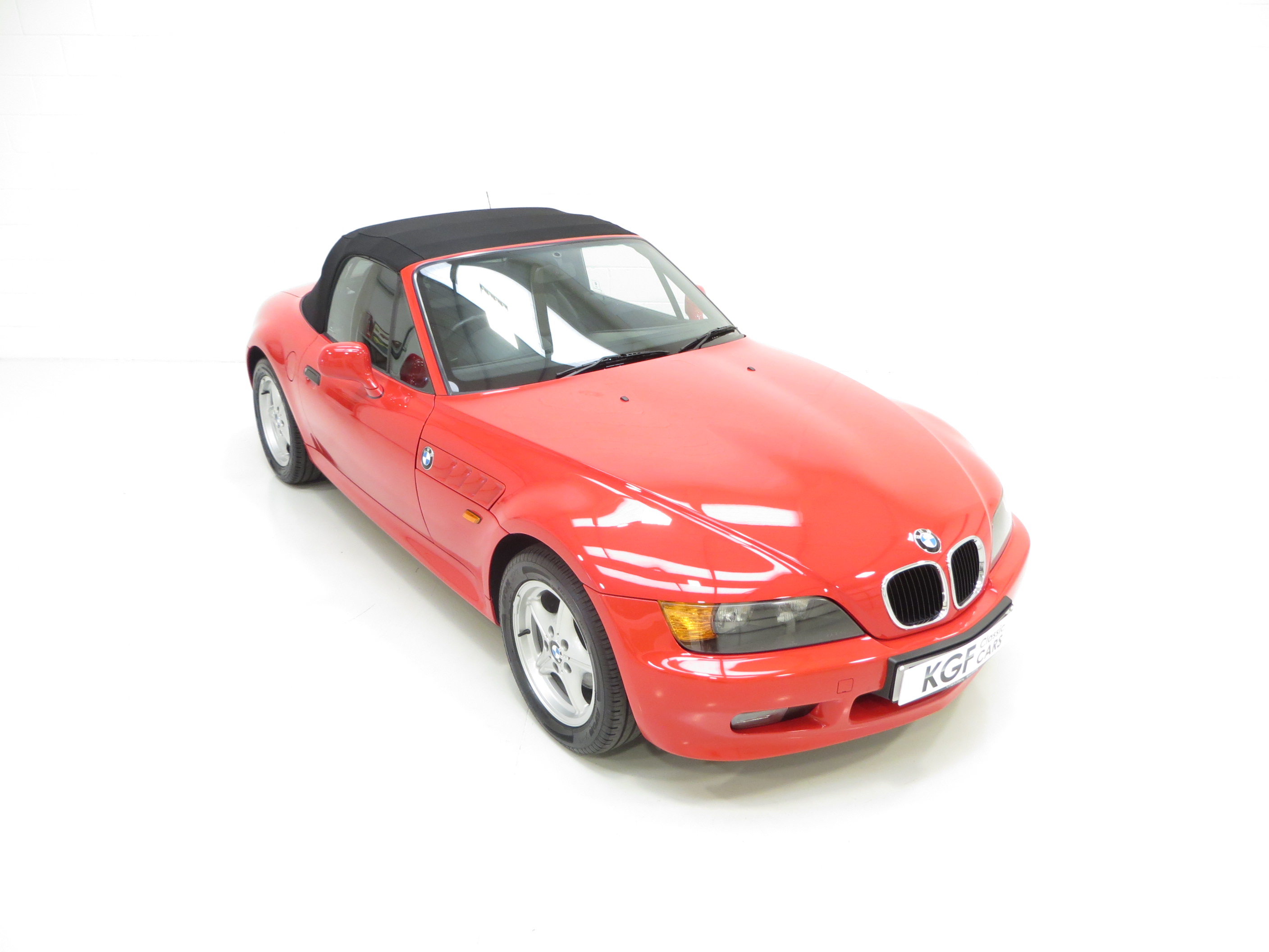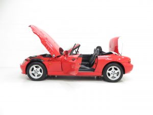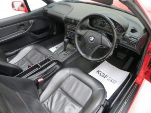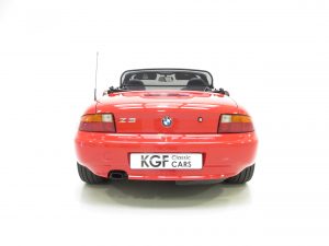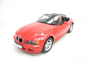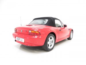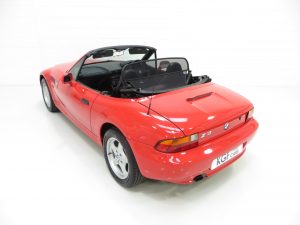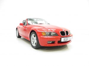 This sporting two seater BMW Z3 Roadster is finished in stunning vibrant BMW Bright Red (code 314) to accentuate the classic lines of this fun sports car with its sweeping bonnet and low slung waistline. The paint work boasts an incredible bright polished shine and pleasing uniform finish, every inch the stereotypical red sports car! The term flawless can often be misused but aside from a couple of almost undetectable stone chips to the front, this example clearly warrants the accolade. Effortless in operation, the soft top hood is simply pristine with a clear and crease free rear screen. All trim, glass lights and badges are immaculate and even the supplying dealer number plates remain fitted. This low mileage and low owner example displays its cherished existence without question and now represents a highly desirable modern classic, utterly usable and ready for the sunshine!