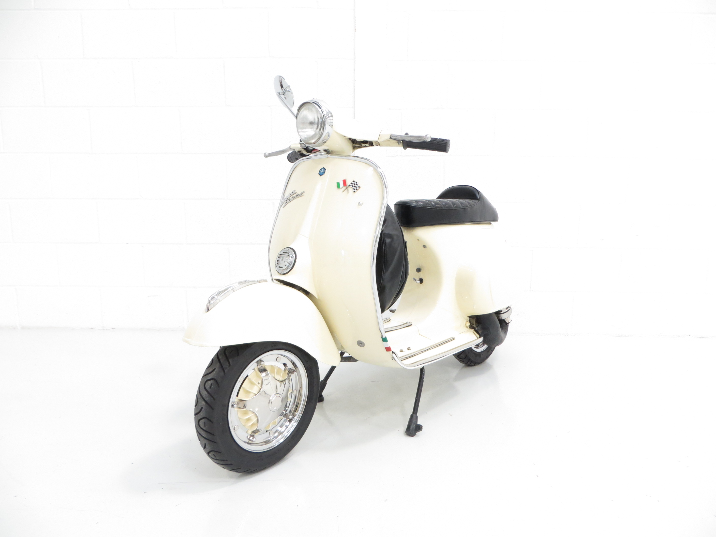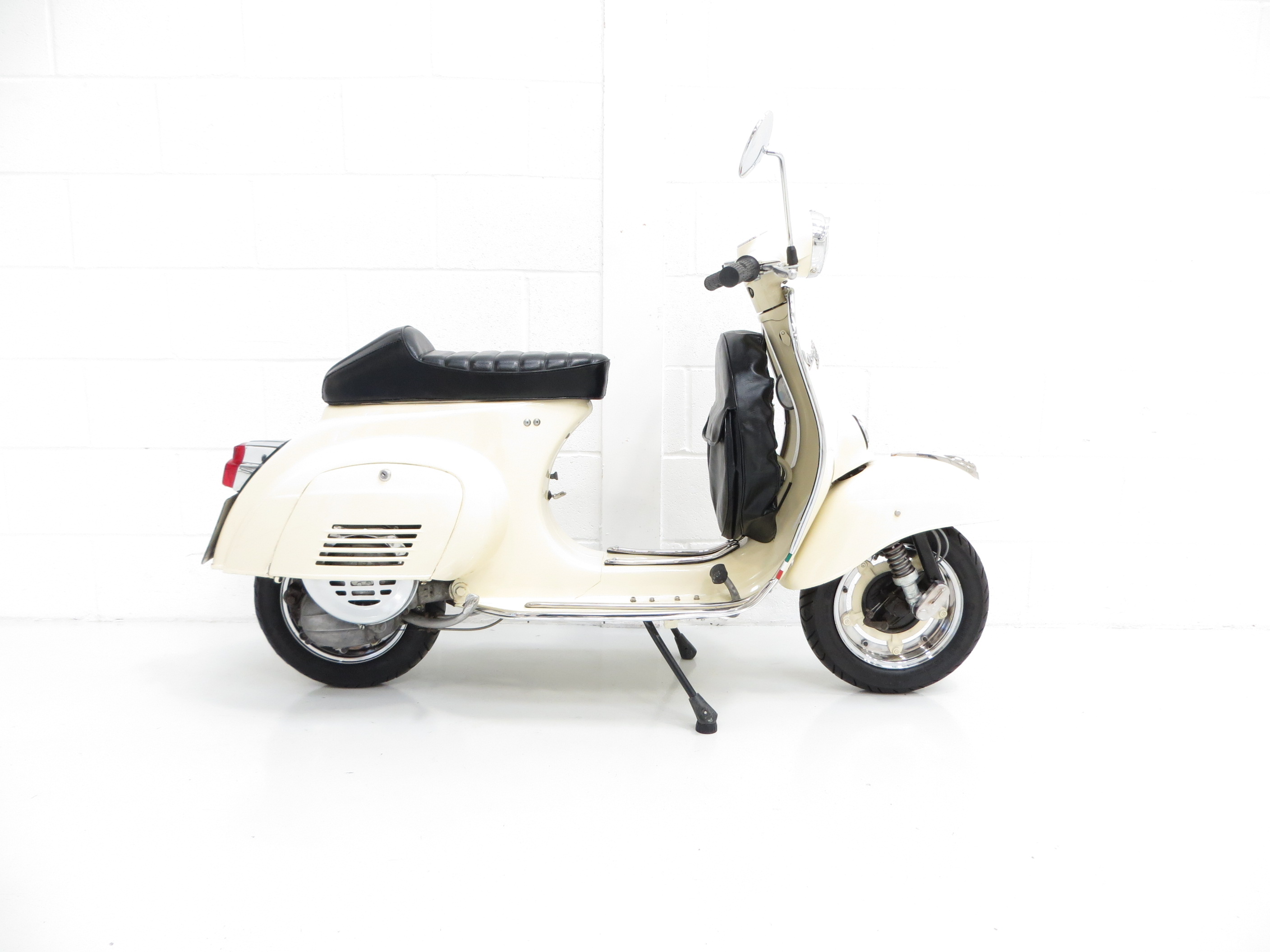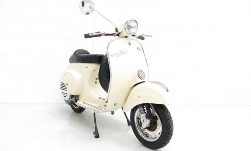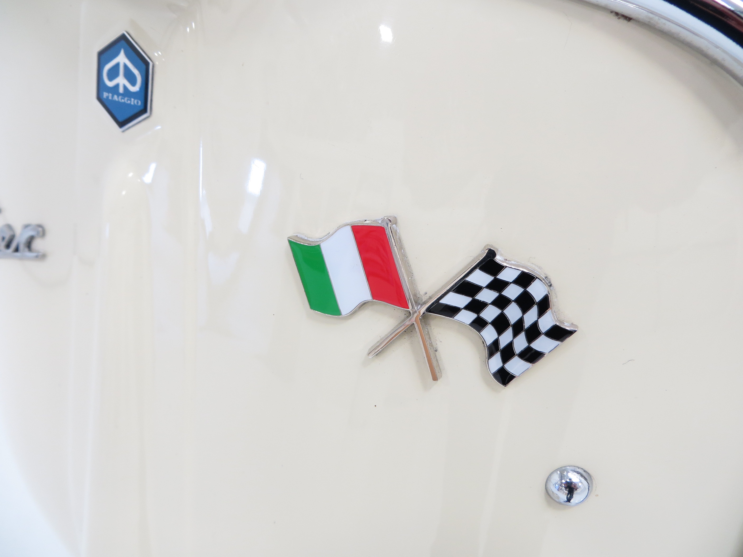 The smallframe Vespa is one of the last of the Vespa designs to be penned by Corradano D’Ascanio, the designer of the first Vespa and this beautiful example is finished in Ivory White. Elegant and outstanding simplicity is enhanced with wonderful chrome enhancements all in fabulous clean condition. The black seat material matches the spare wheel cover and is immaculate. A few minor markings mainly to the foot area will not disappoint those seeking a prime example. The Piaggio logo can be seen in the grips and along with all the badges offer a glorious spectacle of classic scooter nostalgia.