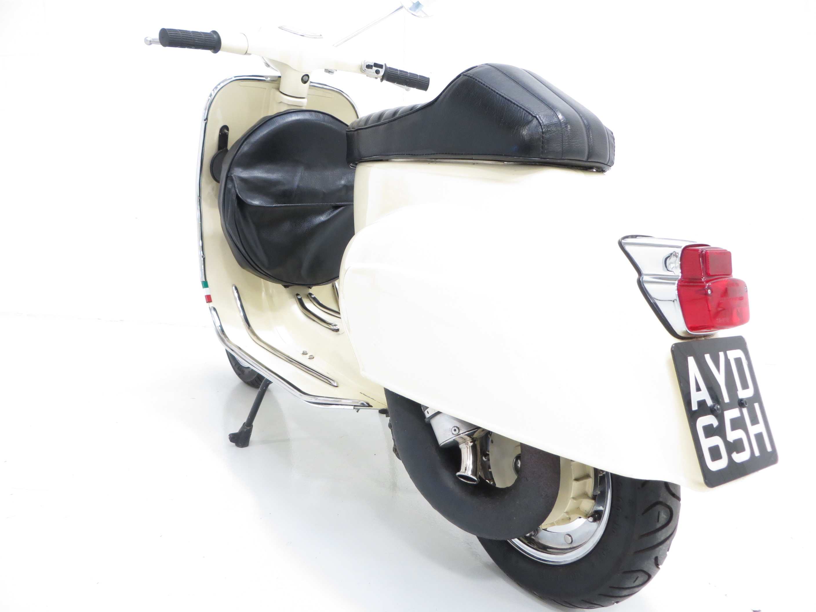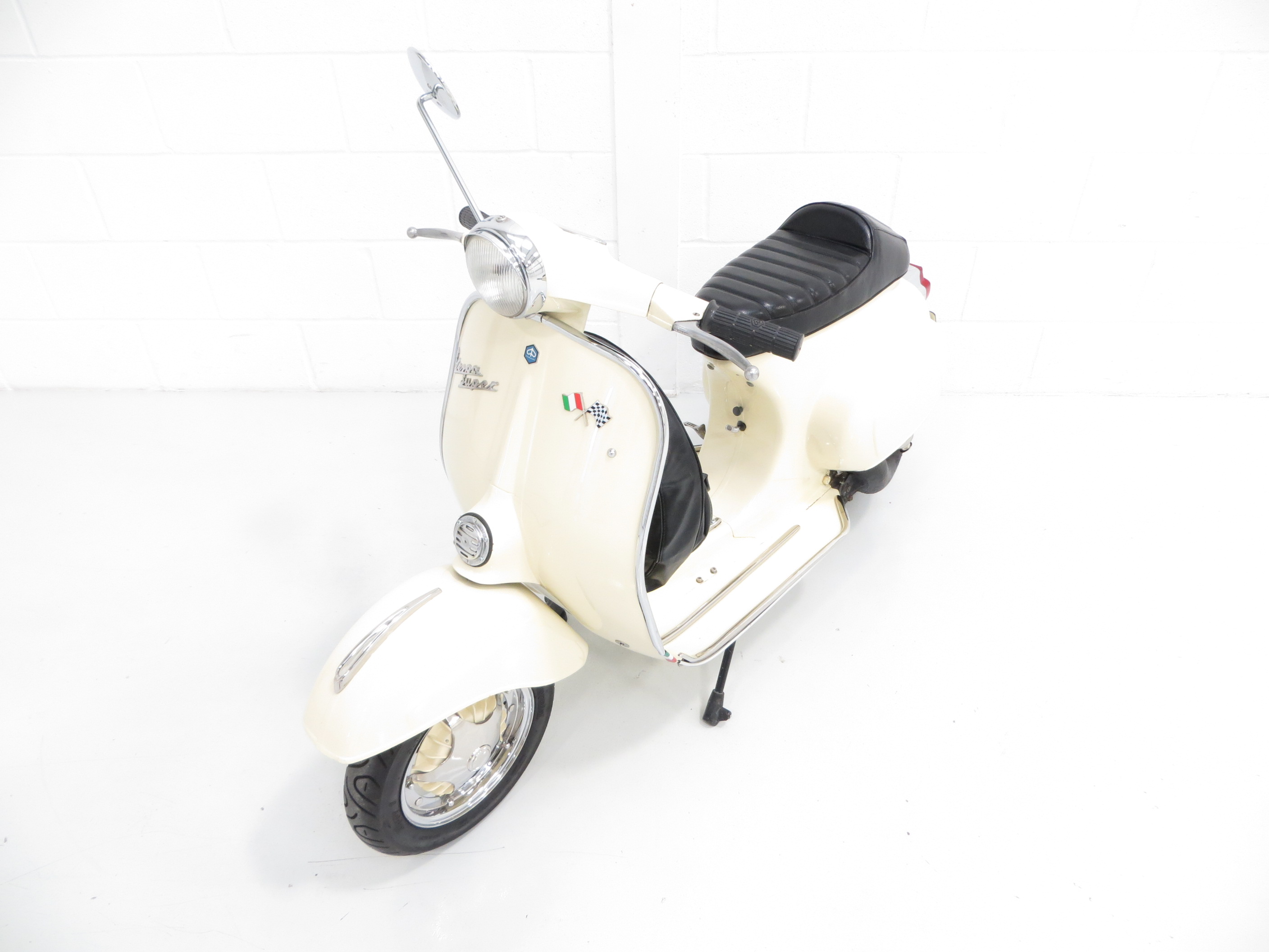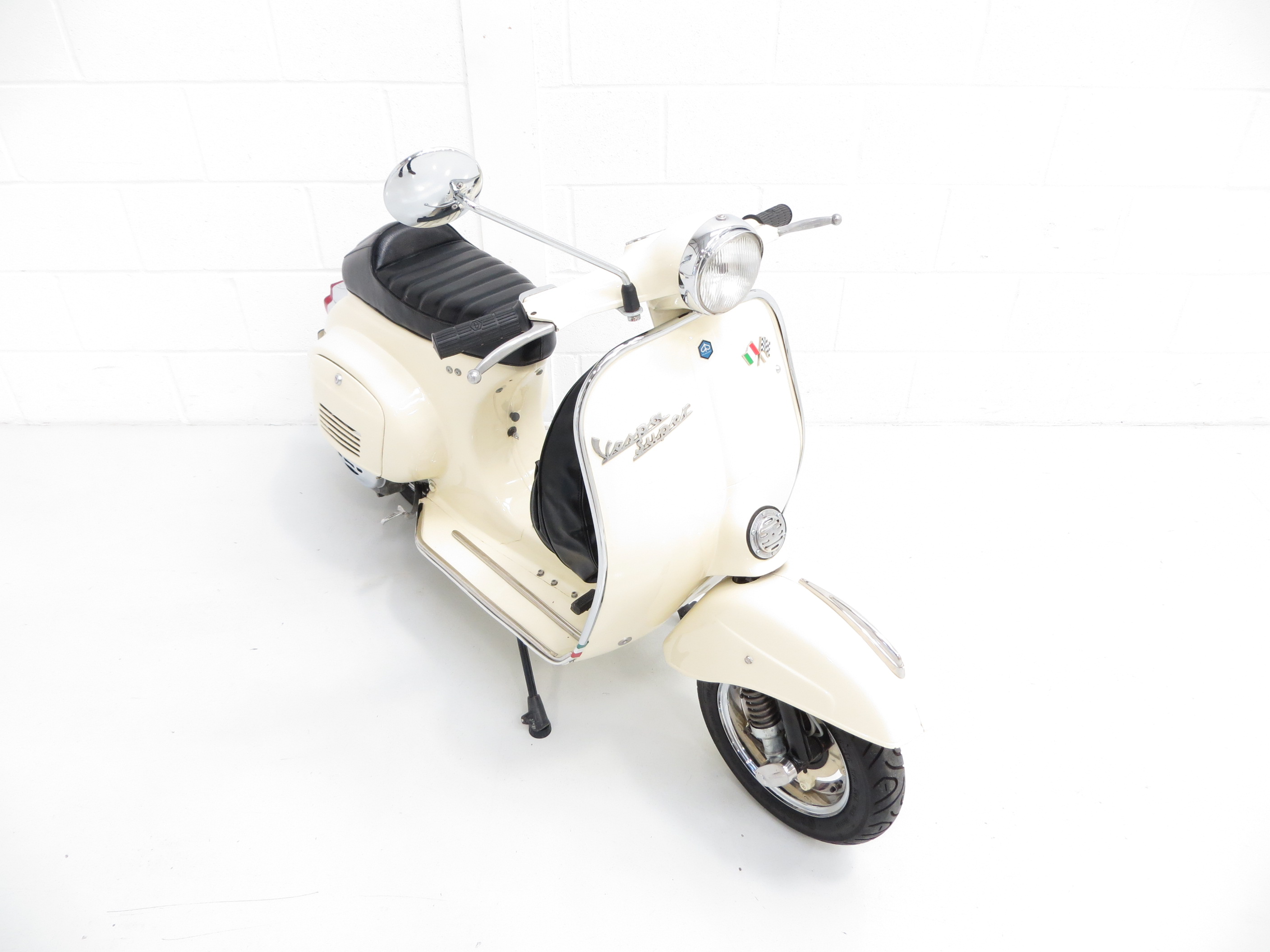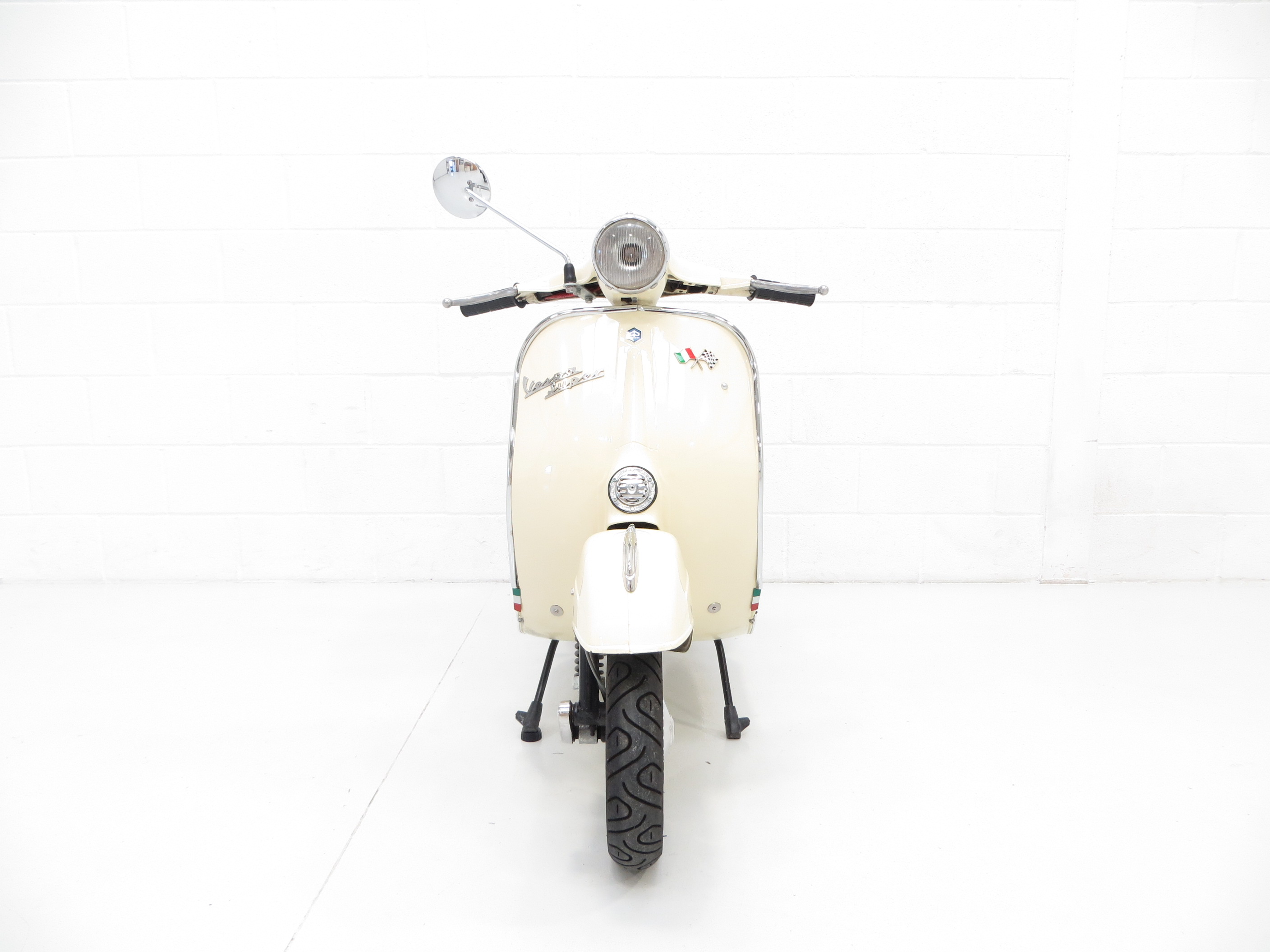The smallframe Vespa is one of the last of the Vespa designs to be penned by Corradano D’Ascanio, the designer of the first Vespa and this beautiful example is finished in Ivory White. Elegant and outstanding simplicity is enhanced with wonderful chrome enhancements all in fabulous clean condition. The black seat material matches the spare wheel cover and is immaculate. A few minor markings mainly to the foot area will not disappoint those seeking a prime example. The Piaggio logo can be seen in the grips and along with all the badges offer a glorious spectacle of classic scooter nostalgia.