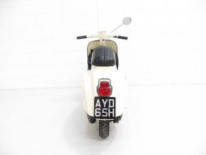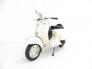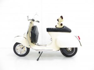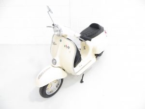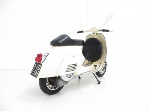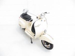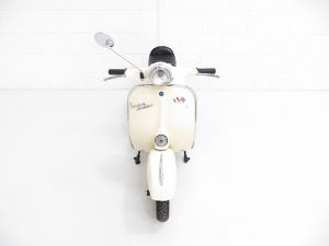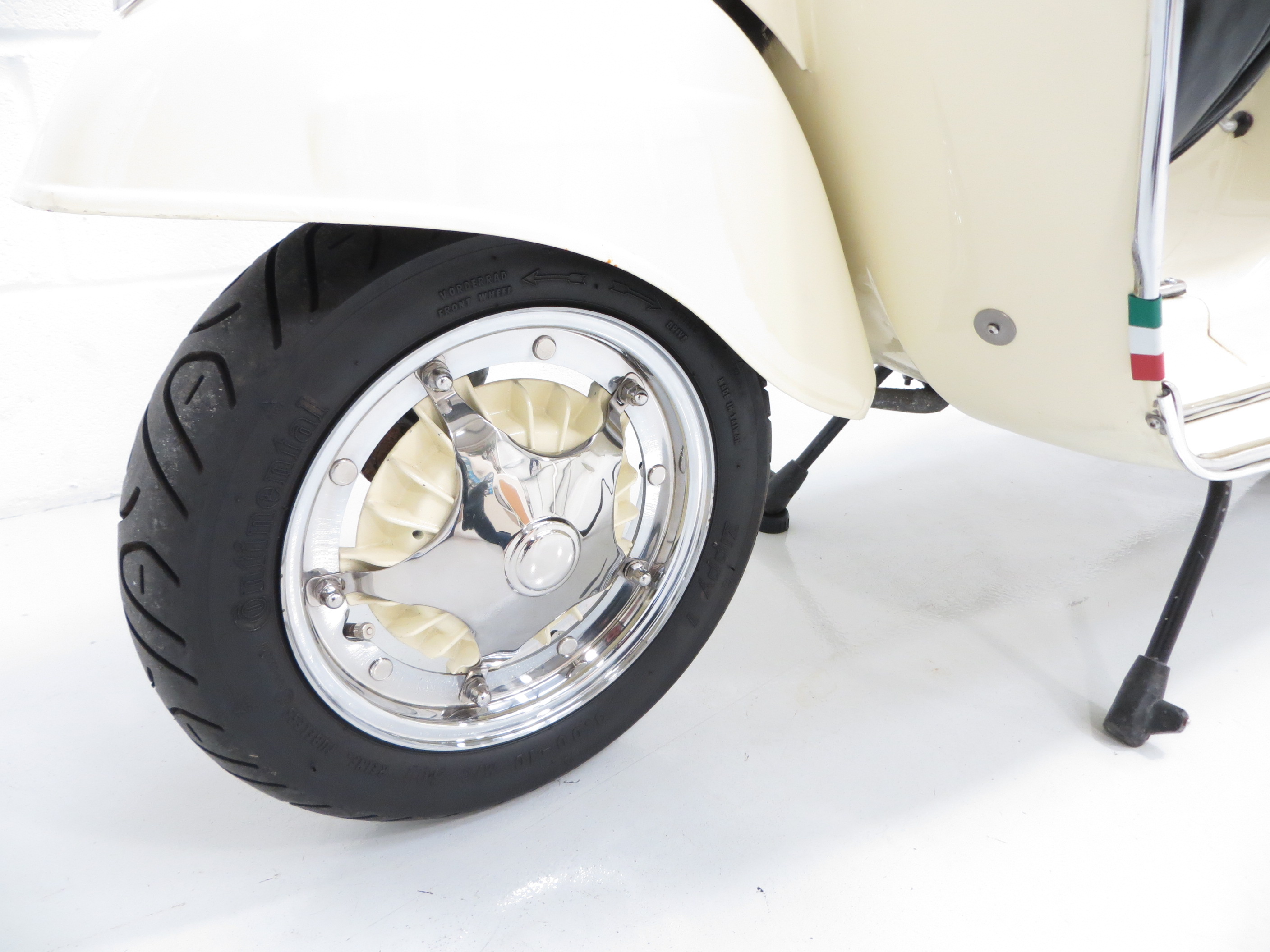 Vespa 10” polished aluminium cast wheels with matching chrome and Ivory White centres look fabulous and give the scooter a chic appearance. New Continental 3.00 – 10 tubeless tyres are fitted front, rear and spare. Expansion type brakes with flexible control cables operate correctly.