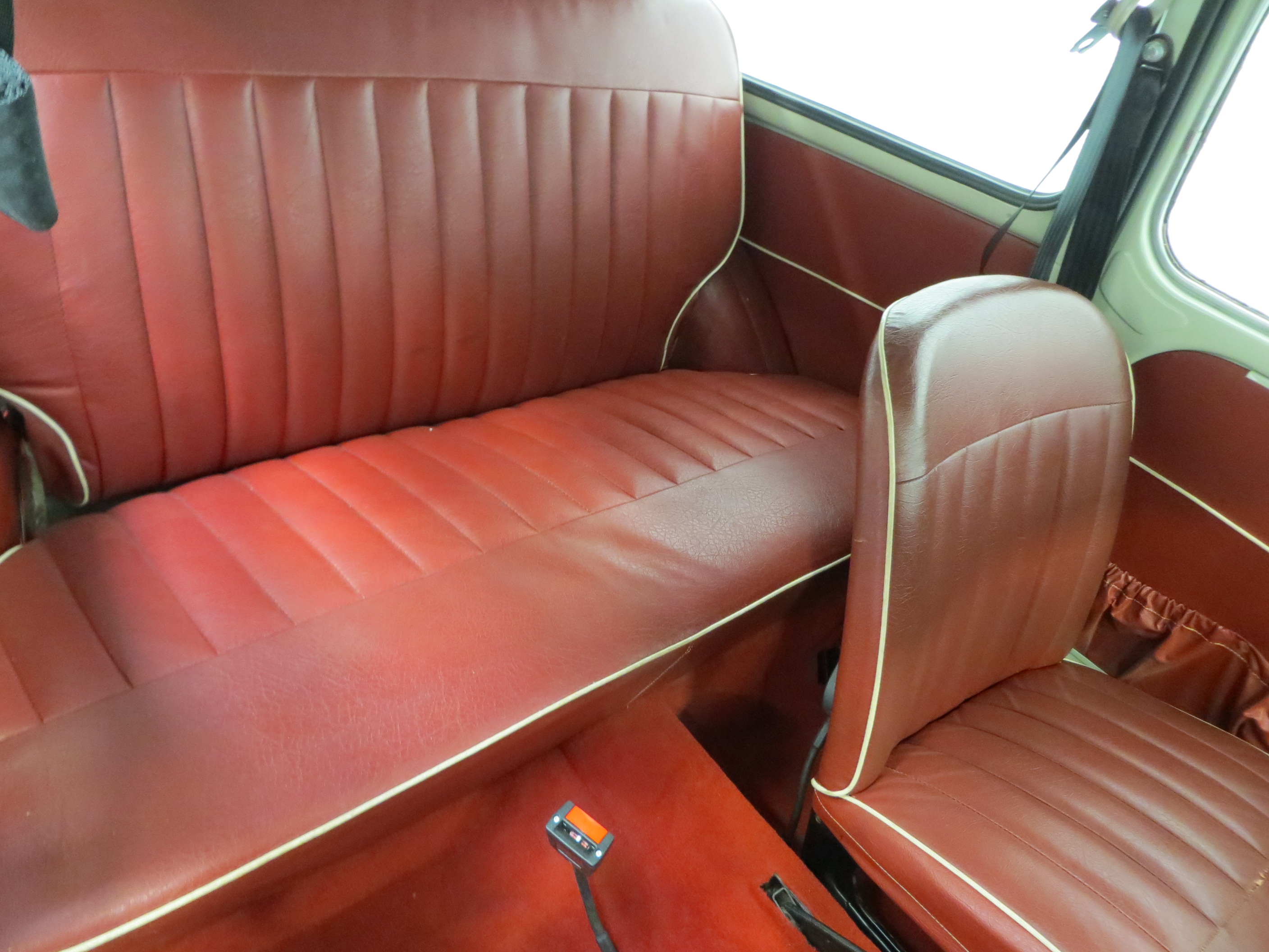 Large diameter headlamps, chrome bumpers with front and rear overriders, swivelling quarter lights, stainless steel brightwork and door furniture, padded dashboard, ashtray, large parcel shelf, tilt access front seats, folding rear seat, fresh air heater and demister, water temperature light, windscreen washer. Dealer fit accessories; Front yellow tint spot lamps, chrome door mirror.