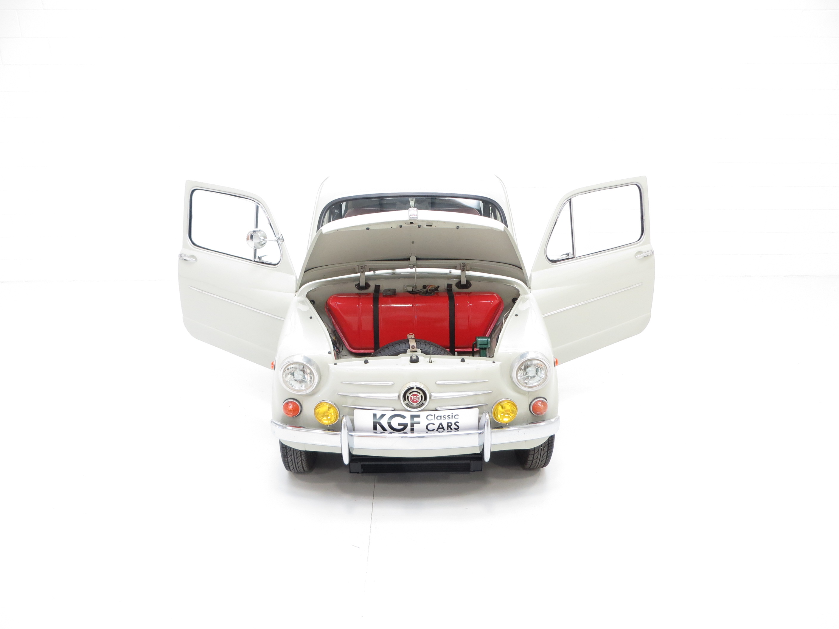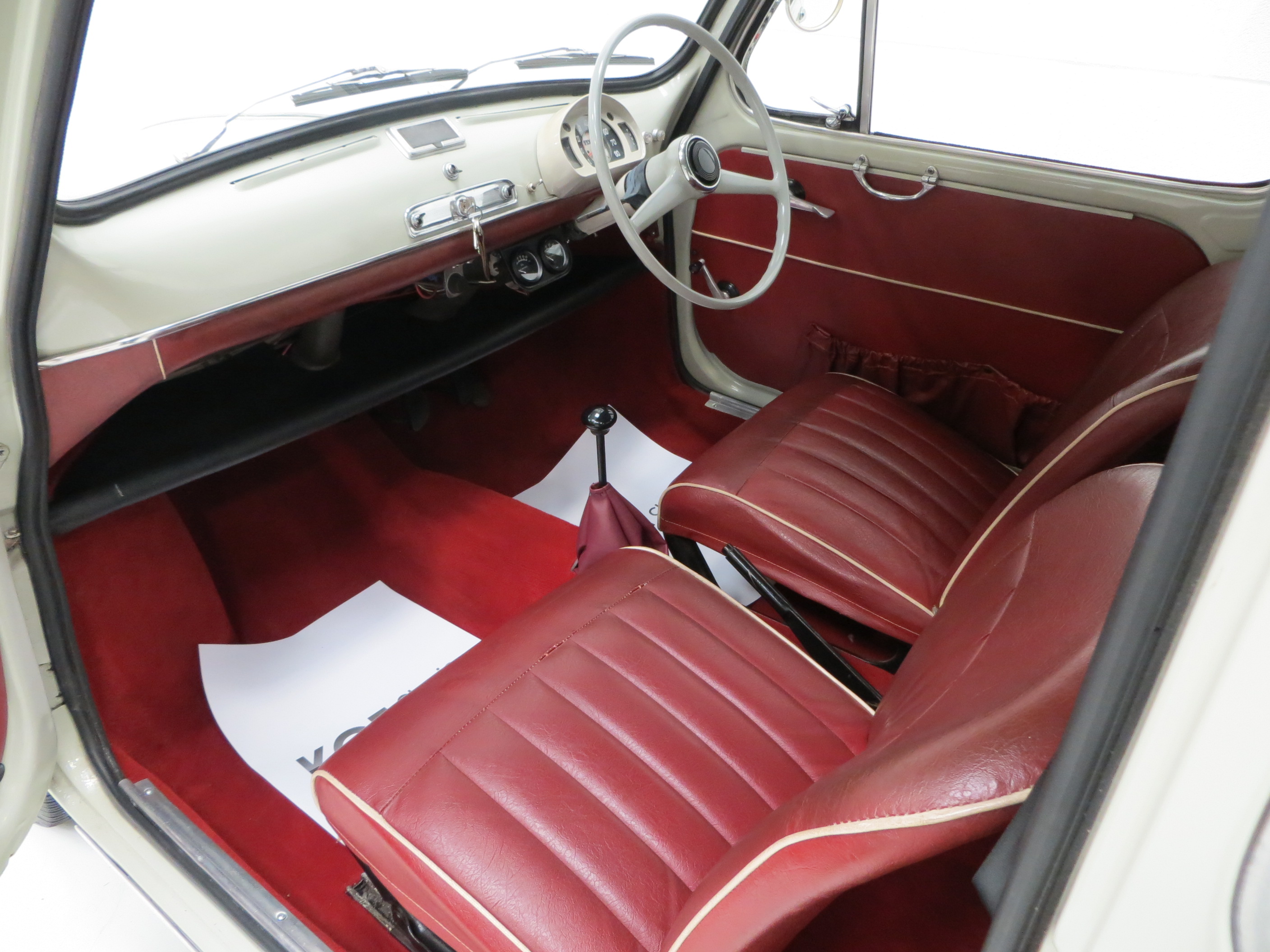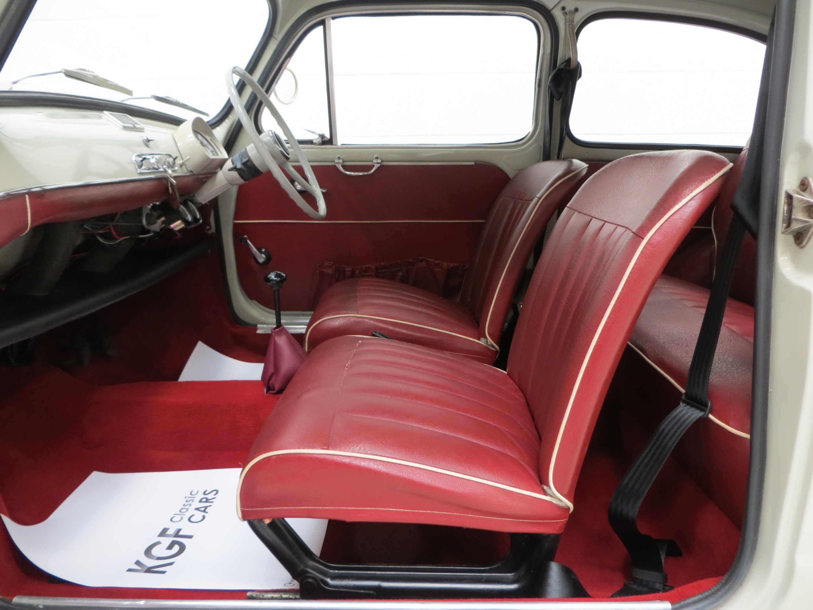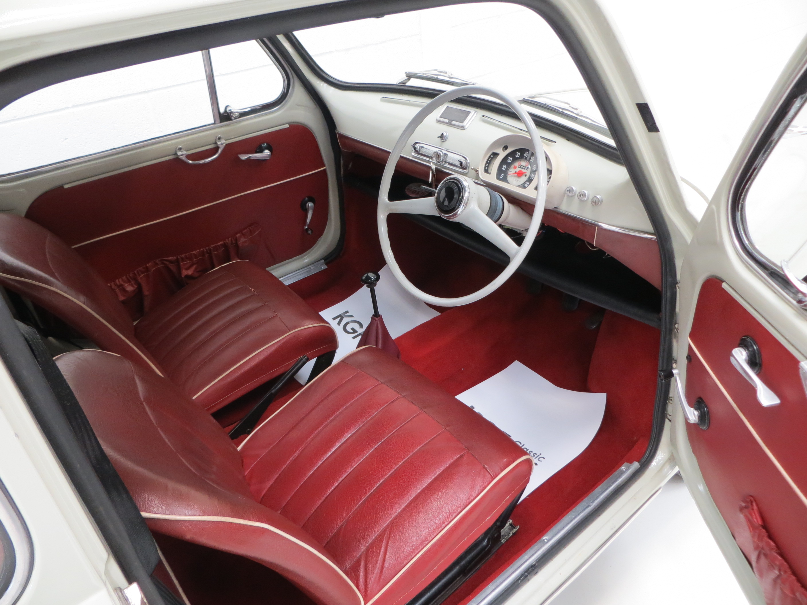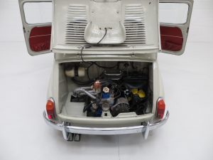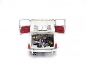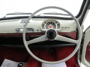 The interior styling of this classic Italian supermini is every inch a fashion icon and epitomises chic design. The original deep red vinyl seats with matching door cards and padded dash rail are in remarkable condition with no undue wear and tear. A tiny section of stitching on the passenger seat is stretched but has not come undone. The bright red carpeting is pristine as is the headlining and both compliment the upholstery colour scheme wonderfully. A conscientious previous owner has discreetly added an oil pressure and water temperature gauge. Design features such as the thin two spoke painted steering wheel to the ornate toggle switches and simplistic dials make this car as much a fashion accessory as a mode of transport, typically Italian! A very clean luggage compartment adds to an already very practical interior. Designed as frugal motoring for the masses, it’s hard to think of a more stylish way to travel on a budget.