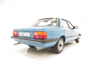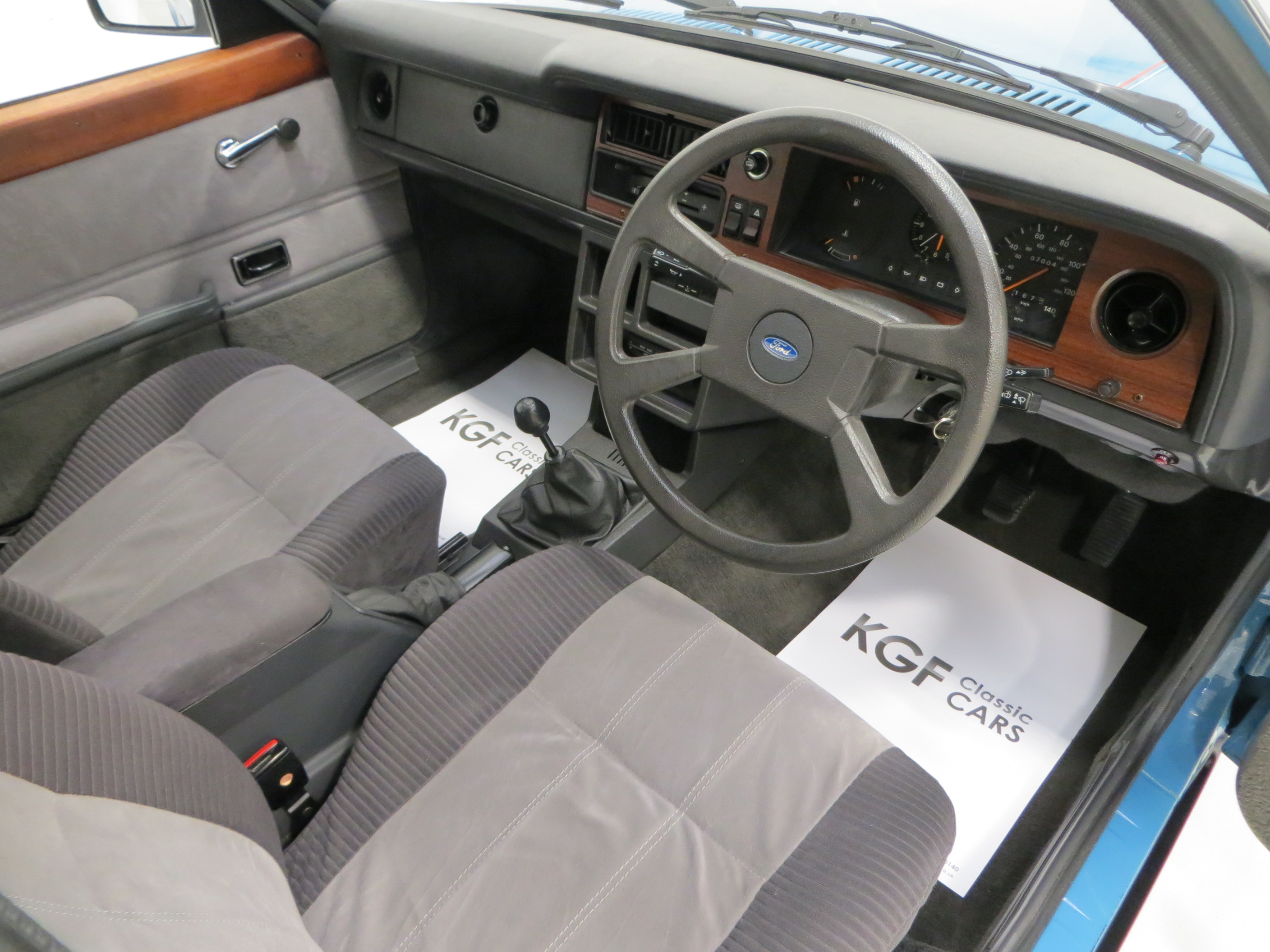 A factory fresh 1980’s Ford interior, unique, refined and well specified. The Durham and Velour plush fabric trimmed reclining seats match the colour keyed thick pile carpet normally reserved for Ghia models only. Carpeted lower sections on the doors raise to a light crushed velour topped by unmarked wood veneer door cappings adding luxury to this impressive livery. With such low mileage covered all switchgear and functions operate exactly as intended and the dashboard and wood effect facia is perfect. The four-spoke steering wheel displays prominent veins and the pedal rubbers are unworn. A dealer supplied tax disc holder is also present. The boot area remains unused with jack and wheel brace. Impeccable pedigree.
