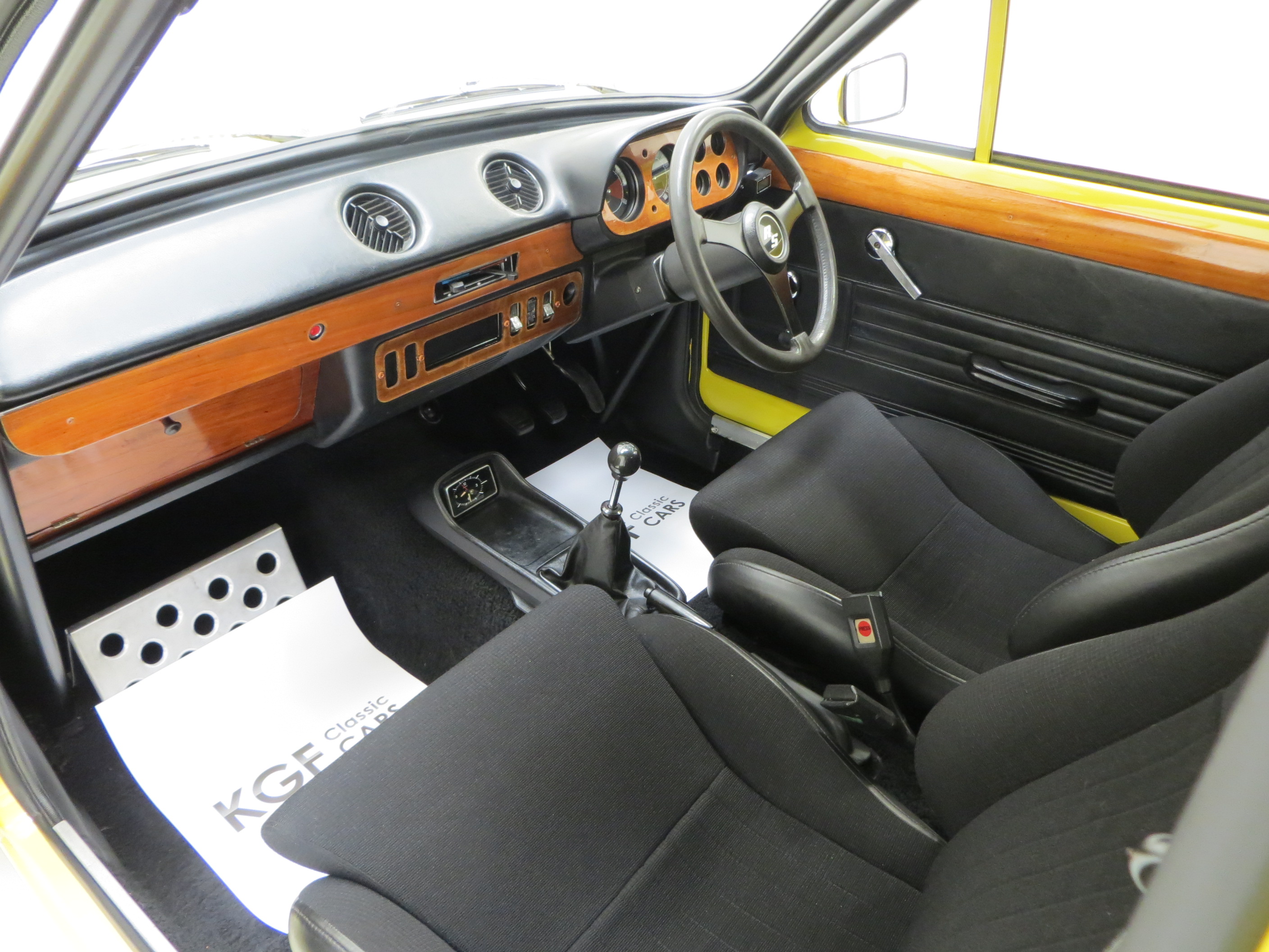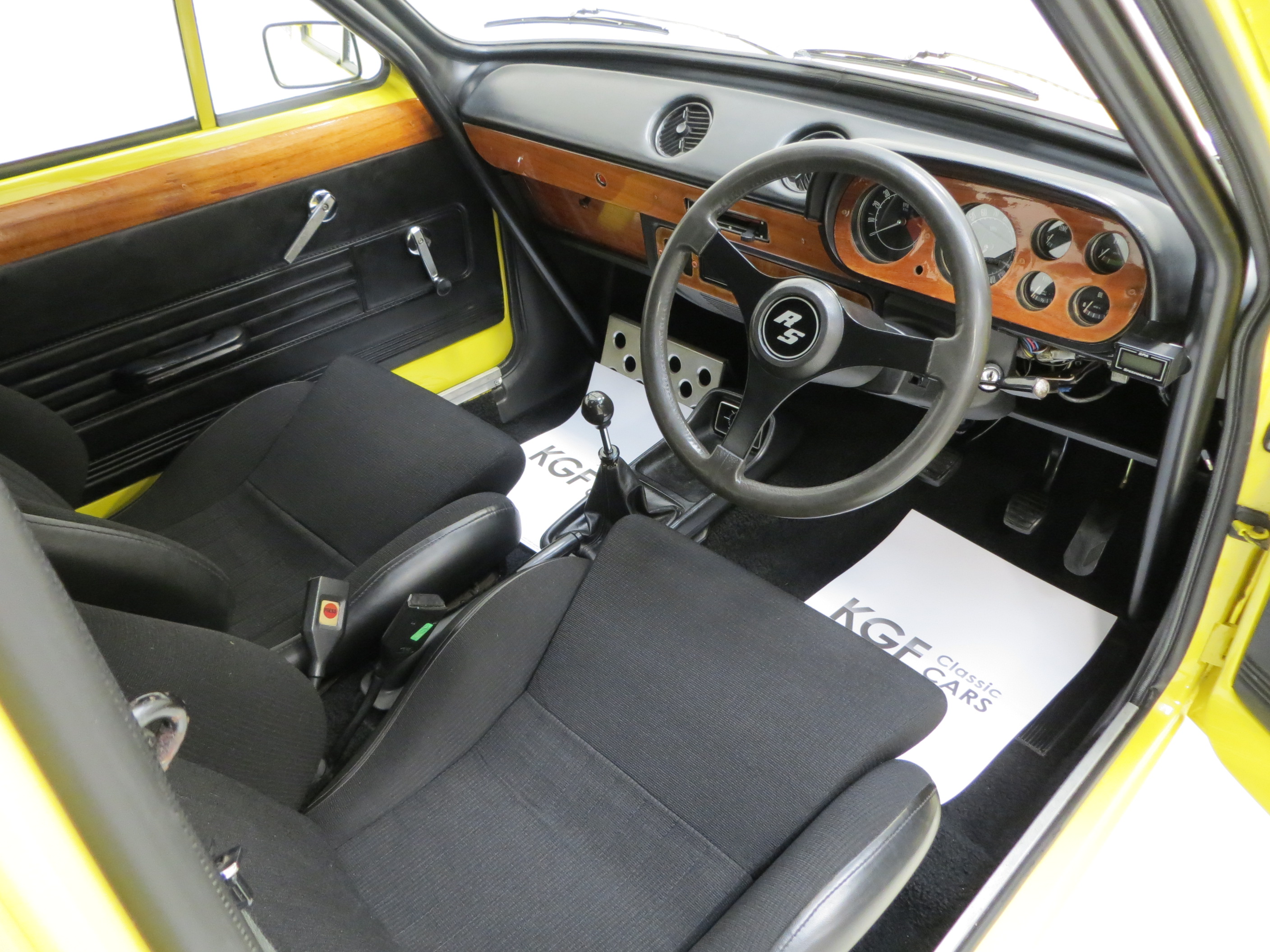 Front quarter bumpers, black painted aluminium grille, flared Clubman Pack wheel arches, strengthened chassis rails, strengthened flitch plates, Safety Devices roll cage, single leaf rear springs with turreted GP4 Bilstein shock absorbers, Bilstein front struts with roller top mounts, anti-tramp bar and panard rod, RS2000 rear axle with 3.5 differential, boot mounted battery, Ashley sports exhaust, six dial 140mph sports dash, SAP Design microprocessor speedo, bias adjustable brake pedal box, passenger footrest, anti-burst locks, front sports bucket seats, black headlining, RS three spoke steering wheel, heater fan, two speed wiper, courtesy light, hazard lights.