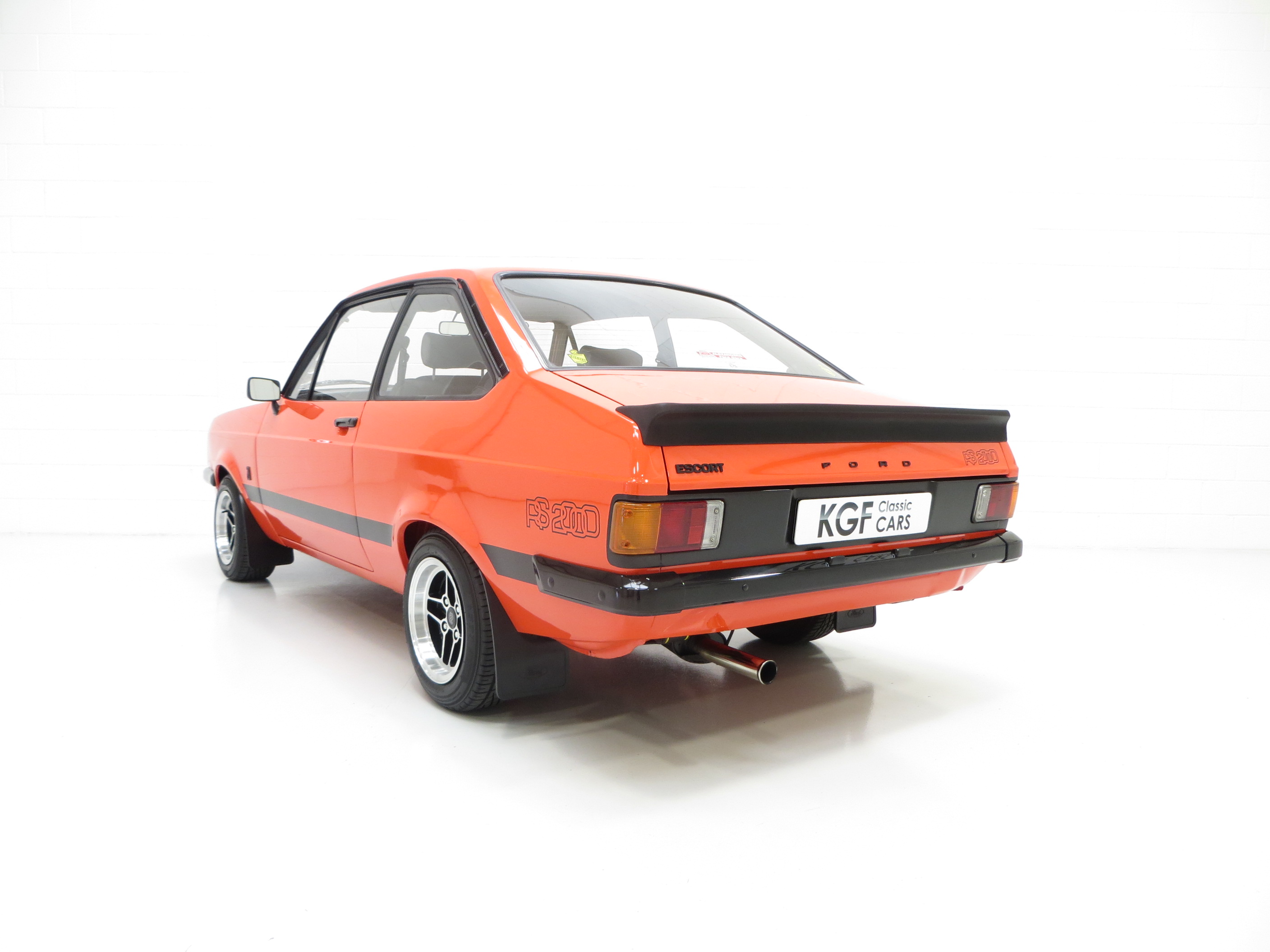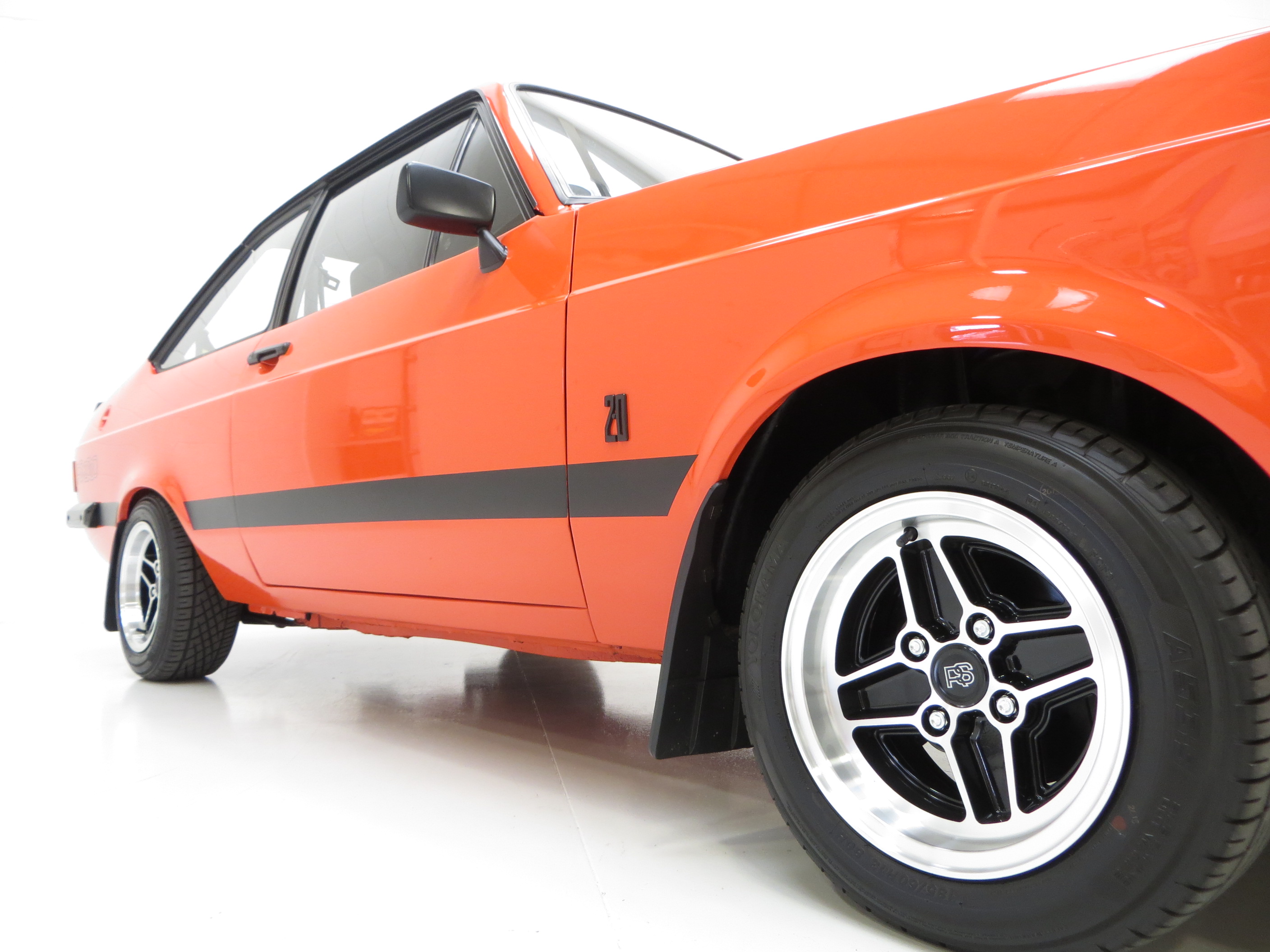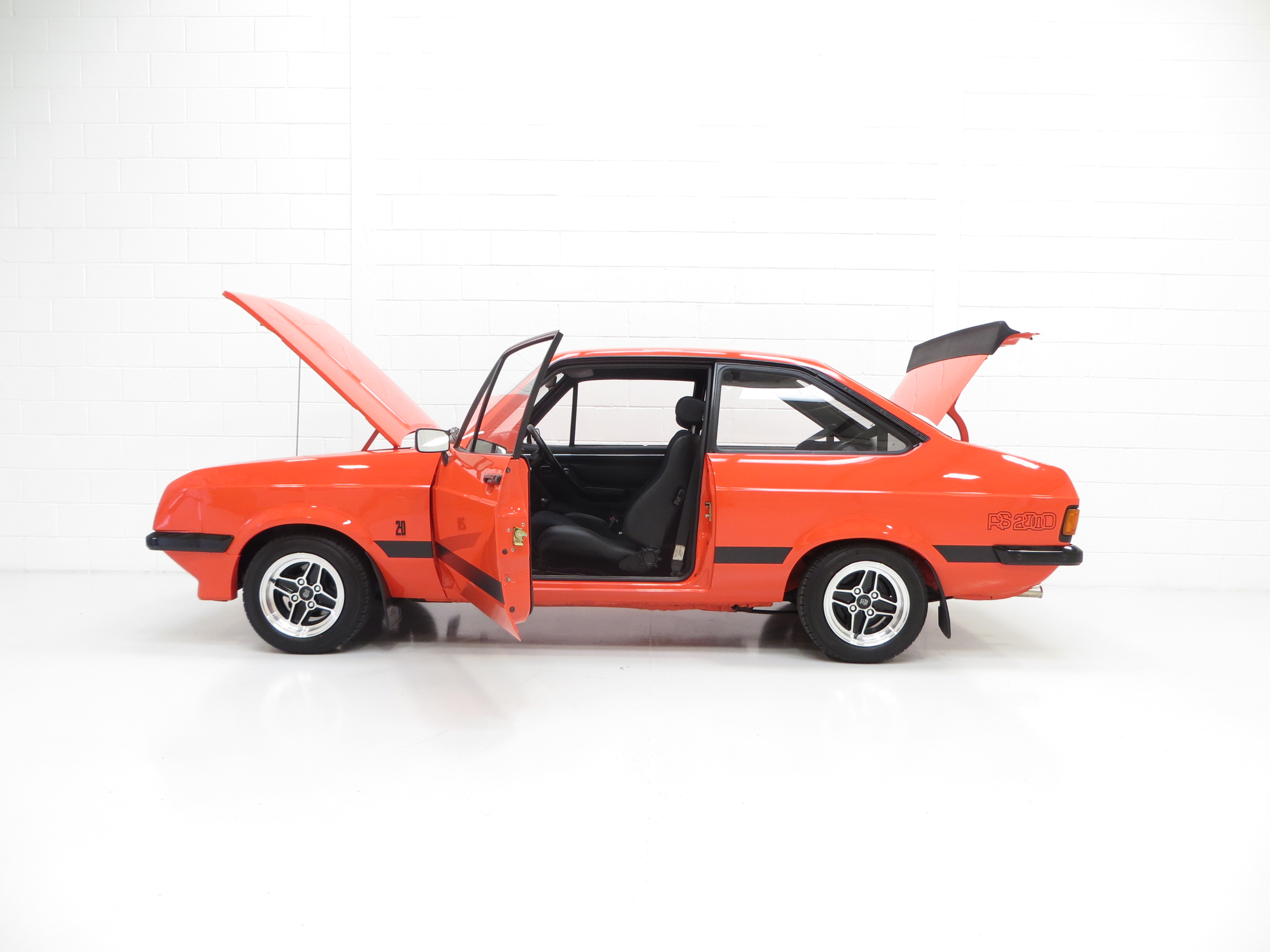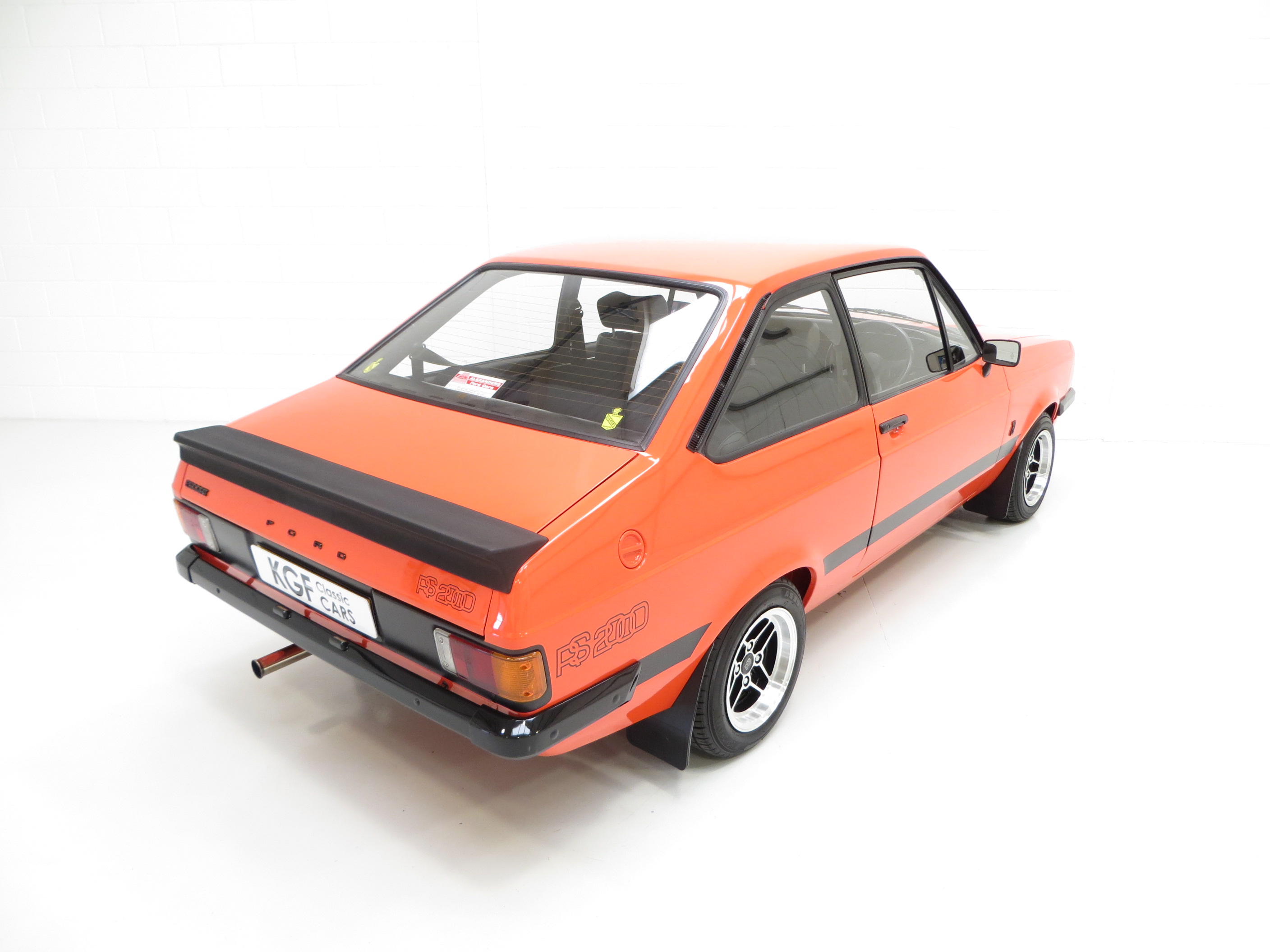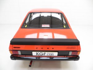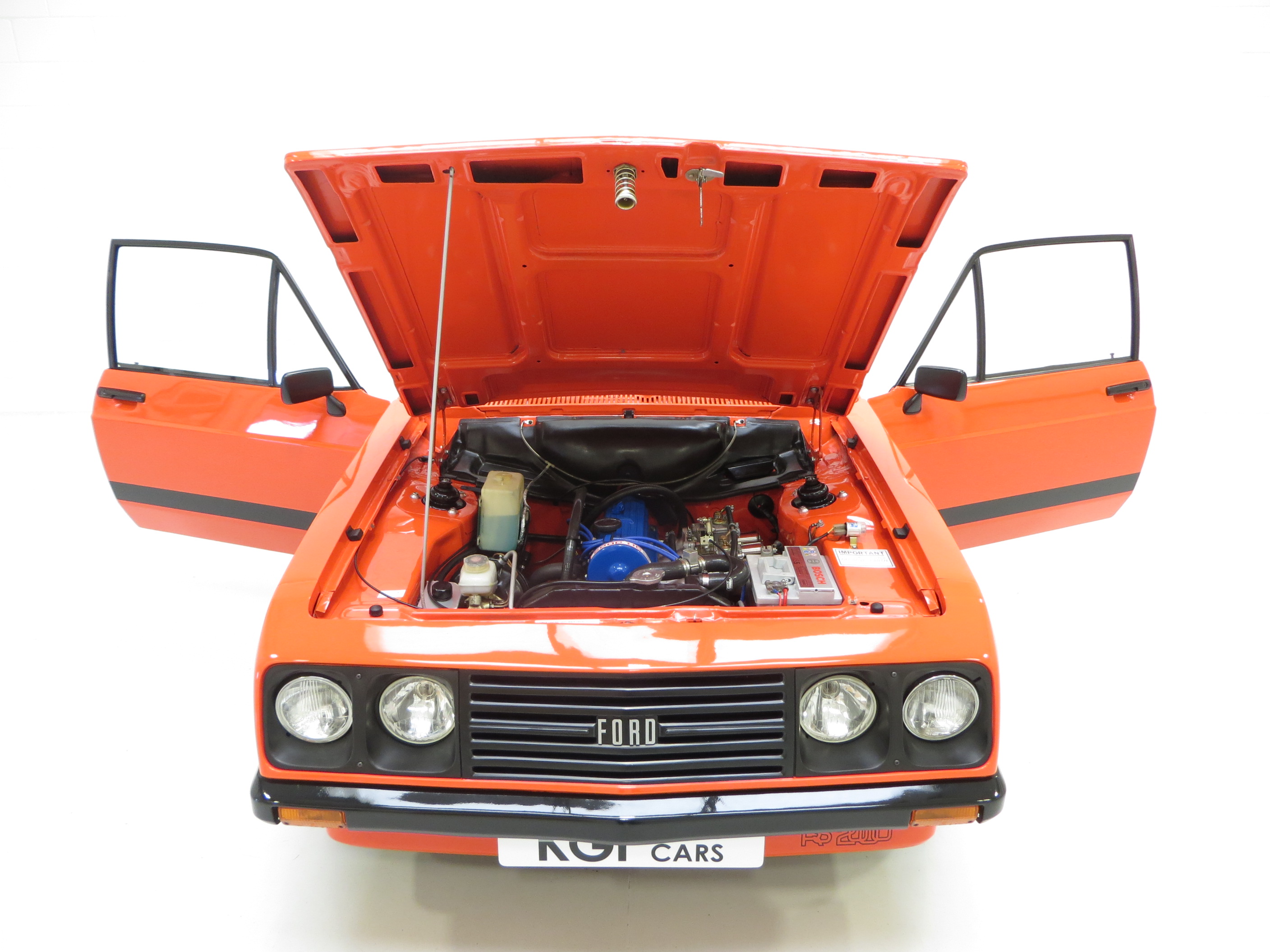 This very early March 1976 example represents an extremely rare car with its non-sunroof and non-vinyl roof configuration. Finished in the rare original colour of Carnival Red (code D), the vibrant paintwork is simply stunning. Only very close scrutiny from the perfectionist will reveal minimal and miniscule imperfections to the finish, entirely insignificant. The Ziebart plugged drill holes remain having served their purpose of preserving the cars structural integrity. Correct early RS2000 exterior features include the broad side stripe, ‘pre blue oval’ FORD lettering to the grille and bootlid and wing badges to denote 2.0 engine size. A program of underside and engine compartment detailing add to the exceptional appeal of this beautiful car and firmly upholds its show car credentials. All trim sections and decals are perfect and just as Ford intended, and the supplying Ford dealer rear screen sticker remains in place. Truly pristine and very very special.