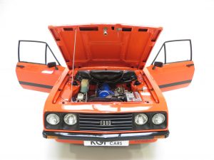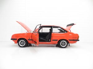 Launched in January 1976, the Mk2 Escort RS2000 featured the highly distinctive ‘droop snoot’ nose cone housing the four Cibie quartz halogen headlamps. The early cars at the time of launch were only available with one specification and one trim colour option, black. Known as the Broadstripe due to the wider side coachline designed to replicate a continuation of the bumpers, the basic specification of these early cars had all the options which were later to make up the `Custom Pack`. In July 1976 the Broadstripe was dropped for a smaller twin coachline and in 1978 the introduction of two models, the Base and Custom Packs offered a wider choice for Ford customers.