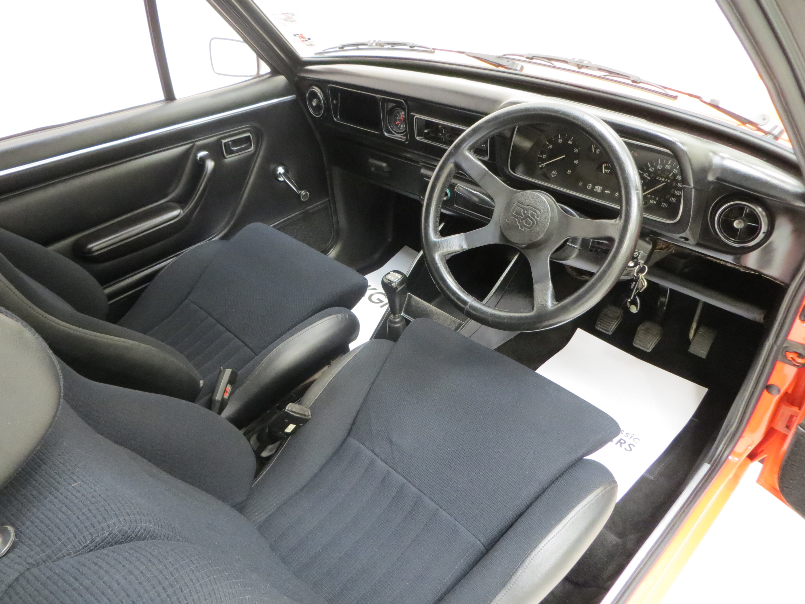 The absolute wow factor certainly continues to the interior of this RS2000. Correct standard Black (code A8) Scheel roll top seats preceded the widely used Fishnets Recaros, and these fitments are pristine. Further features of the pre Custom/Base cars include the black headlining, tinted glass, Ford analogue clock, glovebox and white needle instruments, all items present and correct! The perfect fascia and dash top house fully functioning gauges and equipment including the two speed fan and clock. The carpets, door cards and black headlining are all unmarked. A spotlessly clean boot displays the rubber strap holding the spare wheel and the original jack inside the Ford hessian bag is present. An alarm has been fitted. Beautifully preserved and wonderfully true to the Ford RS vision, simply superb!