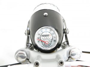 Stainless steel front and rear mudguards, Ceriani folks, toolbox, anti-slip half suede seat, headlamp with guard, cold start plunger, rear tail light with reflector, electromagnetic horn, engine cut-out button, fuel valve, Huret speedometer, steering lock.