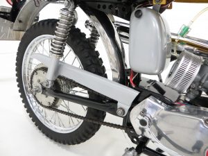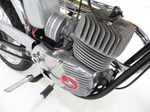 The Garelli two-stroke 49cc air cooled engine is quoted producing 6.5bhp and capable of speeds on the flat of 60mph making it one of the most powerful and fastest sports mopeds of its time. All components are fully detailed to show standard and the Dell’Orto carburettor with cold start plunger remains fitted. The bike employs a four speed foot change transmission by chain drive. Incredibly it is still furnished with two sprockets mounted side by side on the rear hub to provide a ‘street’ gear ratio and ‘trial’ gear ratio.