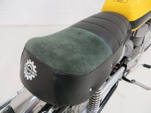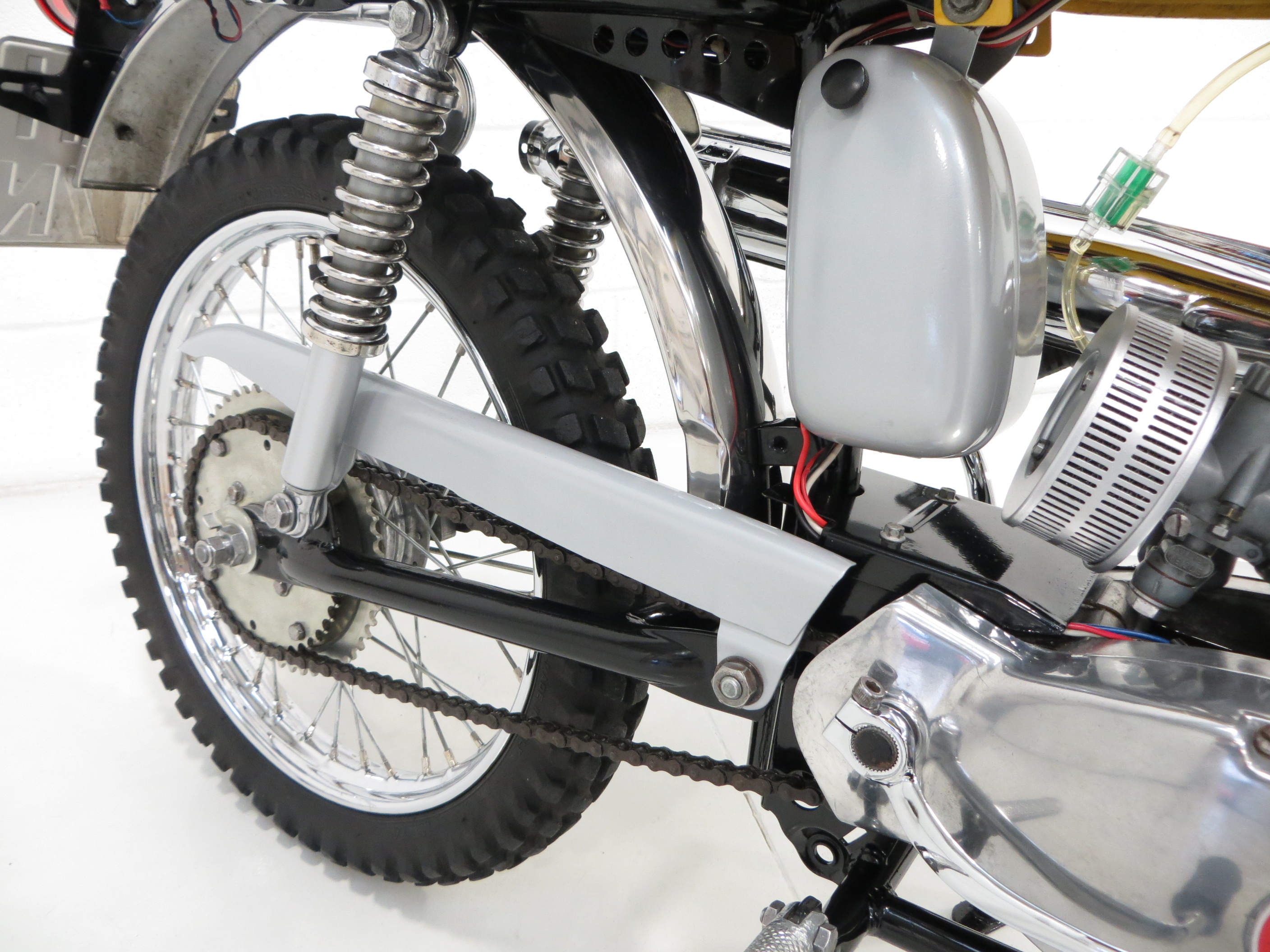 Factory spoked wheels display a mirror chrome finish thanks to being fully rebuilt by S.Phillips Motorcycle and Car Wire Wheel Builders. 2.50-17 rear and 2.75 -19 knobbly tyres are fitted. Drum brakes front and rear provide adequate braking.