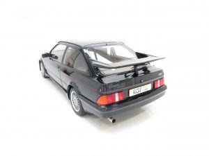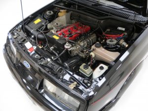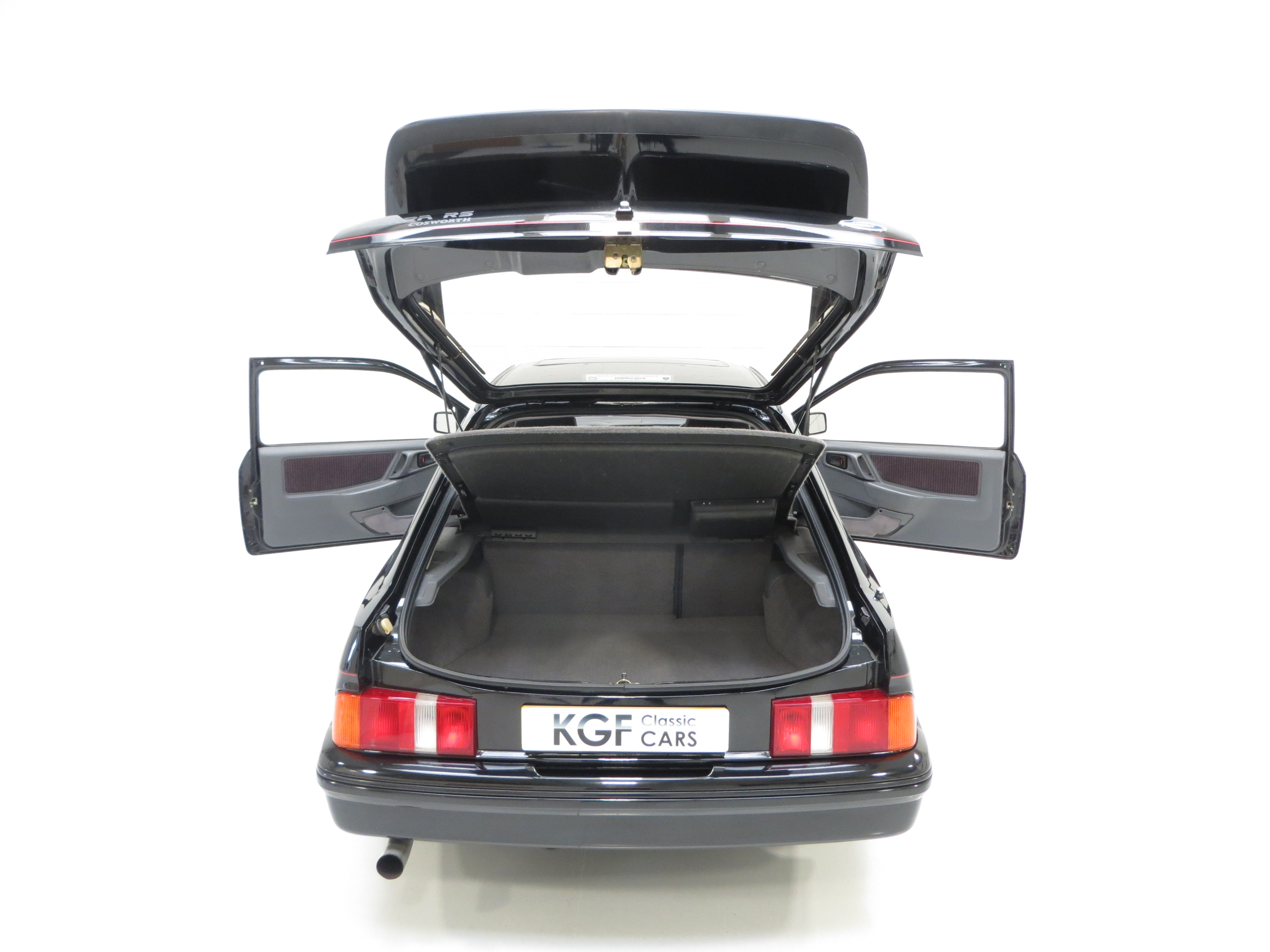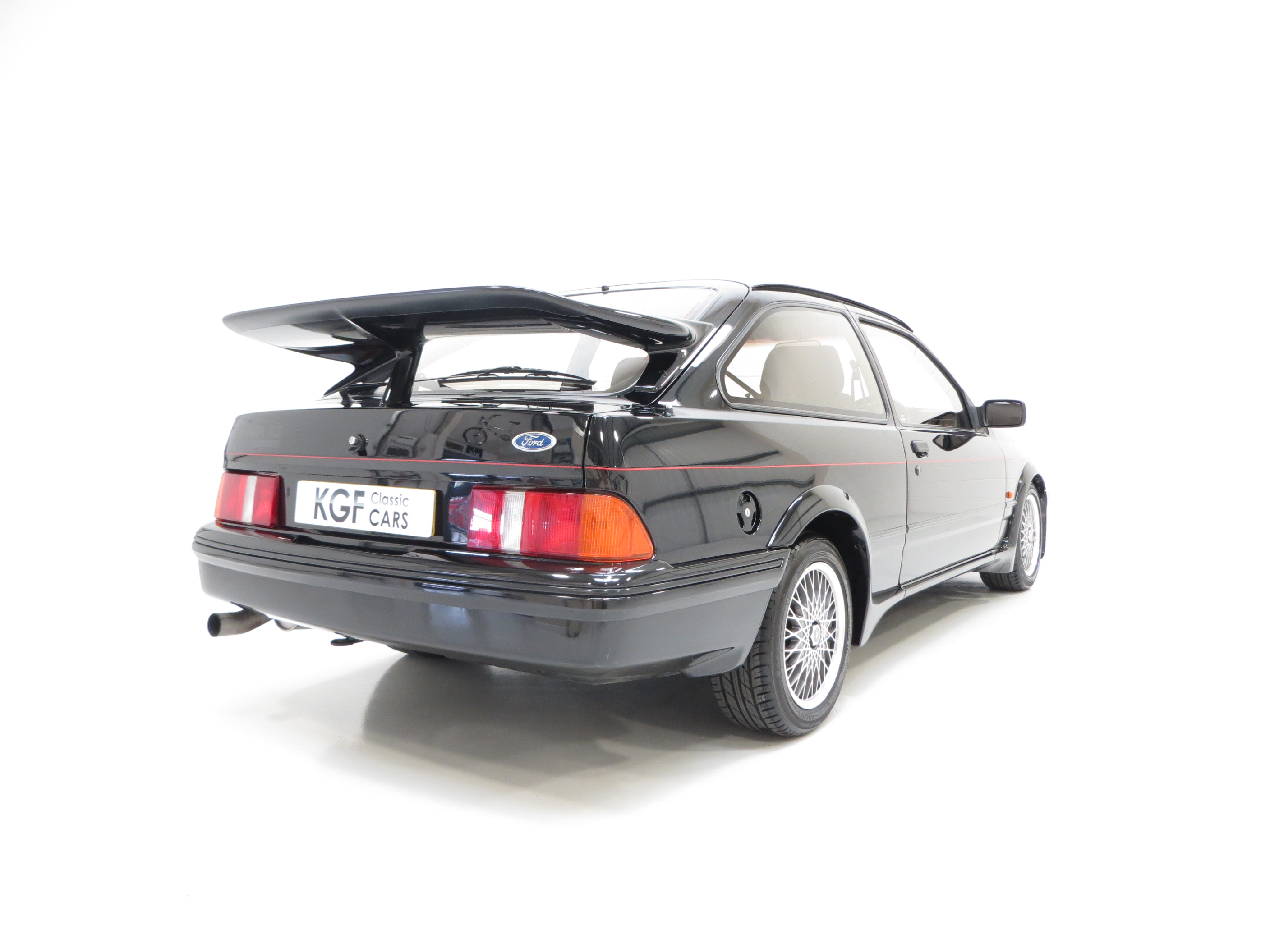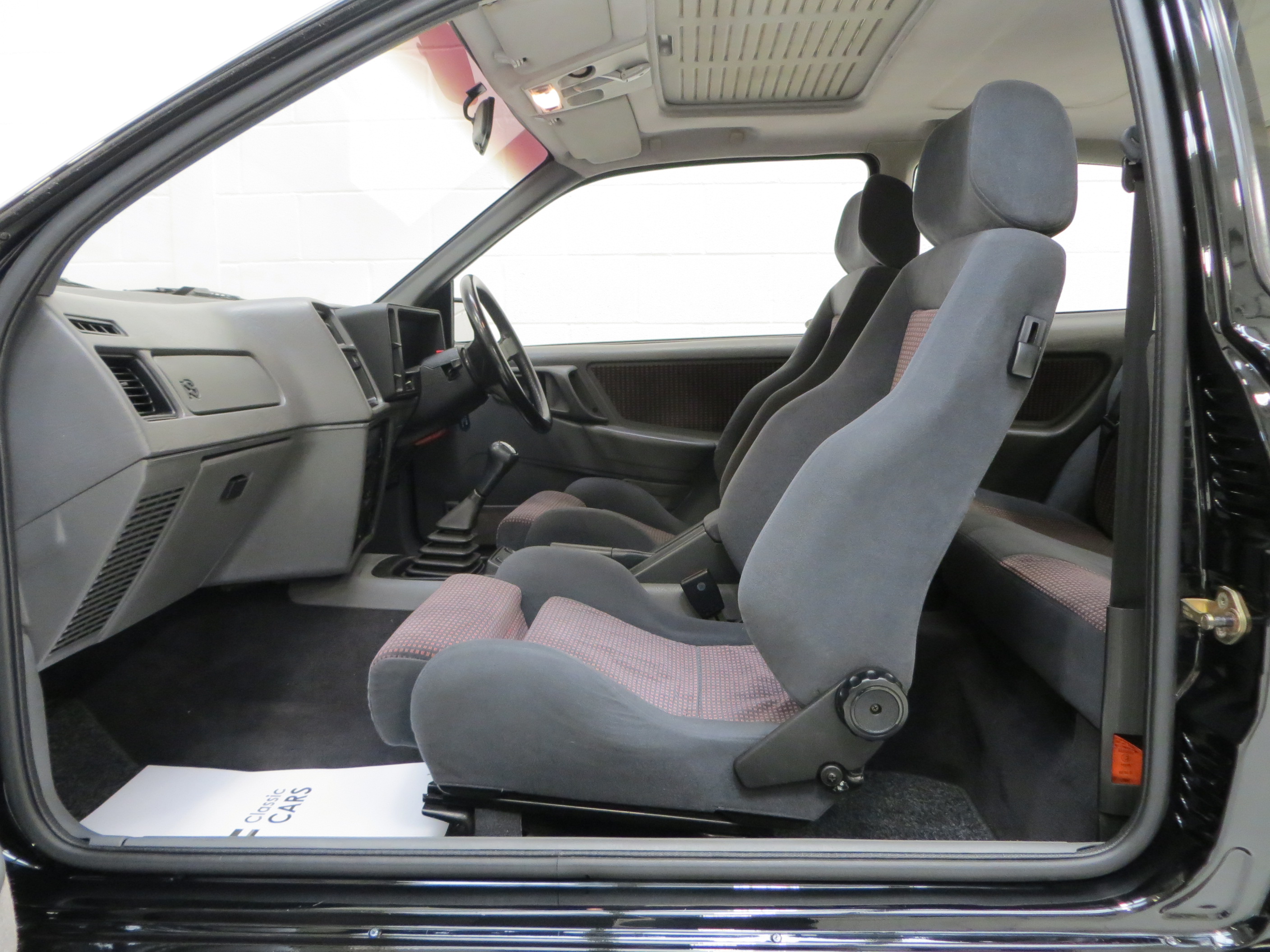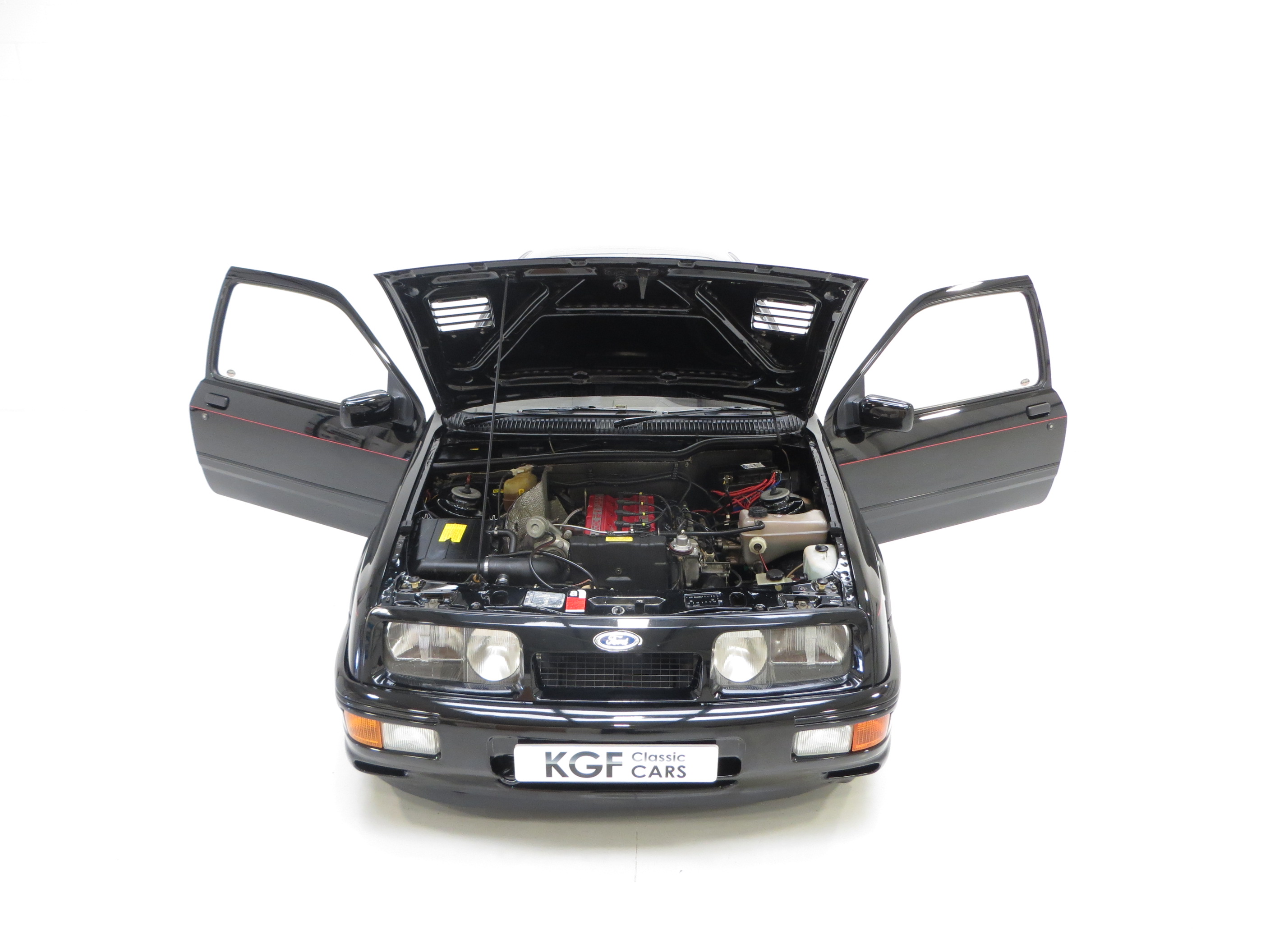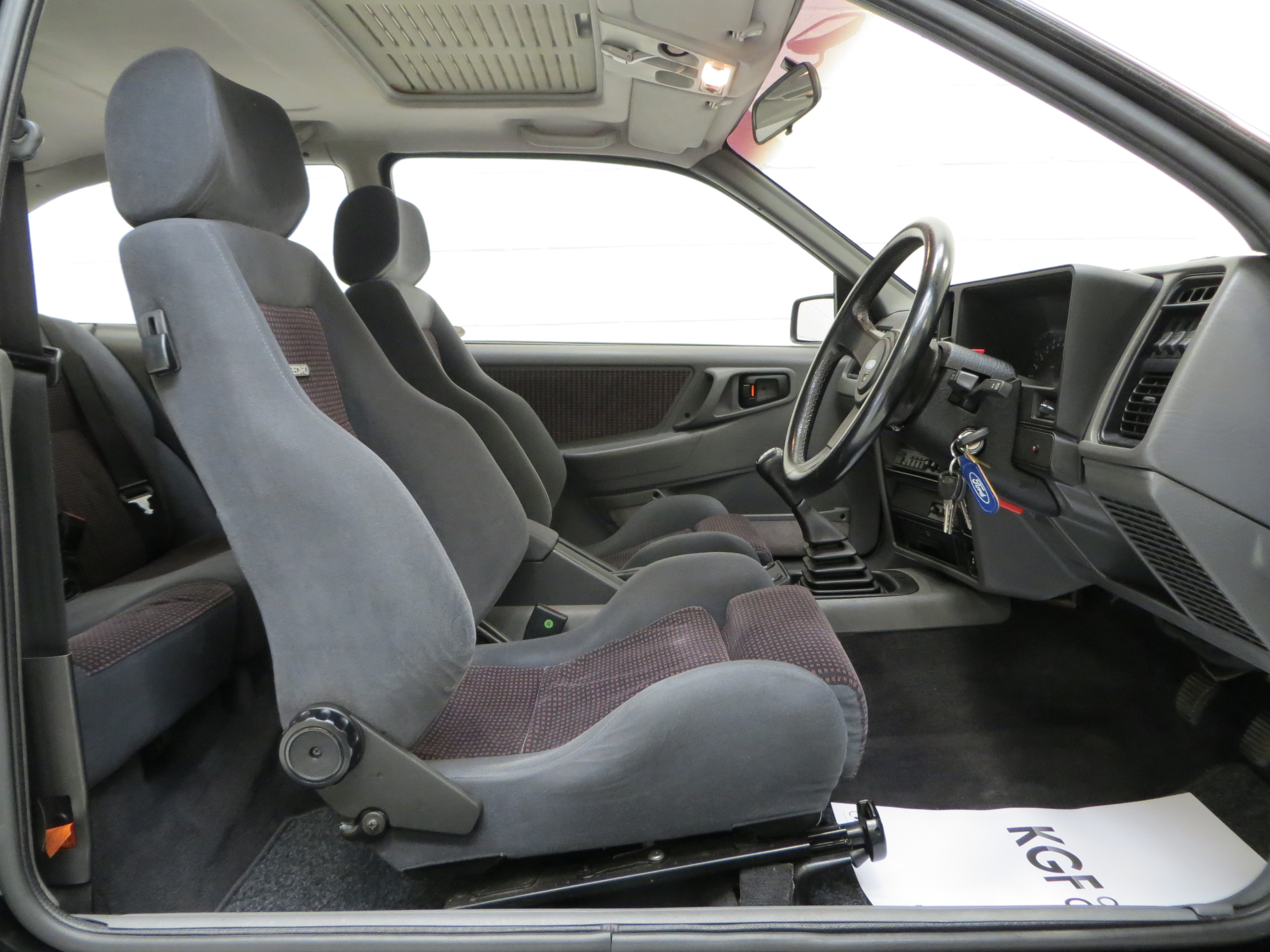 Bodyside mouldings, integral front air dam, colour coded door mirrors, electrically adjustable and heated door mirrors, colour coded lockable fuel filler cap, bonnet cooling vents, halogen headlamps, integral front driving lamps, colour coded bumpers with front moulded overriders, single plane rear wing spoiler, tinted glass all round, tailgate wash/wipe, laminated windscreen, extended centre console, cigar lighter, quartz digital clock, fascia light dimmer, leather gearknob, leather three spoke sports steering wheel, 3-speed heater fan , cassette storage, electronic sound system (model ECU2) with power amplifier, electric aerial, Recaro Sports front seats, split folding rear seats, tilt and slide sunroof, tachometer with turbo boost gauge, trip recorder, anti-locking brake system with failure warning light, electric front windows. Factory options; Ford Black paintwork.