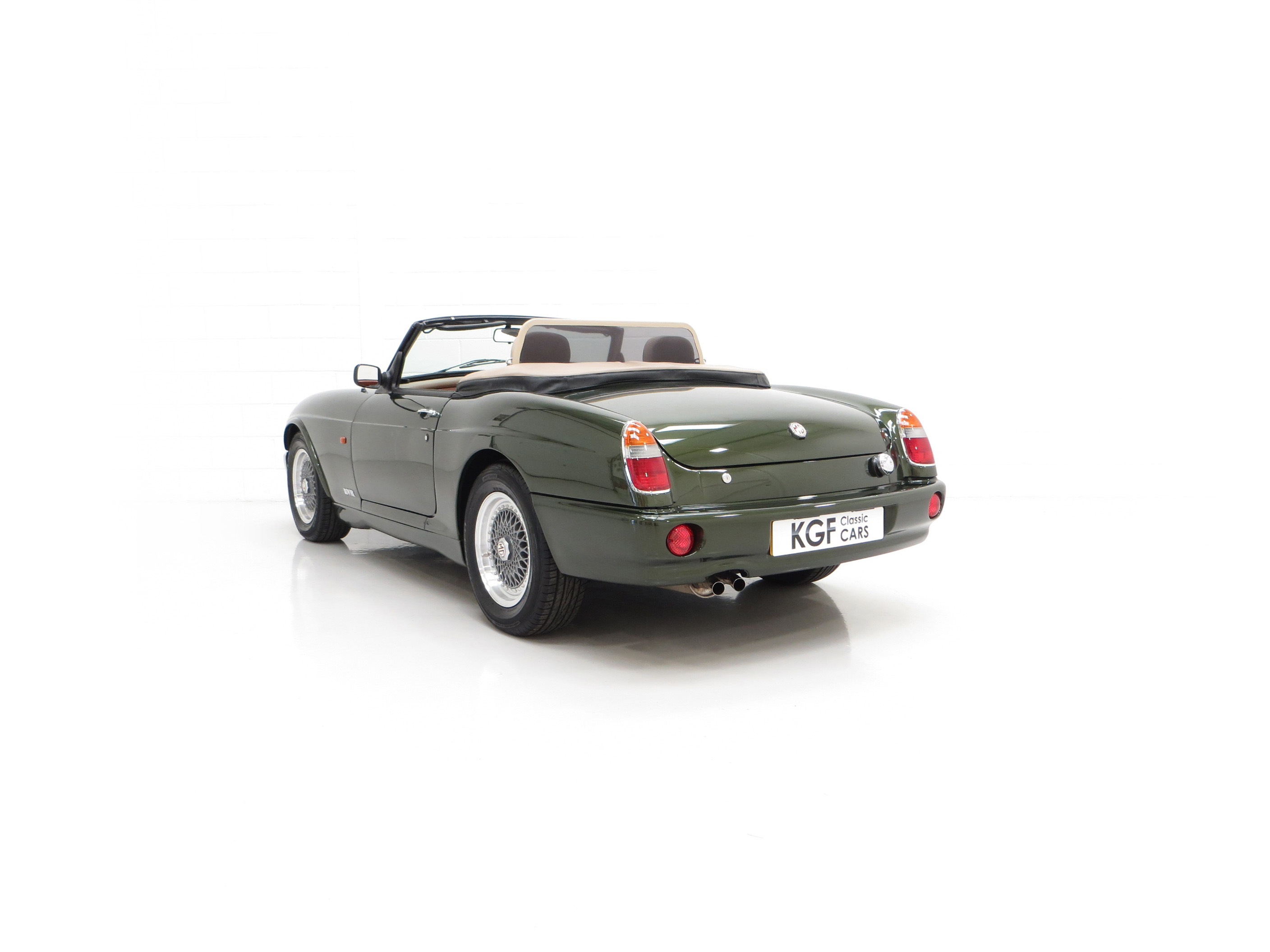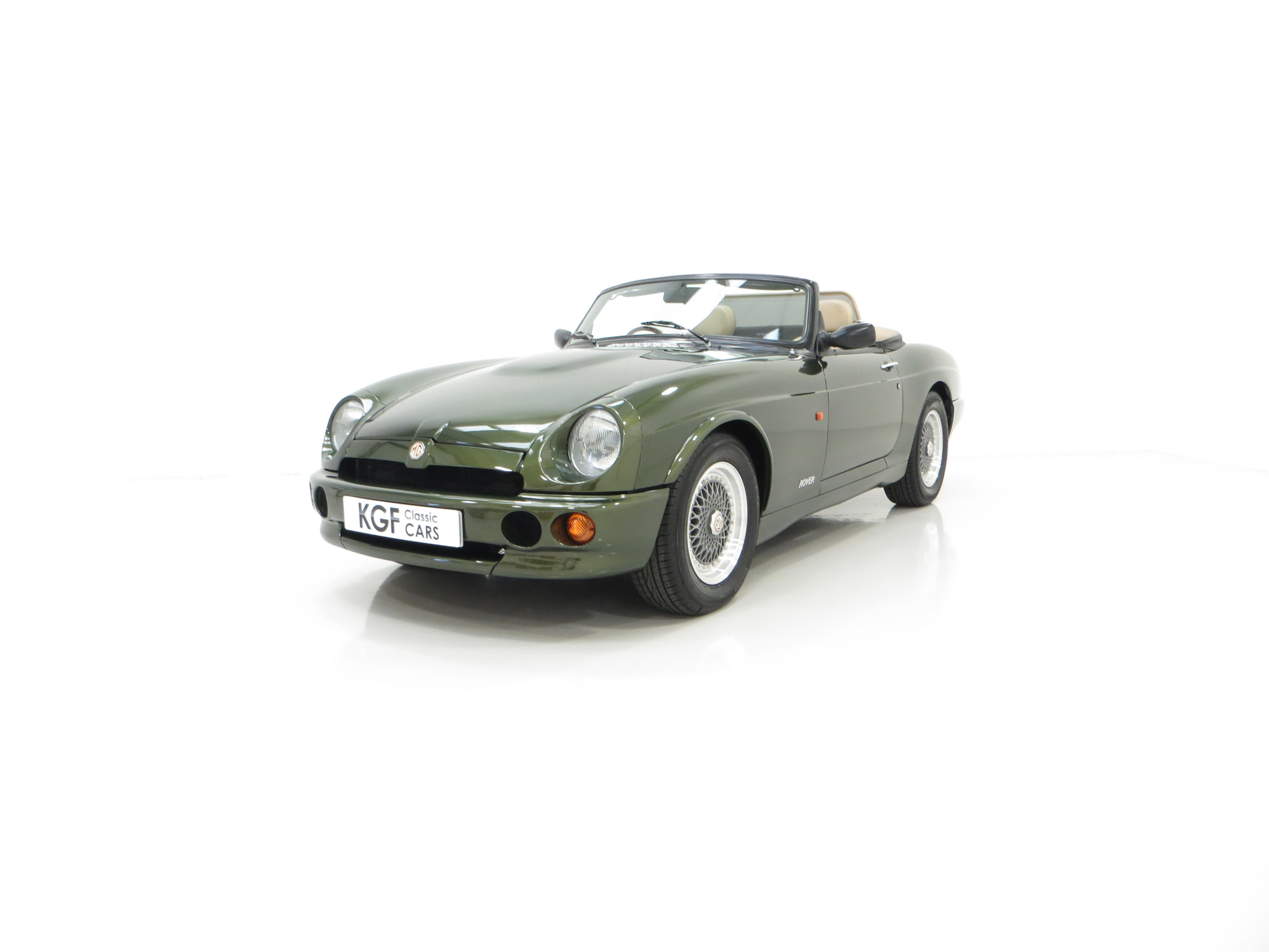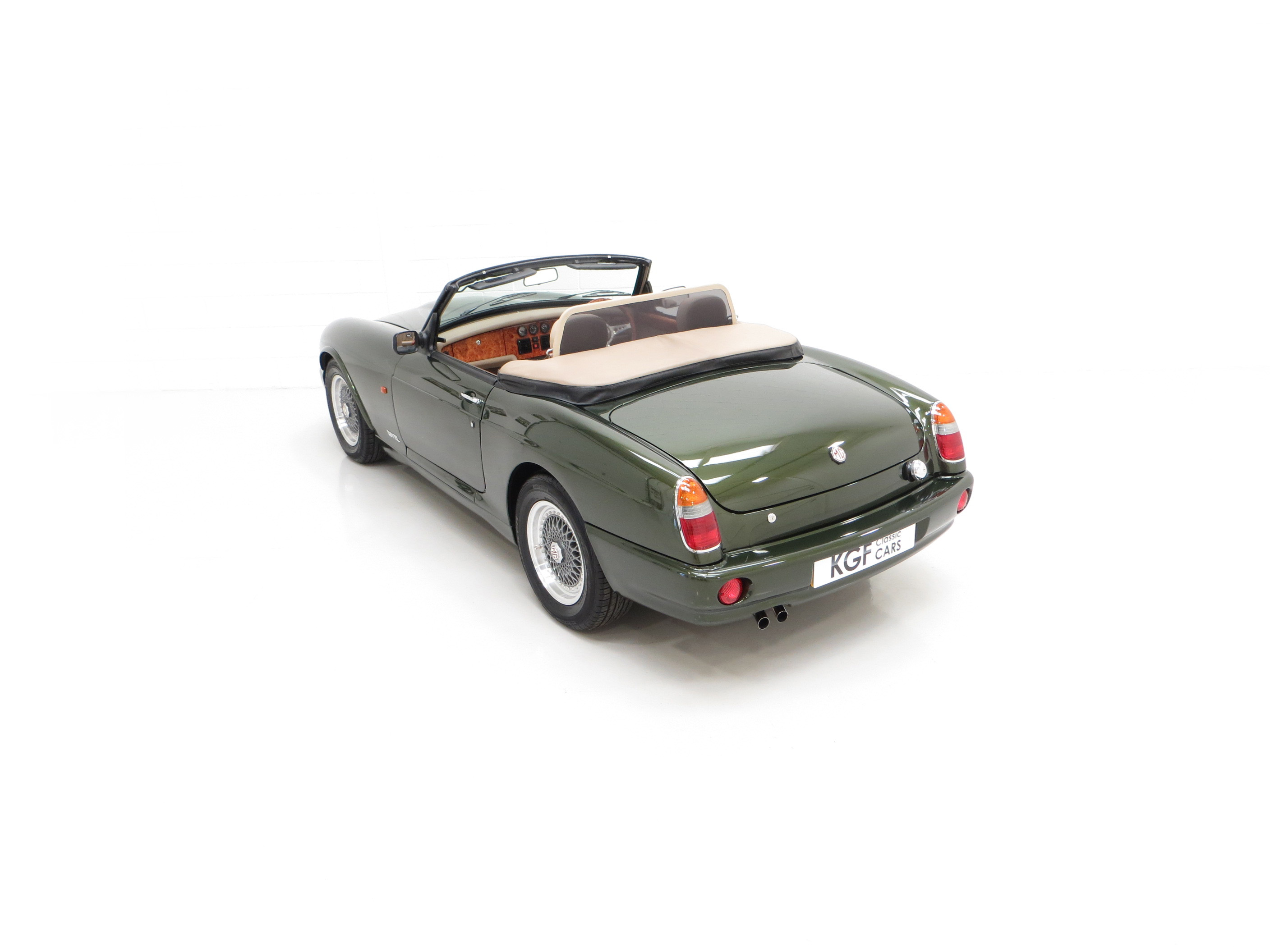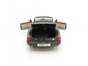 An appealing, curvaceous, wasp-waisted style immediately recognisable to MG aficionados is finished in optional pearlescent Woodcote Green, (Code HPE) at a cost of £750 when new. A stunning deep gloss finish has been preserved by the two fastidious UK owners since the car arrived from Japan in 1998. The correct panels produced by Abbey Panels are virtually unmarked other than a tiny scratch to the nearside front wing. The original factory fitted soft top made by Tickford is pristine and the rear screen perfectly clear. The rear tonneau is present and a very well-designed bespoke wind deflector is neatly fitted and framed in matching beige leather. The famous octagonal MG badging is bright and unmarked and all chrome brightwork has a mirror finish. An enduring British motoring classic with this example being difficult to fault.