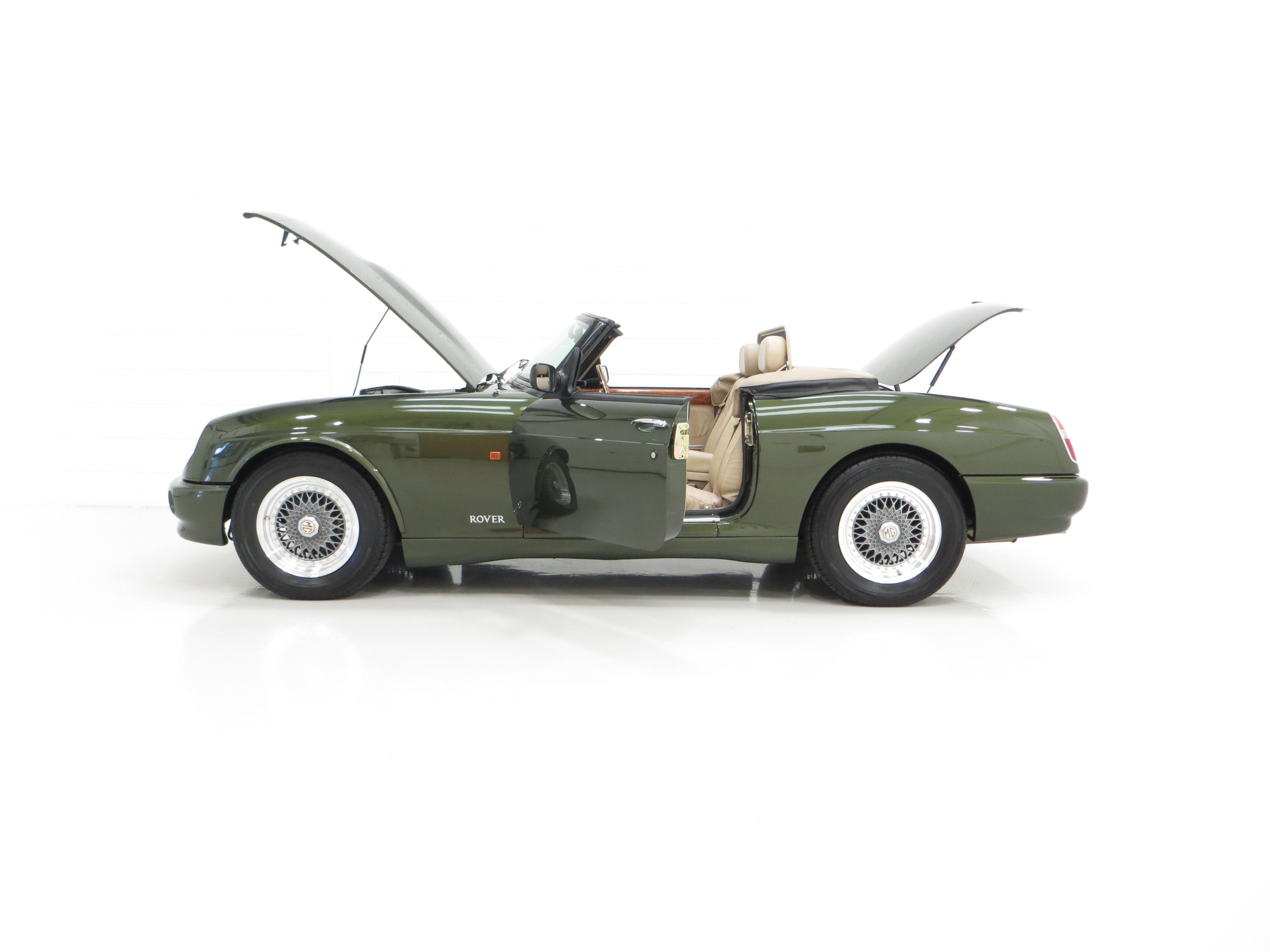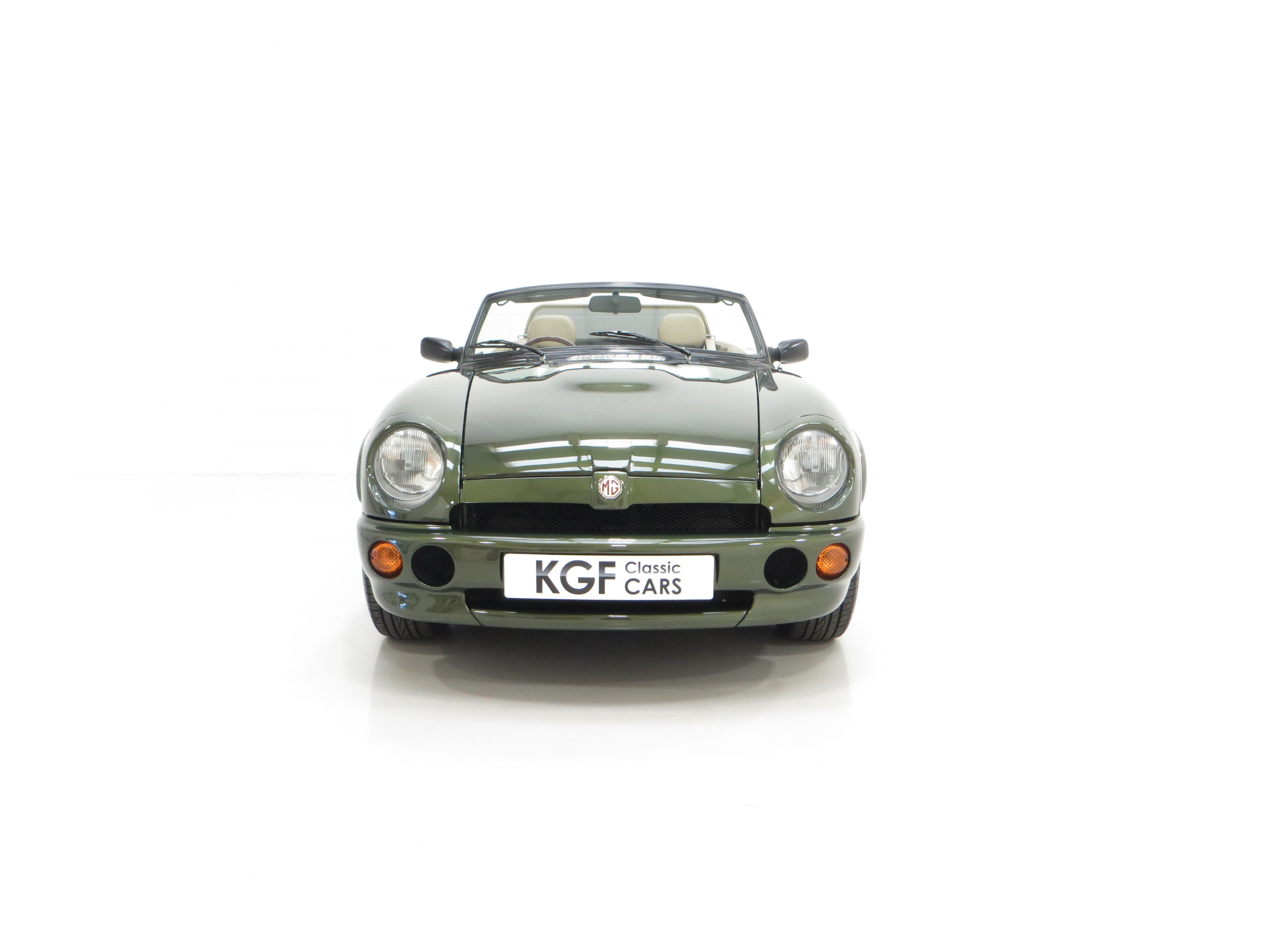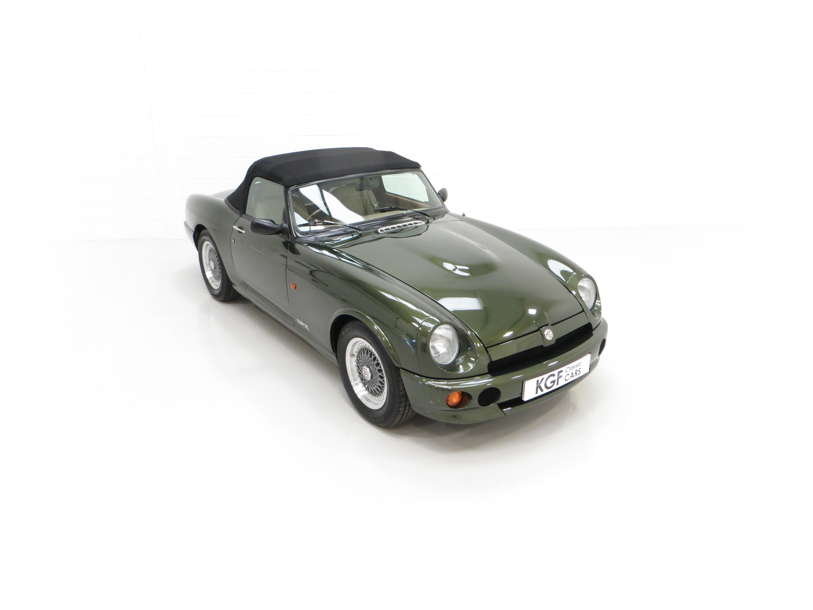 An appealing, curvaceous, wasp-waisted style immediately recognisable to MG aficionados is finished in optional pearlescent Woodcote Green, (Code HPE) at a cost of £750 when new. A stunning deep gloss finish has been preserved by the two fastidious UK owners since the car arrived from Japan in 1998. The correct panels produced by Abbey Panels are virtually unmarked other than a tiny scratch to the nearside front wing. The original factory fitted soft top made by Tickford is pristine and the rear screen perfectly clear. The rear tonneau is present and a very well-designed bespoke wind deflector is neatly fitted and framed in matching beige leather. The famous octagonal MG badging is bright and unmarked and all chrome brightwork has a mirror finish. An enduring British motoring classic with this example being difficult to fault.