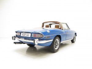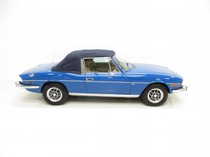 The stunning elegant lines of the Michelotti styled Triumph Stag are unmistakable, with this example being finished in factory specified Tahiti Blue (code 146). The paintwork showcases a deep glossy shine and uniform finish to accentuate the handsome shape immensely. Minor paintwork imperfections and evidence of remedial cosmetic upkeep are traceable upon scrutiny but do not offend. The underside is structurally excellent with all panels completely free from corrosion. The bonnet has a few light dings. All exterior chrome brightwork is perfect and the original badge work and decals are intact. A spotlessly clean engine bay enables bonnet up showcasing. The factory optional hard top is in excellent order as is the tailored weather proof tonneau set, although the hard top interior lining is showing minor signs of age. A pristine quality replacement mohair hood in deep blue completes the all-weather package. A fantastic example of this gorgeous 2+2 Triumph Roadster.