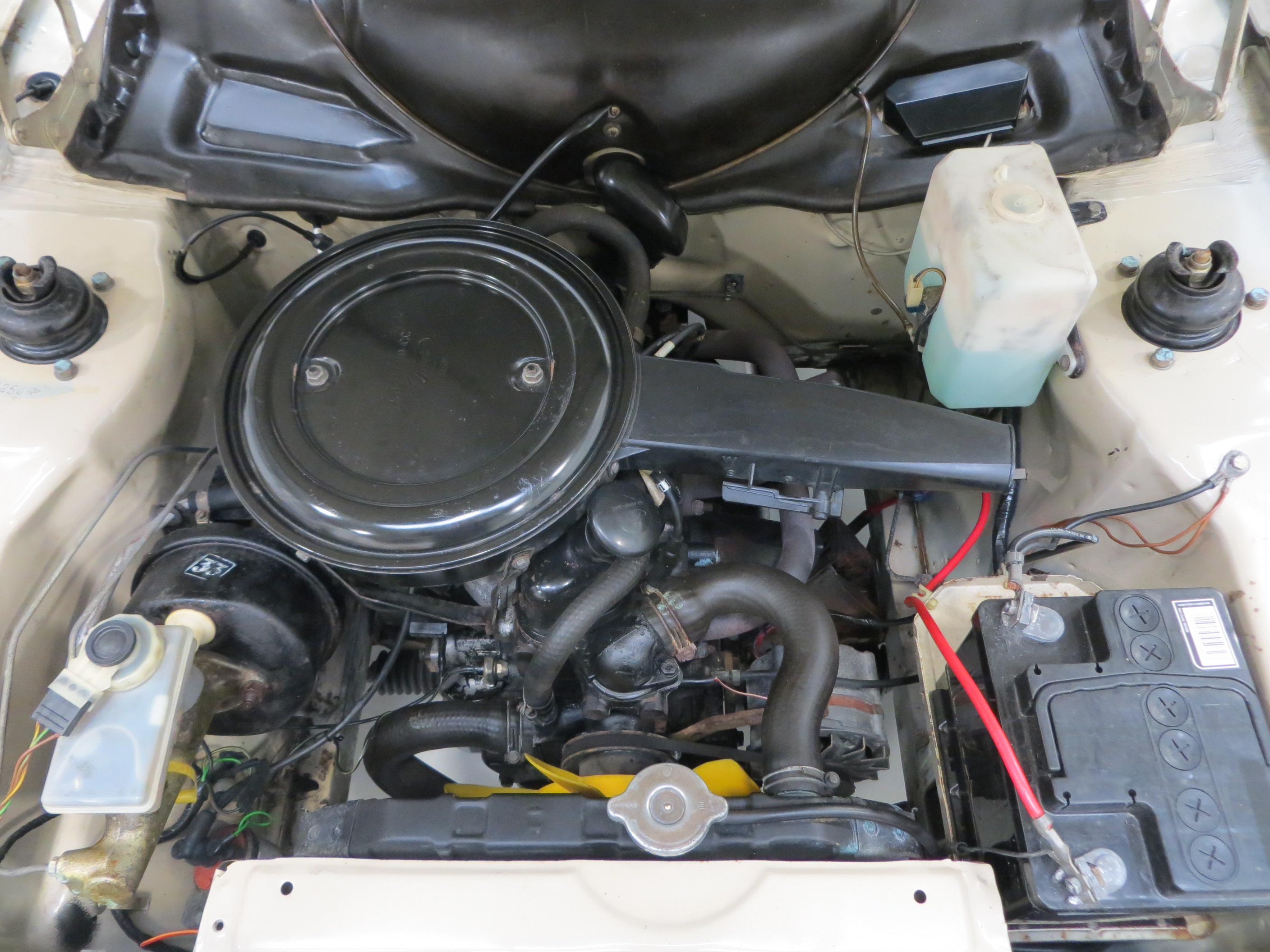 Standard 13” sports road wheels are unrestored with the black infills and stamped part numbers prominent. All four bright embellishers as fitted to the Ghia models remain and have light scratches, more so to the front items. Five 155/80 R13 tyres have masses of tread remaining including the factory Goodyear tyre fitted to the spare wheel. Hydraulic dual line brakes incorporating front discs and rear drums operate well.