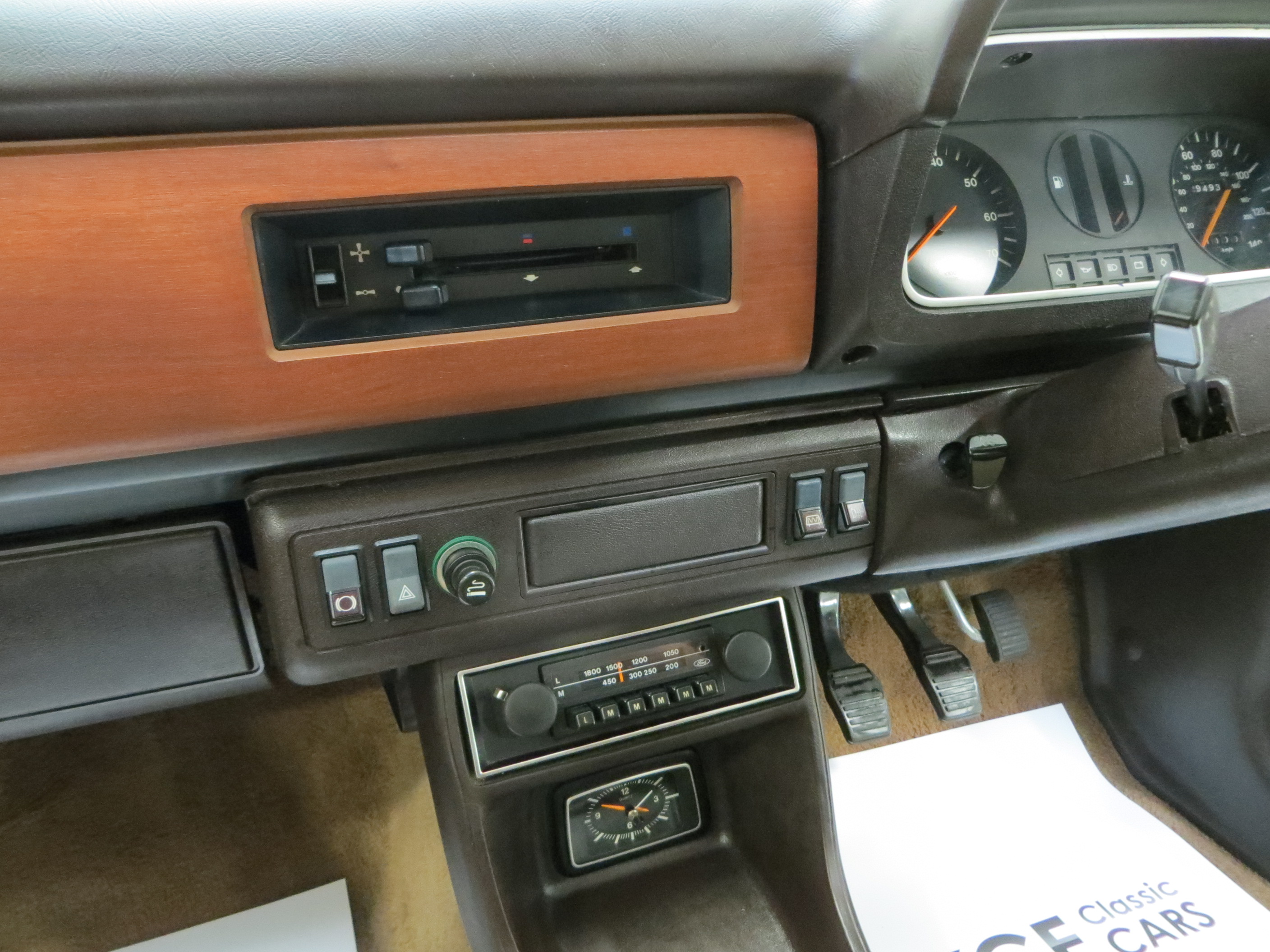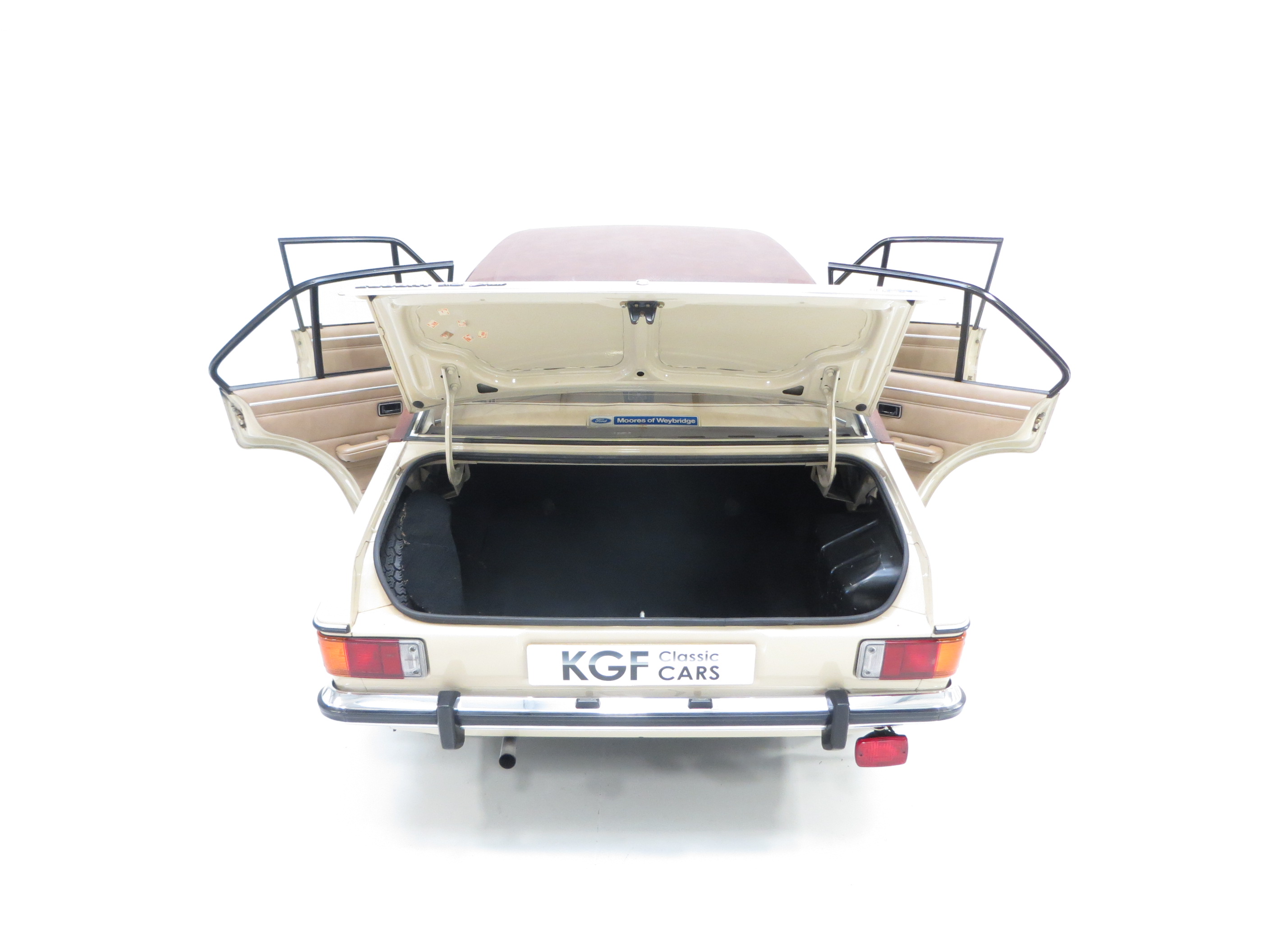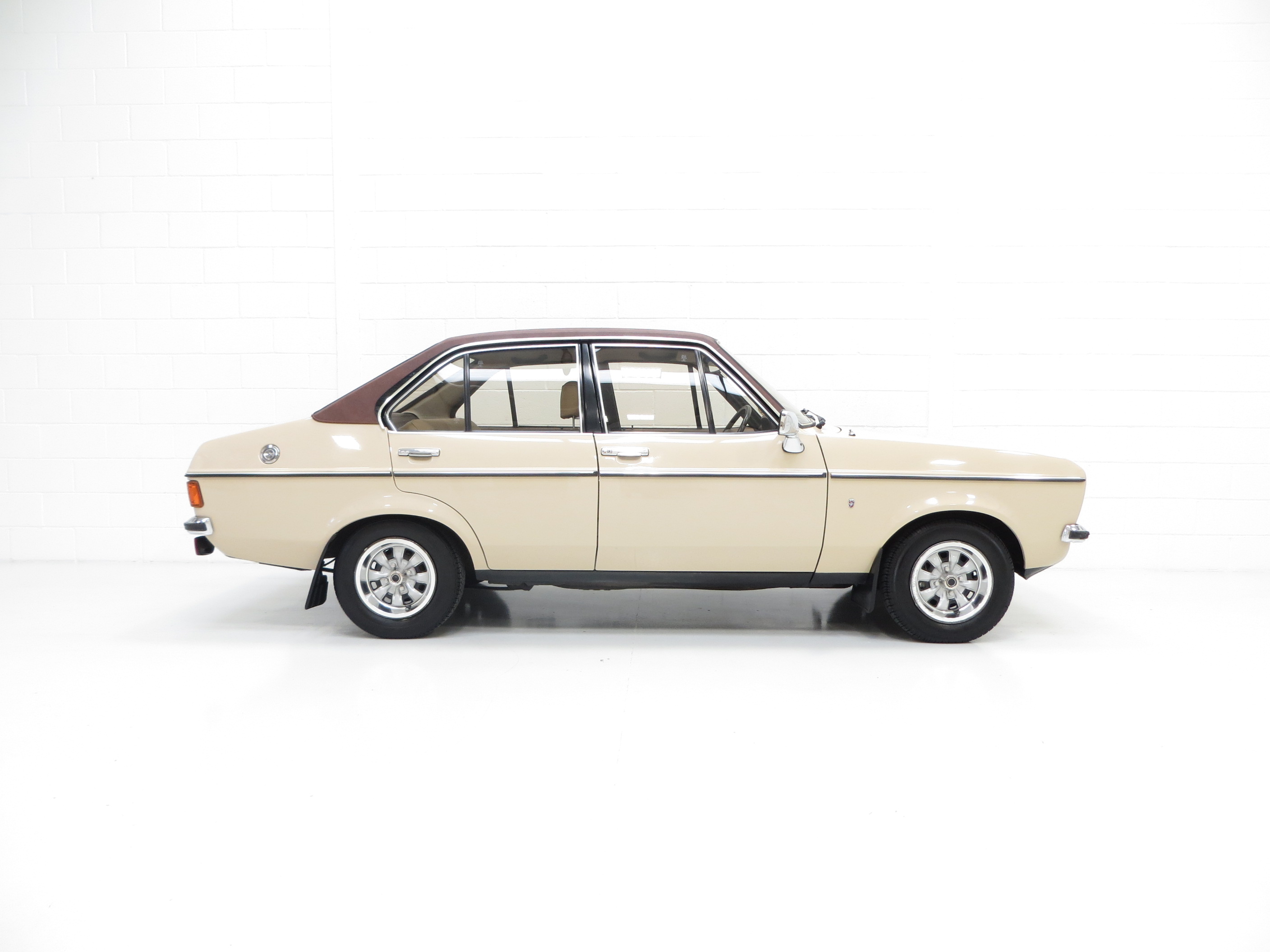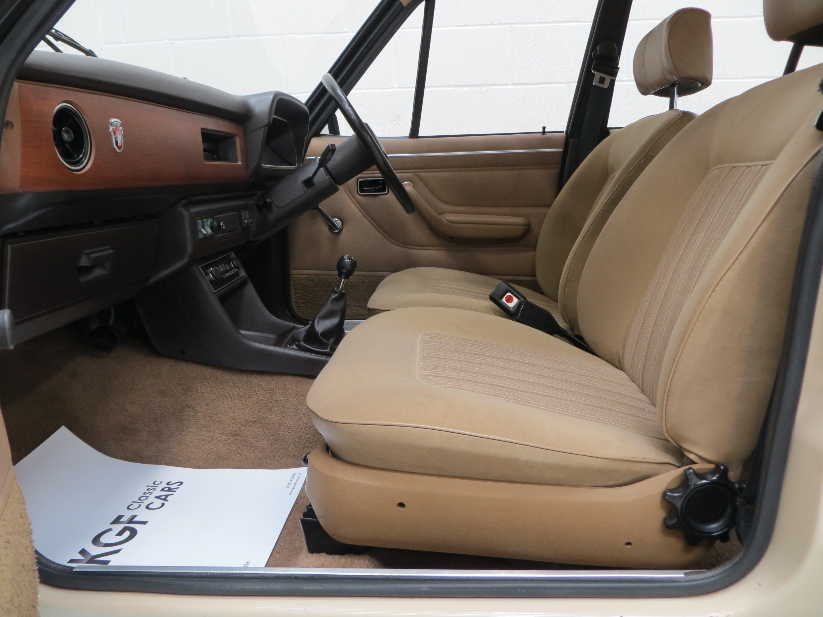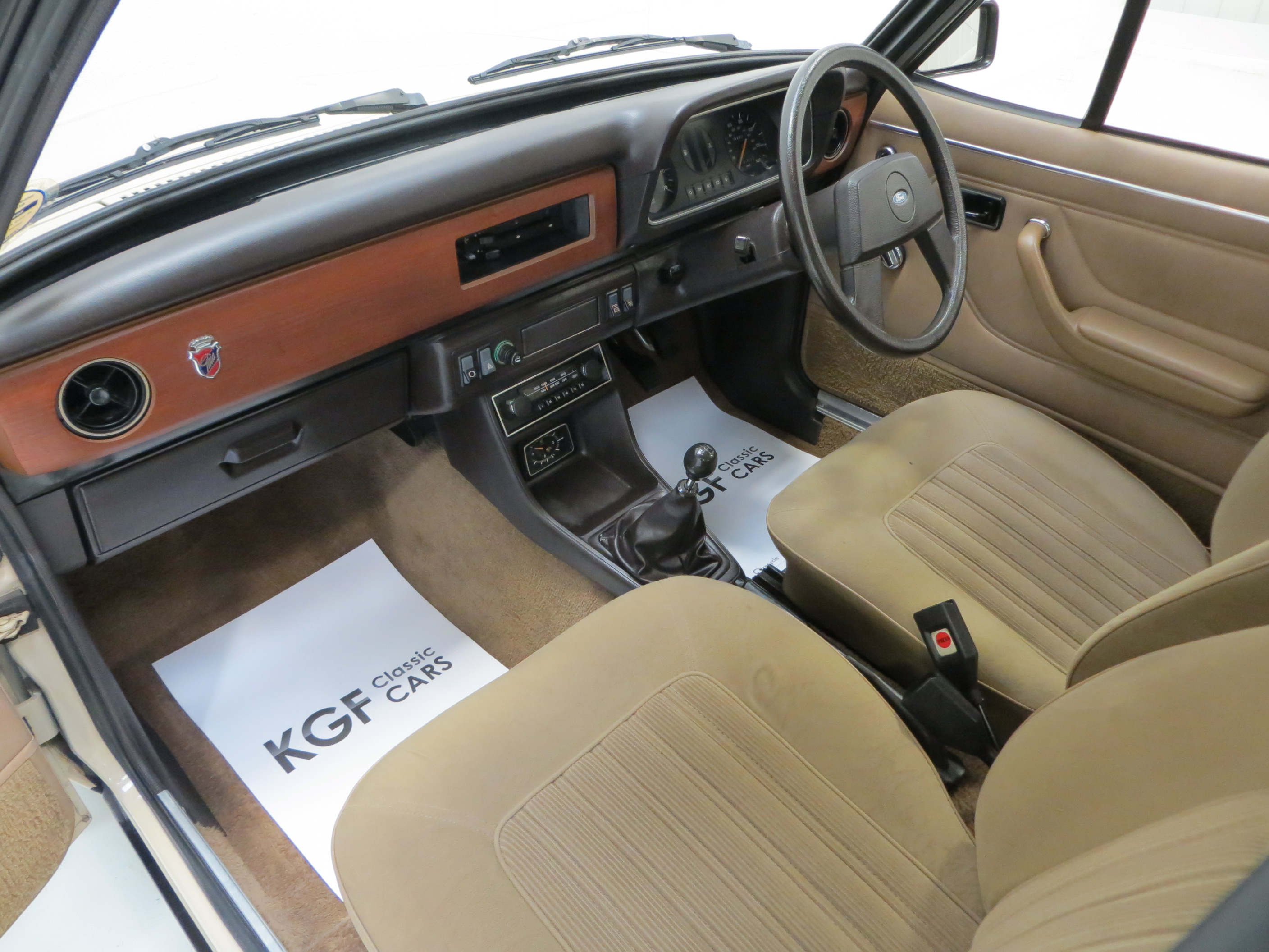 Rectangular halogen headlamps, safety glass all round, anti-burst locks, bright door frame and window mouldings, vinyl roof, bright badging and door handles, bright driver’s door mirror, bodyside moulding, protective bumper inserts with overriders, laminated windscreen, reclining front seats, seat valances, two-spoke soft feel steering wheel, real wood veneer fascia, Ghia badging, choke control, safety styled door handles and window winders, aluminium ribbed scuff plates, heated rear window, hazard warning flashers, padded sun visors, two-speed heater and demister, inertia reel front seat belts, aeroflow ventilation with eye ball vents. Dealer Options; Mud flaps.