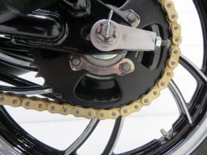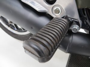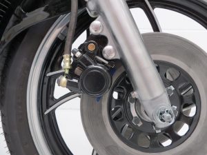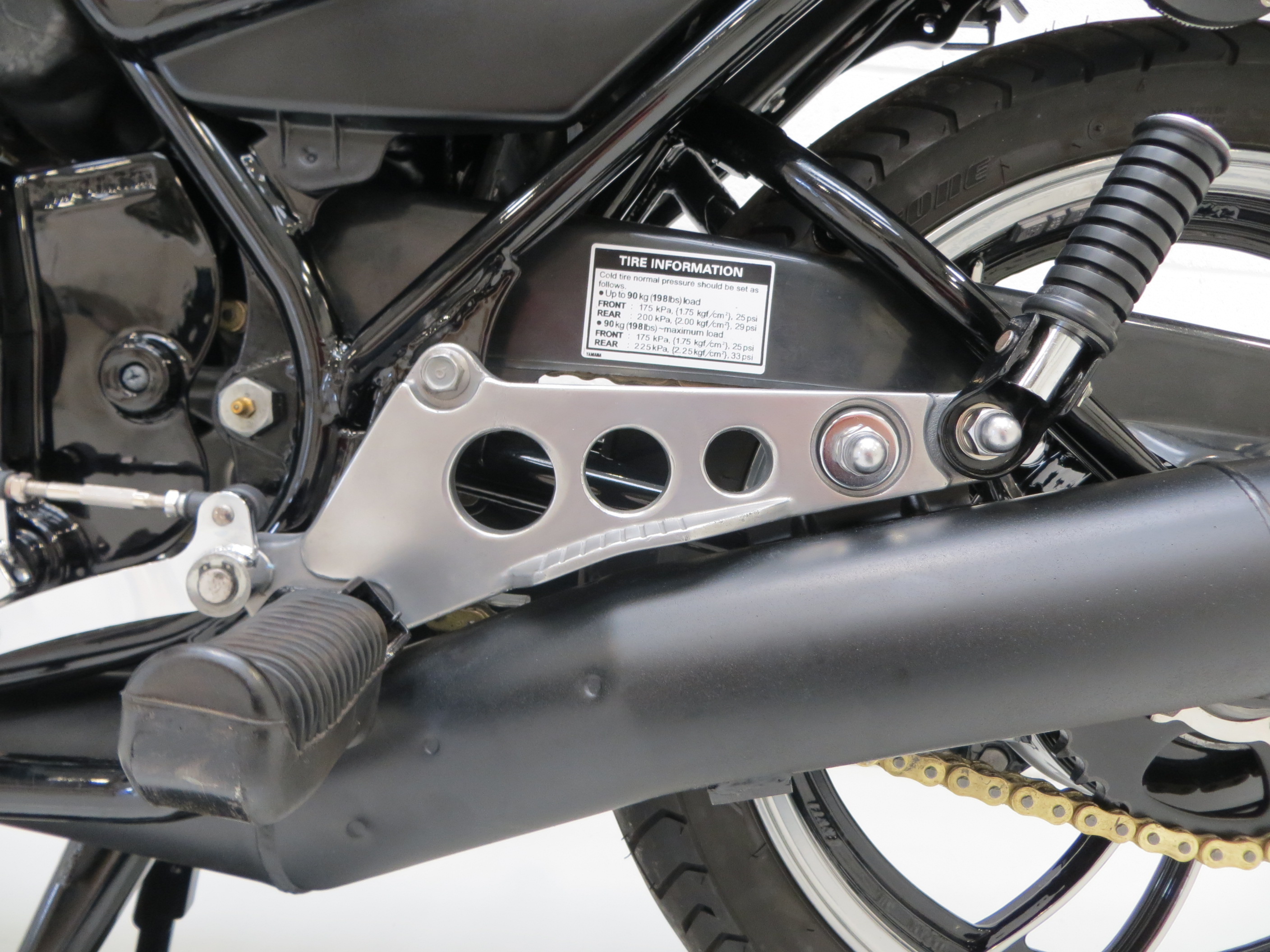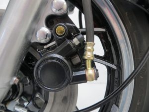 The RD350LC is fitted with stylish cast-alloy italic wheels which are powder coated and presented in fabulous undamaged condition. Bridgestone Battlax 90/90-18 front and 110/80-18 rear tyres are fitted still with new pimples! Dual 267mm discs with single piston calipers and a drum at the rear perform correctly.
