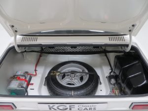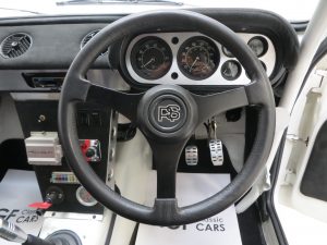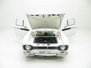 The interior of this vehicle has not escaped the painstaking program of refurbishment, starting with the high quality front sports seats with Clubman harness offering both comfort and steadfast support upon even the wildest cornering! Fabulously appointed aluminium components surround the driver and contrast beautifully with the shark grey alcantara trim which even extends to the padded dash top, headlining and door cards. The original vinyl rear bench seat is in excellent condition with no rips or tears and a pristine RS three spoke sports steering wheel is present. The central lightweight aluminium control panel houses safety cut-off switches and a push-button start but the extra fuel pressure gauge and rev counter is inoperative. A Safety Devices roll-cage offers both strength and security and the boot area has a correctly positioned battery housed as per the earlier Mexico’s manufactured along with the spare wheel. Functional, fun and very Ford!
