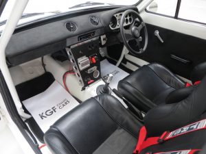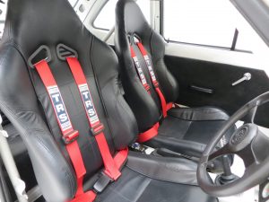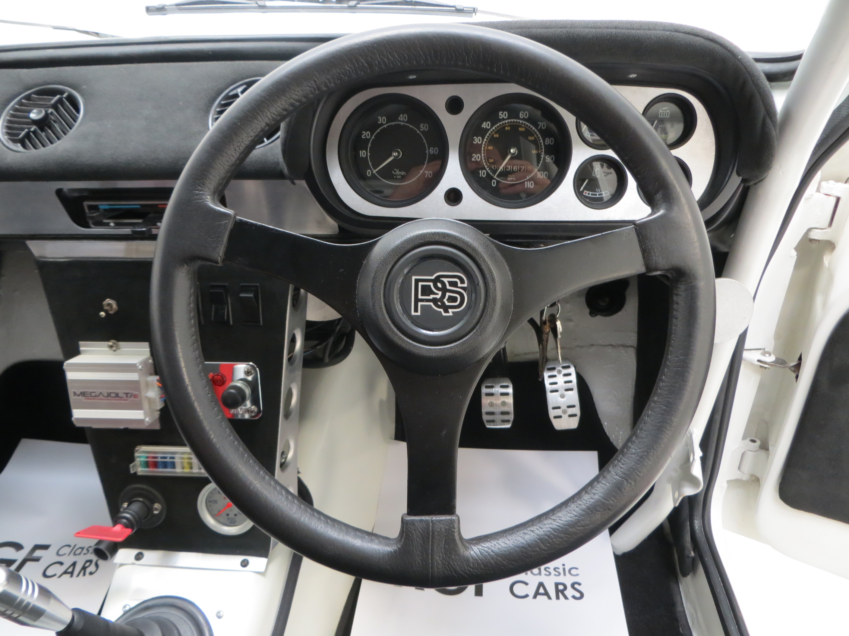 Front quarter bumpers, flared wheel arches, single leaf rear springs, anti-roll bar, strut brace, strengthened chassis rails, bias brake pedal box, Type 9 gearbox (5 speed), boot mounted battery, Safety Devices roll-cage, long base chrome door mirrors, anti-burst locks, black painted aluminium grille, front sports bucket seats with Clubman harness, RS three spoke steering wheel, six dial dash, heater fan, two speed wiper, push-button start, battery and fuel isolator switch, switchable electric engine fan, fire extinguisher, Facet fuel pump.