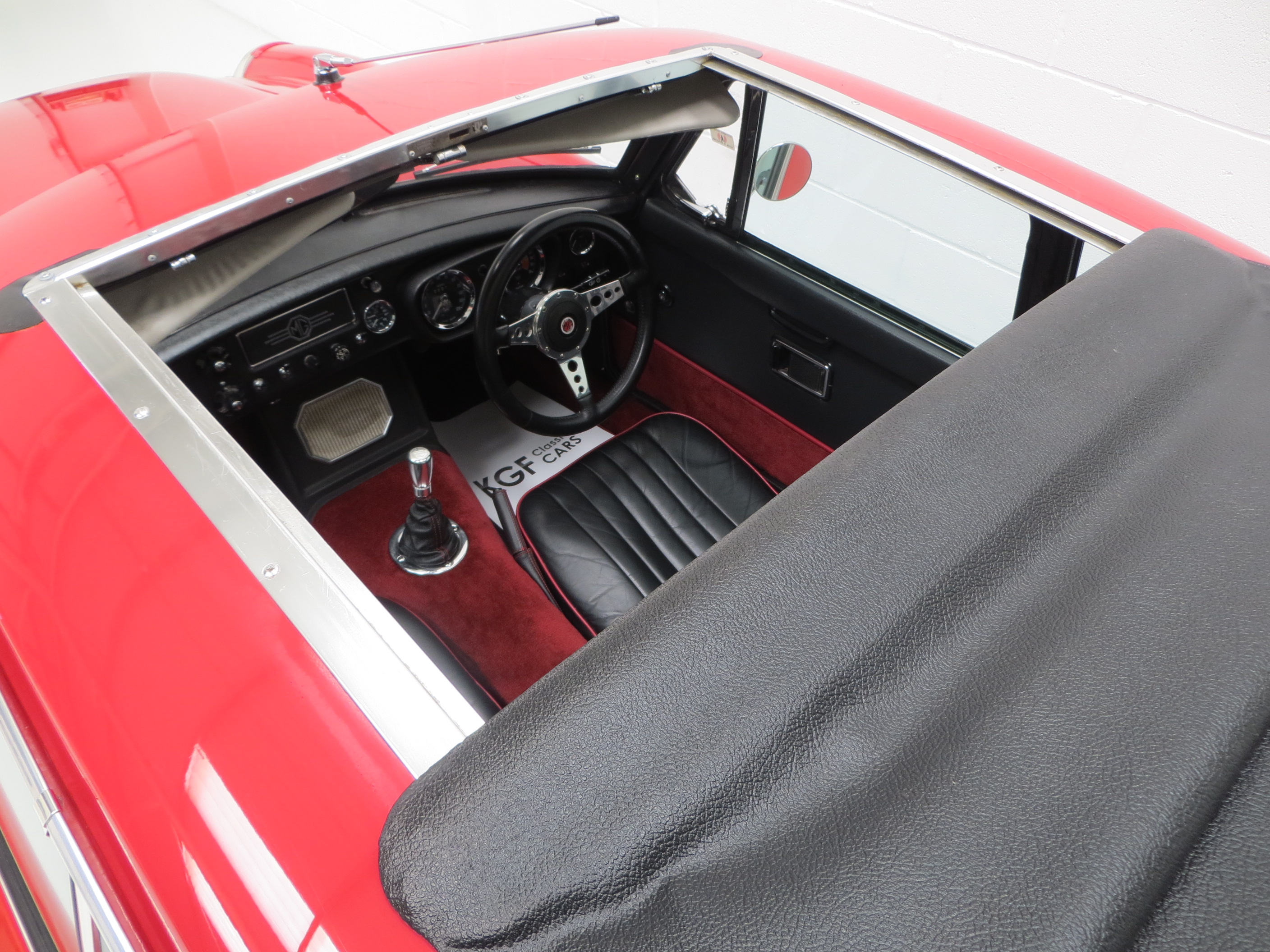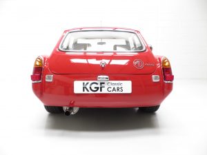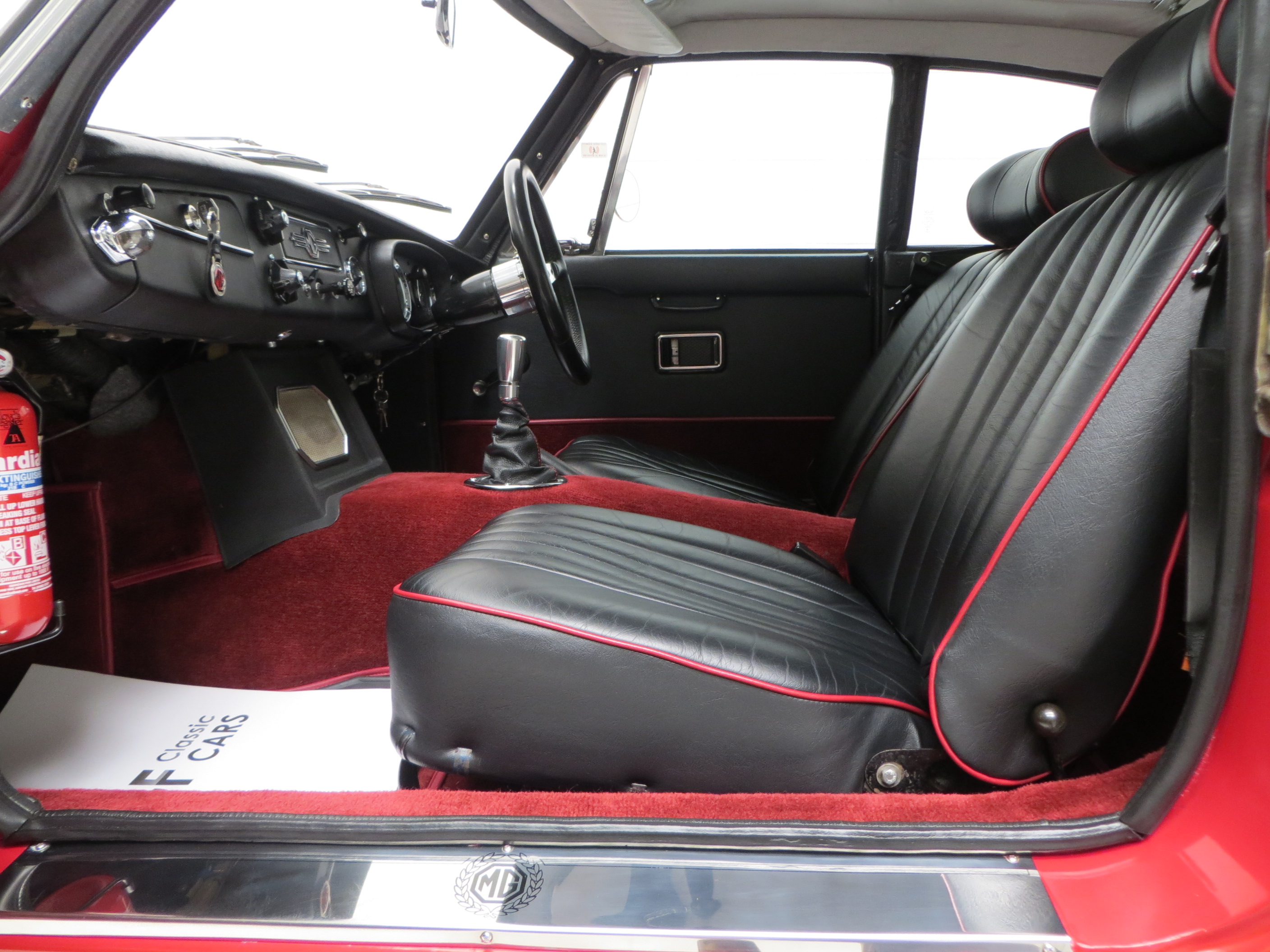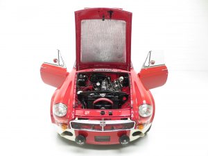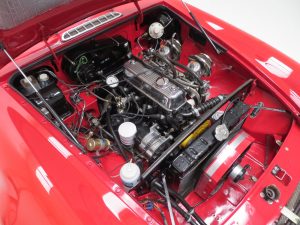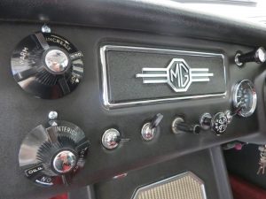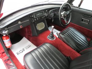 A no-expense-spared mentality has continued throughout the interior with a full and expensive re-trim. Clean red deep-pile carpeting has been tailor made precisely for this car extending to the spotless boot area and protected by MG rubber mats. New seats with matching red piping combined with a refurbished crackle dash and black leather Moto-Lita steering wheel offers comfort and practicality unlike the few stripped out originals made in the late 1960’s. All the controls, gauges and switches operate perfectly and extra period switches for the driving lamps and electric engine fan have been fitted.