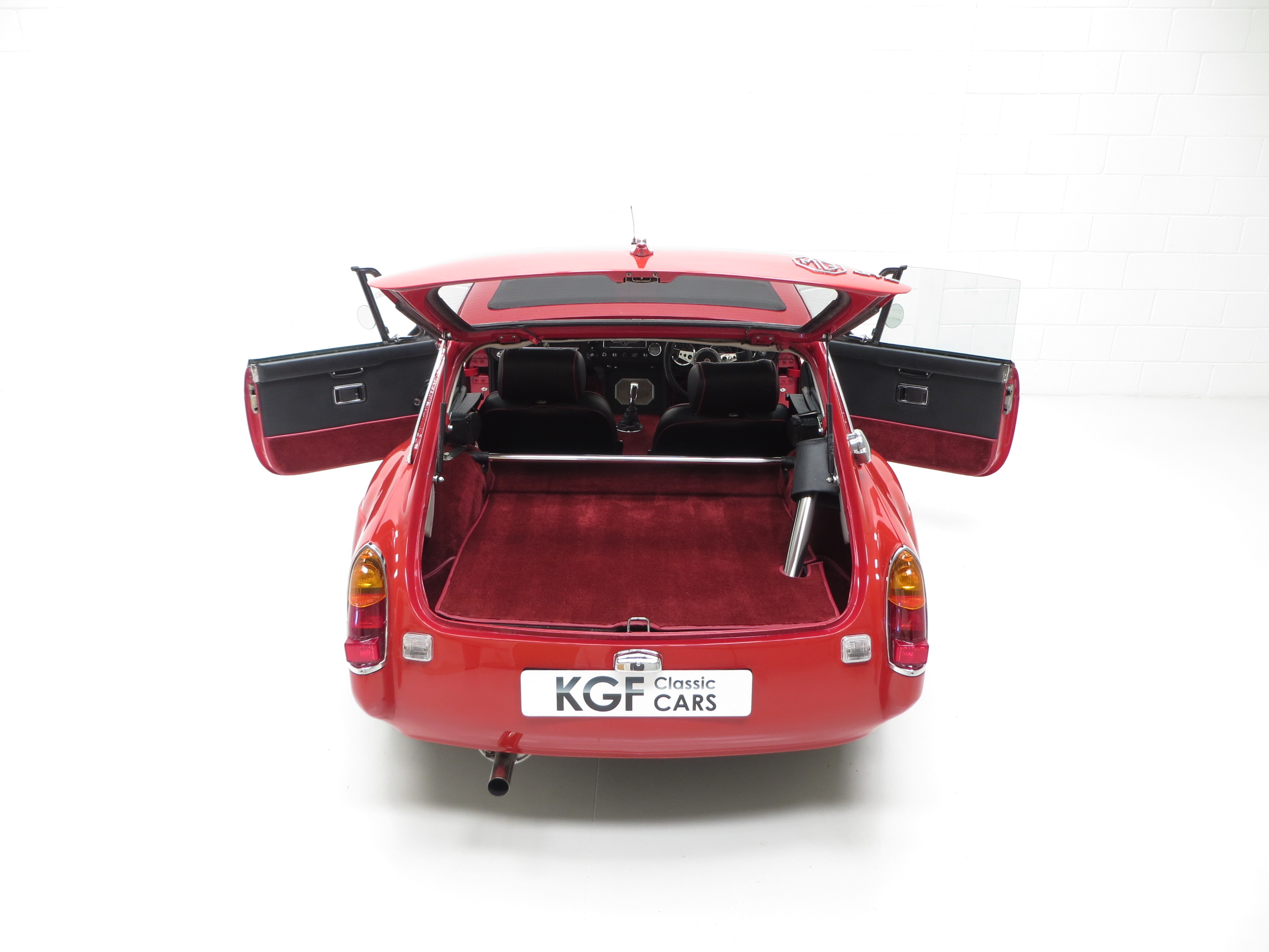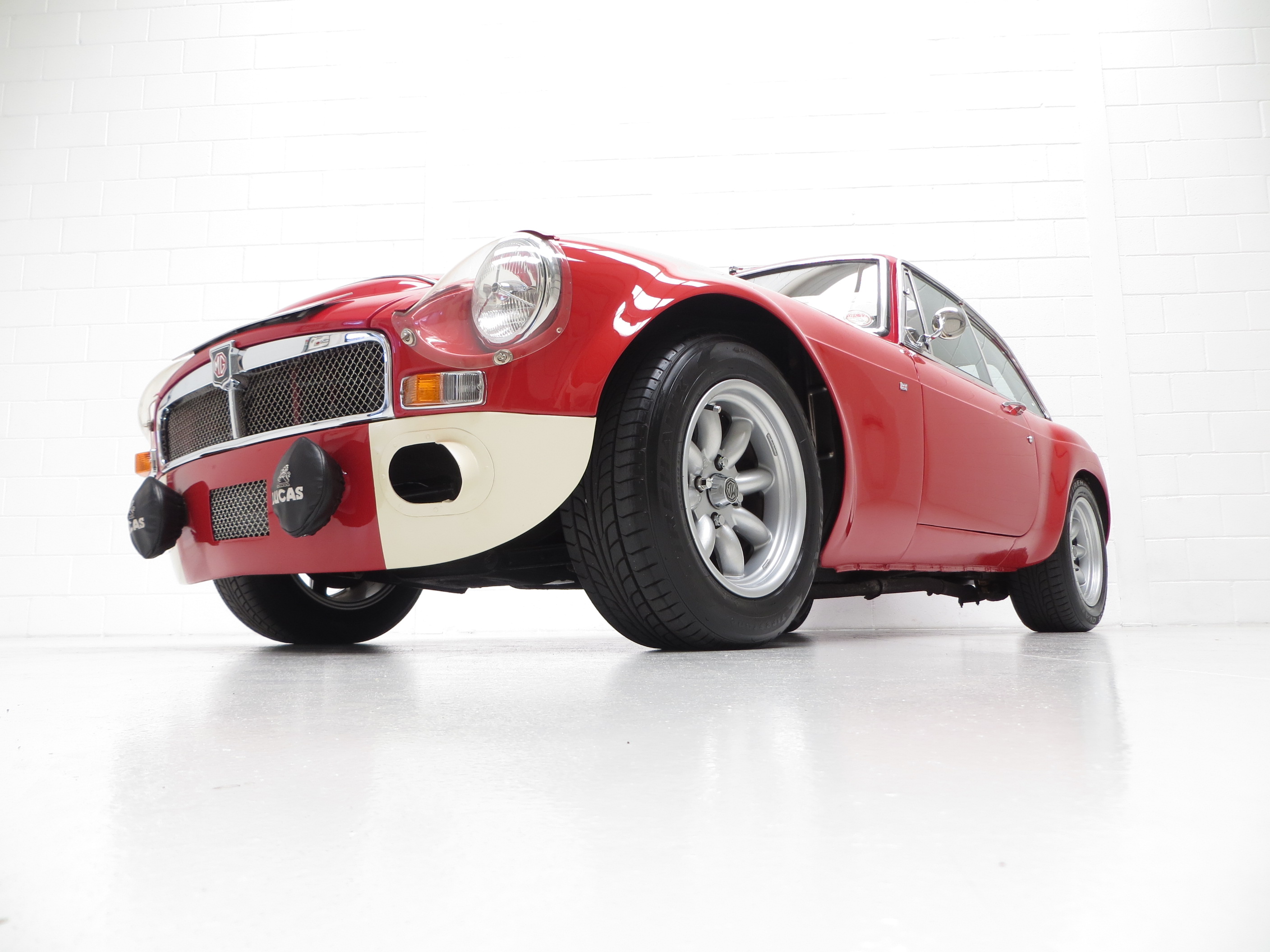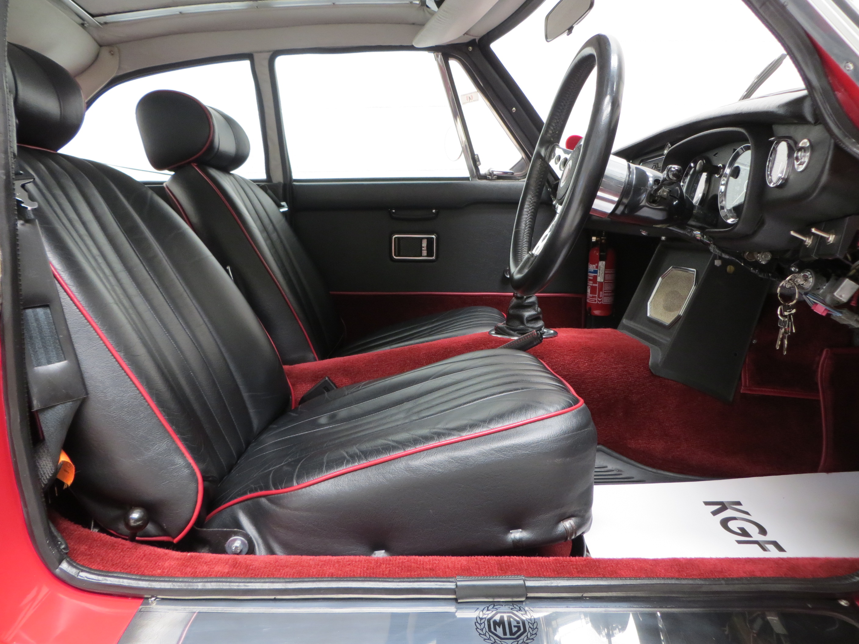 A no-expense-spared mentality has continued throughout the interior with a full and expensive re-trim. Clean red deep-pile carpeting has been tailor made precisely for this car extending to the spotless boot area and protected by MG rubber mats. New seats with matching red piping combined with a refurbished crackle dash and black leather Moto-Lita steering wheel offers comfort and practicality unlike the few stripped out originals made in the late 1960’s. All the controls, gauges and switches operate perfectly and extra period switches for the driving lamps and electric engine fan have been fitted.