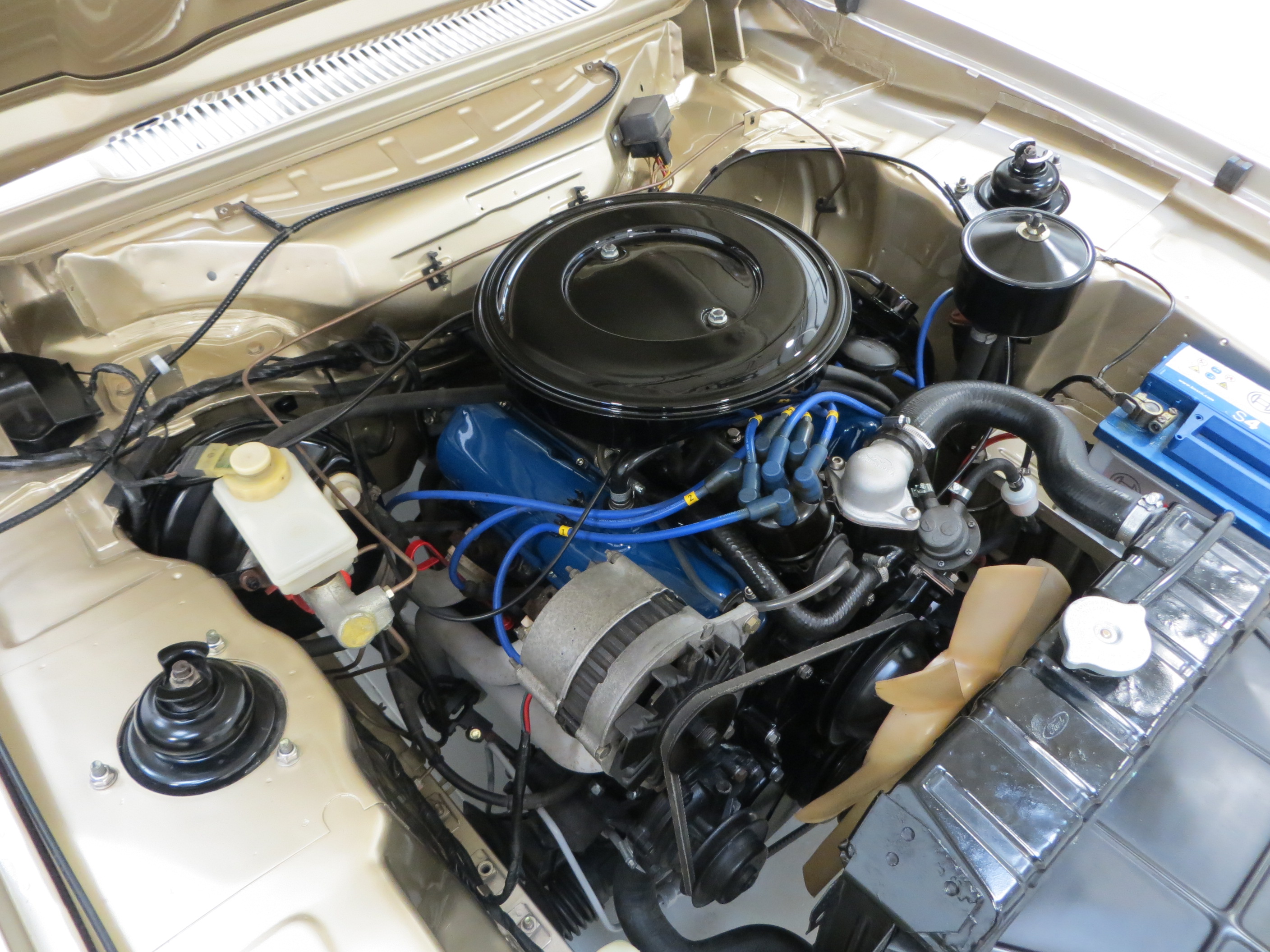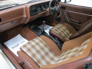 This iconic models interior is distinguished by seats fully trimmed in the Chocolate/White Carla fabric (code A1) with Chocolate Savannah fabric surrounds. The upholstery is spotlessly clean and free from wear as is the matching deep pile carpeting, brand new at the time of restoration. The three spoke leather sports steering wheel looks factory fresh, and all controls and gauges fully function including the two-speed heater fan and analogue quartz clock. The soft feel dashboard is free from cracks, however two tiny splits to the outer surface around the offside A pillar can be seen and the rear package tray is not fitted. The perforated headlining is clean, tight and free from discolouration. This fantastic 1970’s interior remains exactly true to Ford’s intentions, truly brilliant.