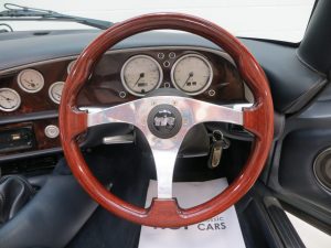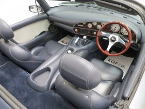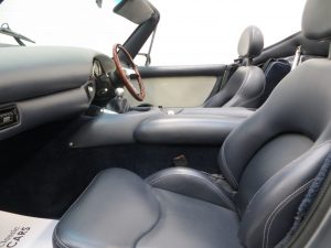 The upgraded Cerbera sports seats were an expensive factory option along with the Monza steering wheel and beautifully machined polished aluminium interior fittings from Leven TVR Products. The navy seats trimmed in full hide are in remarkable order with only light aging to the driver’s upper bolster. The large padded central tunnel and padded dash top are trimmed to match the seats and the contrasting walnut fascia and polished interior fittings complement each other beautifully. This example incorporates vinyl inner door trim, a feature on only the very late Chimaera’s. Beautiful heating control wheels and the ingenious central door release knob are machined from solid aluminium bar stock with fluted edges. All functions and controls operate perfectly and the AccuMate battery conditioner is professionally wired in and neatly positioned in a compartment behind the passenger seat. A wonderfully ostentatious interior with all the TVR wizardry and sporting prowess exactly as the manufacturer intended.
