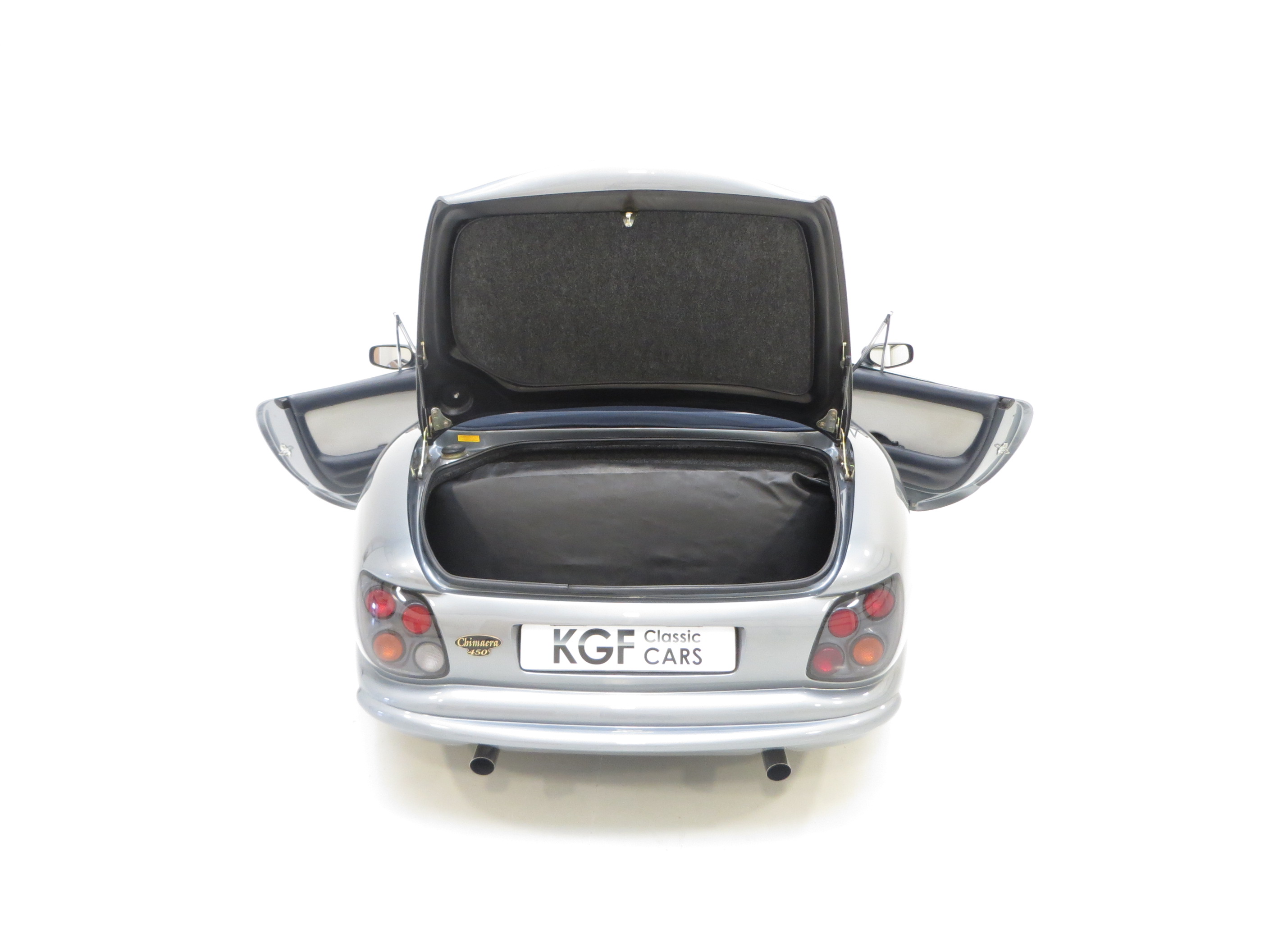 Penned as a slightly more subtle but no less potent version of the legendary TVR Griffith, the Chimaera retains the instantly recognisable TVR styling cues and all of the magic and flamboyance. Finished in original TVR Titanium Grey (code PPG011), the superb uniform paint finish accentuates the curvaceous lines beautifully. Only very minor paintwork imperfections can be detected upon close scrutiny which are reputed to have been present from new. Due to the very late production of this example and regular protection against the tubular frame and chassis outriggers are perfect and offer peace of mind. The removable roof panel and fold down rear header are simplistic and effortless to use with a tailored stowage bag for the panel to be neatly hidden away in the boot. There is a tiny rub mark to the edge of the outer fabric on the rear header. All trim sections and optional gold badges are complete and in excellent order. A stunning unmolested example resonant of its low mileage credentials. Exhilaration guaranteed.