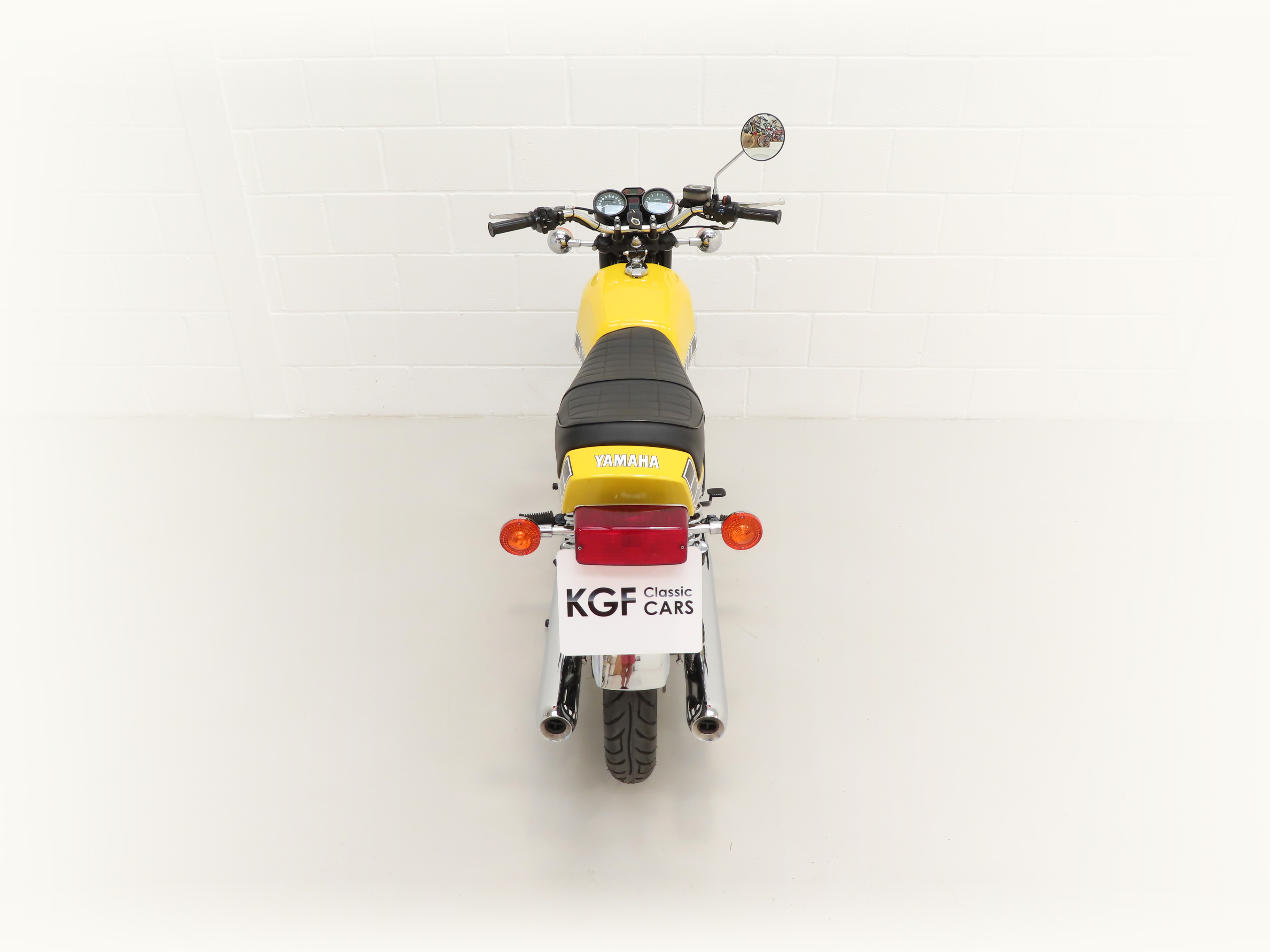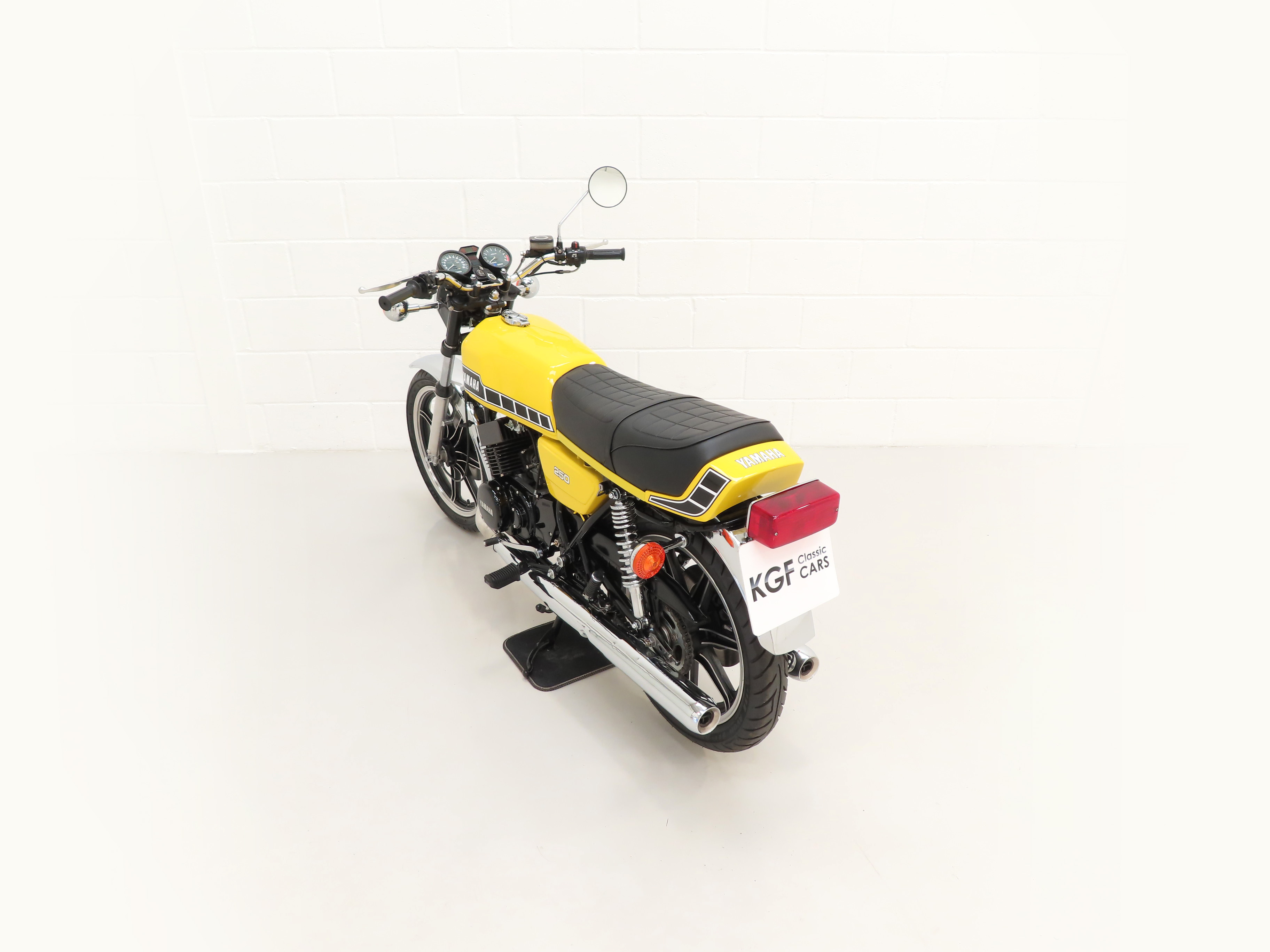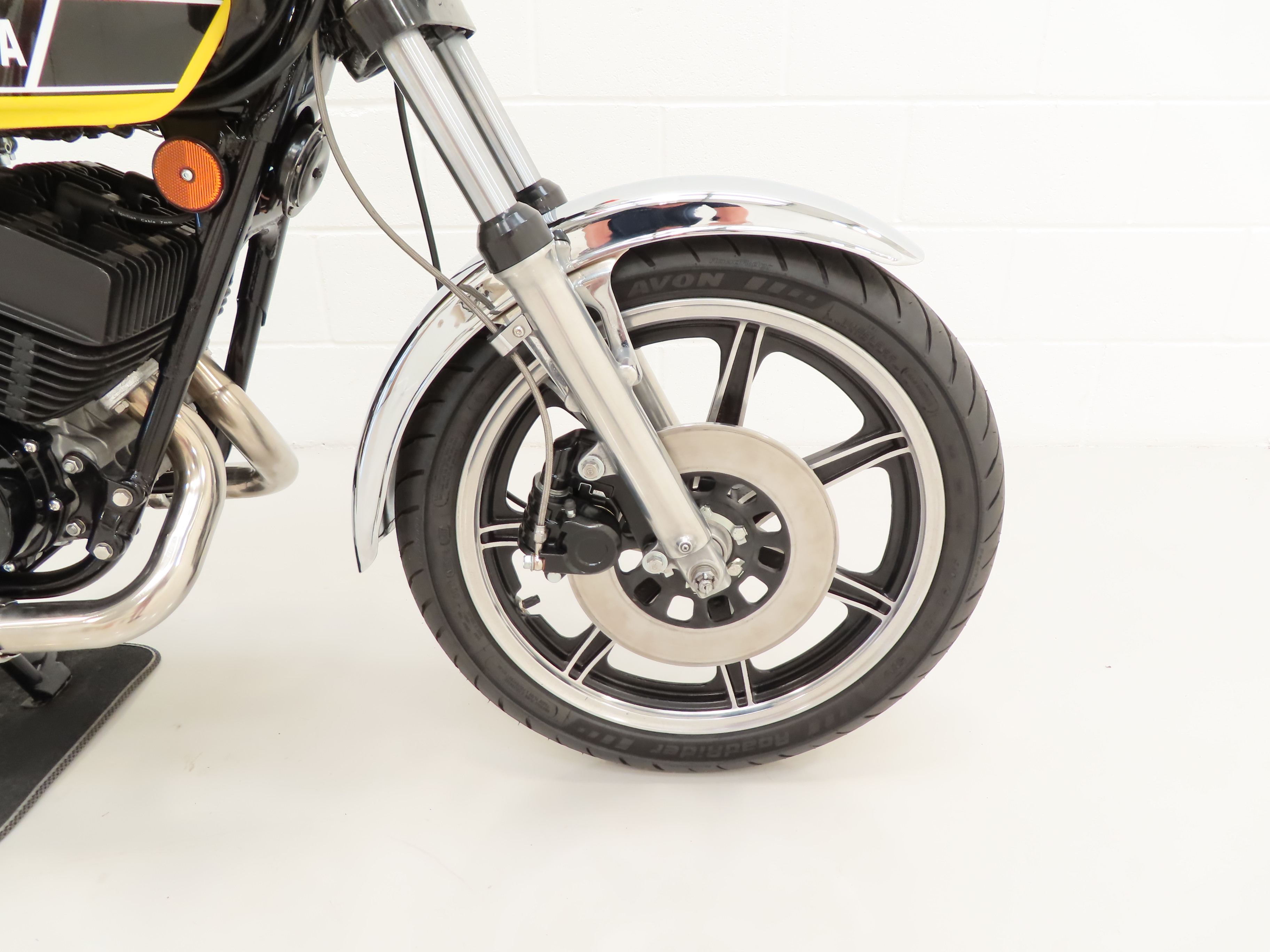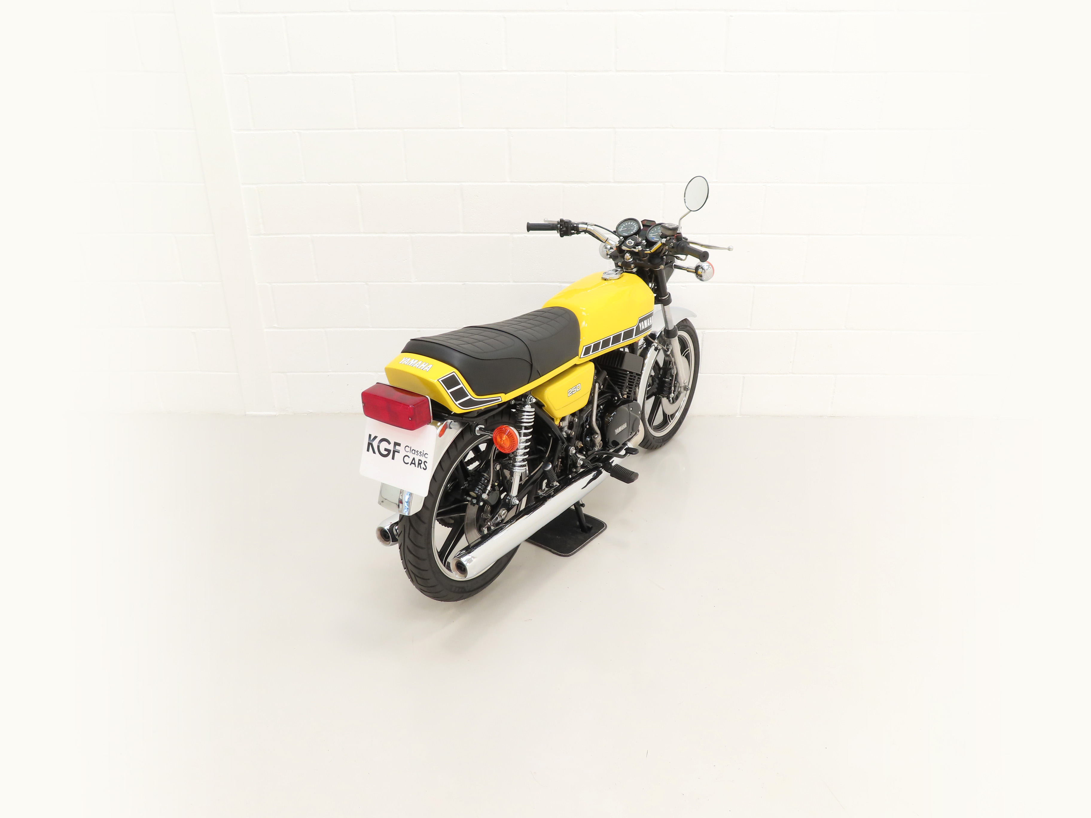 Finished in the iconic Kenny Roberts Yellow, the paintwork with matching side faring is in superb order with the famous and correct Black Yamaha speed block motif proudly on display. The chrome work boasts a mirror finish and the rear exhaust silencers clearly show the correct Yamaha part numbers to each pipe with a few minor dings. The downpipes have been replaced with stainless items and the seat base is a fibreglass item with the correct owner’s manual cover, seat rubbers, hinges and seat catch. It also has a brand new seat sponge and cover. The high-tensile steel tubular double-cradle frame has been powder-coated with the frame number visible and matches the engine number. All functions, lights and controls operate perfectly and the speedometer mph is marked in lower-case mph with a soft back-lit green glow only fitted to the E Model type. A very special air-cooled sports machine.