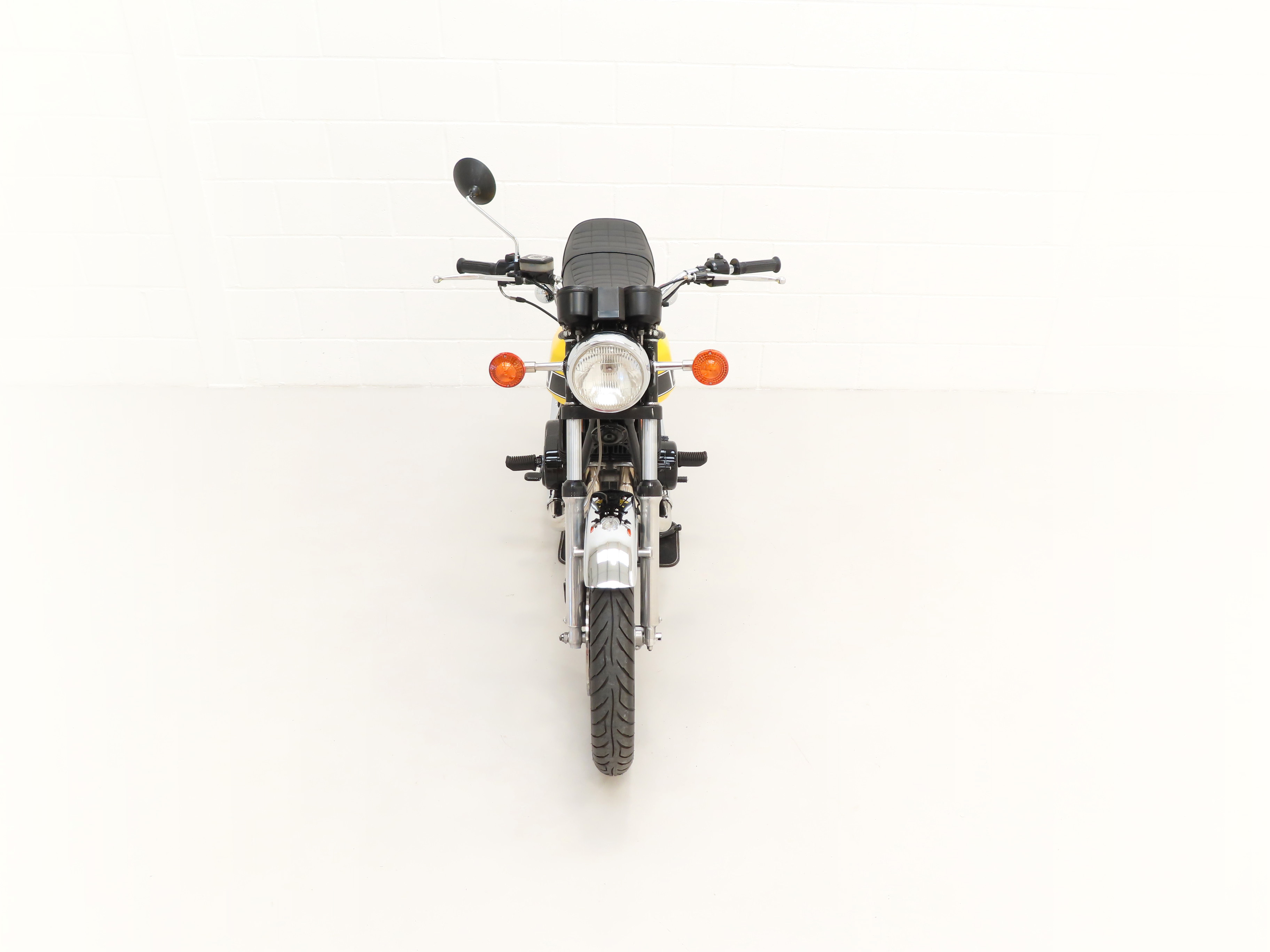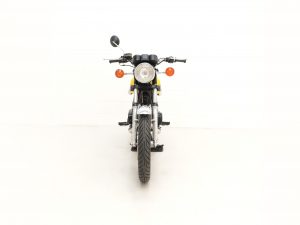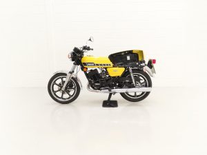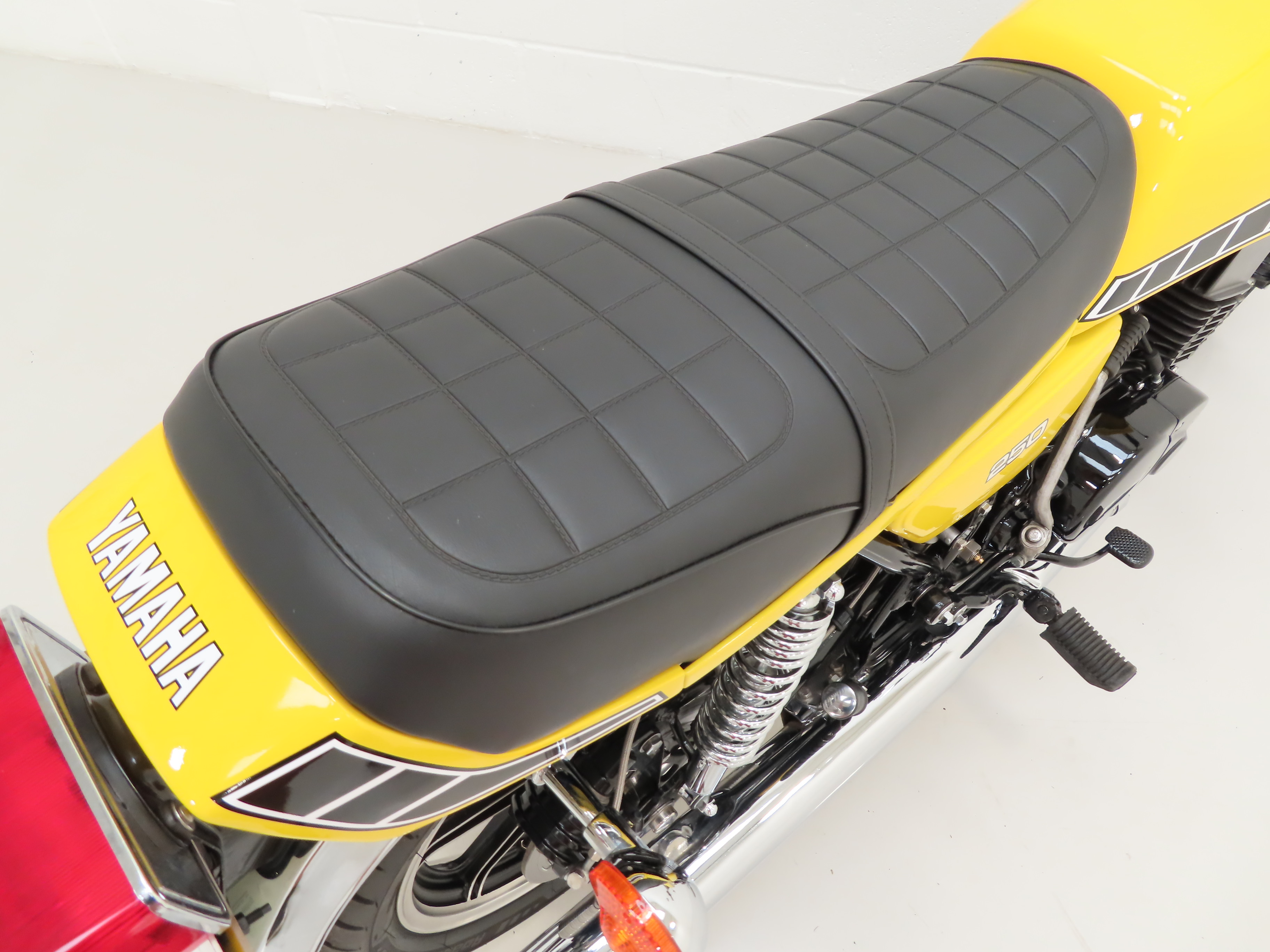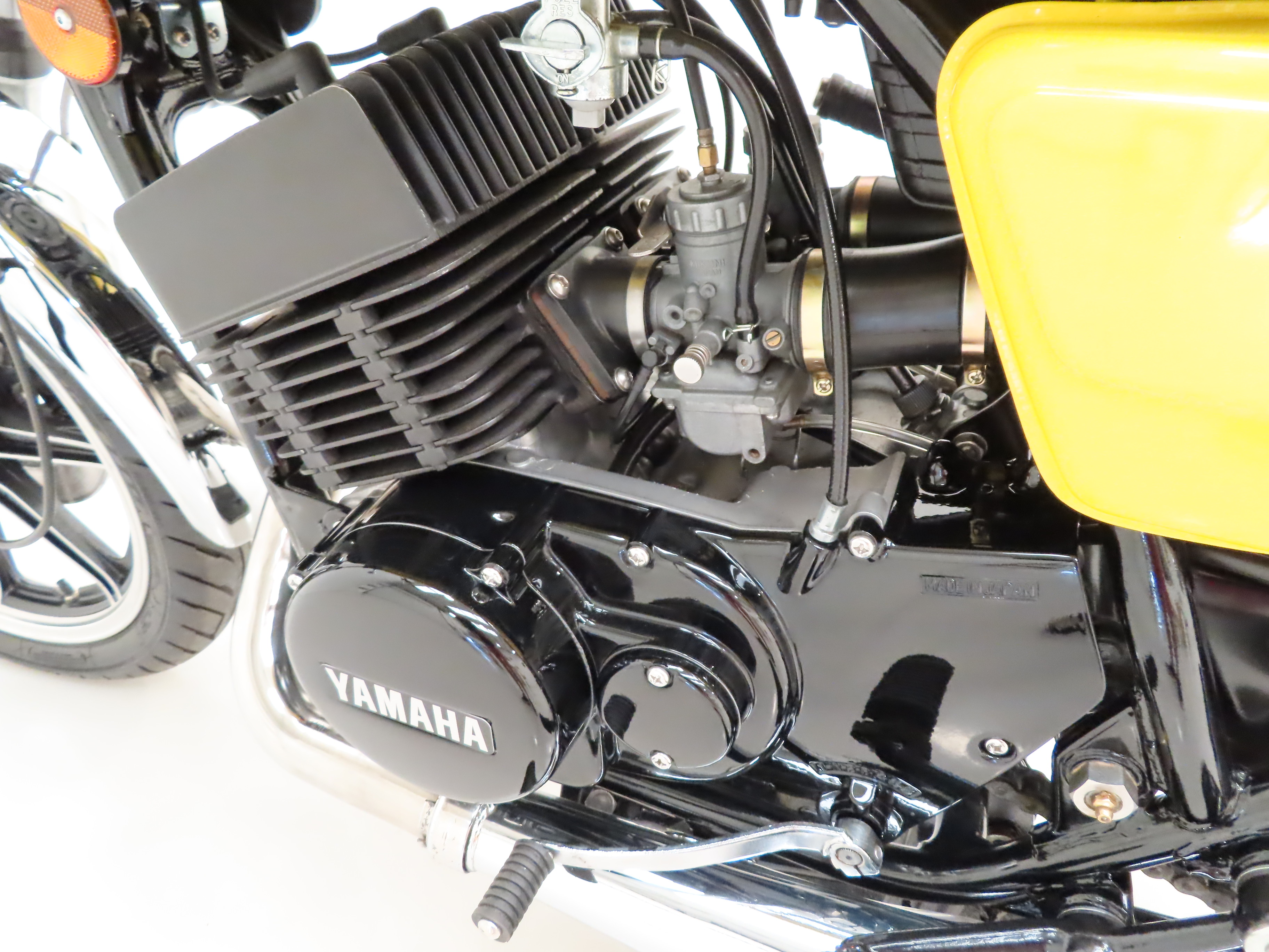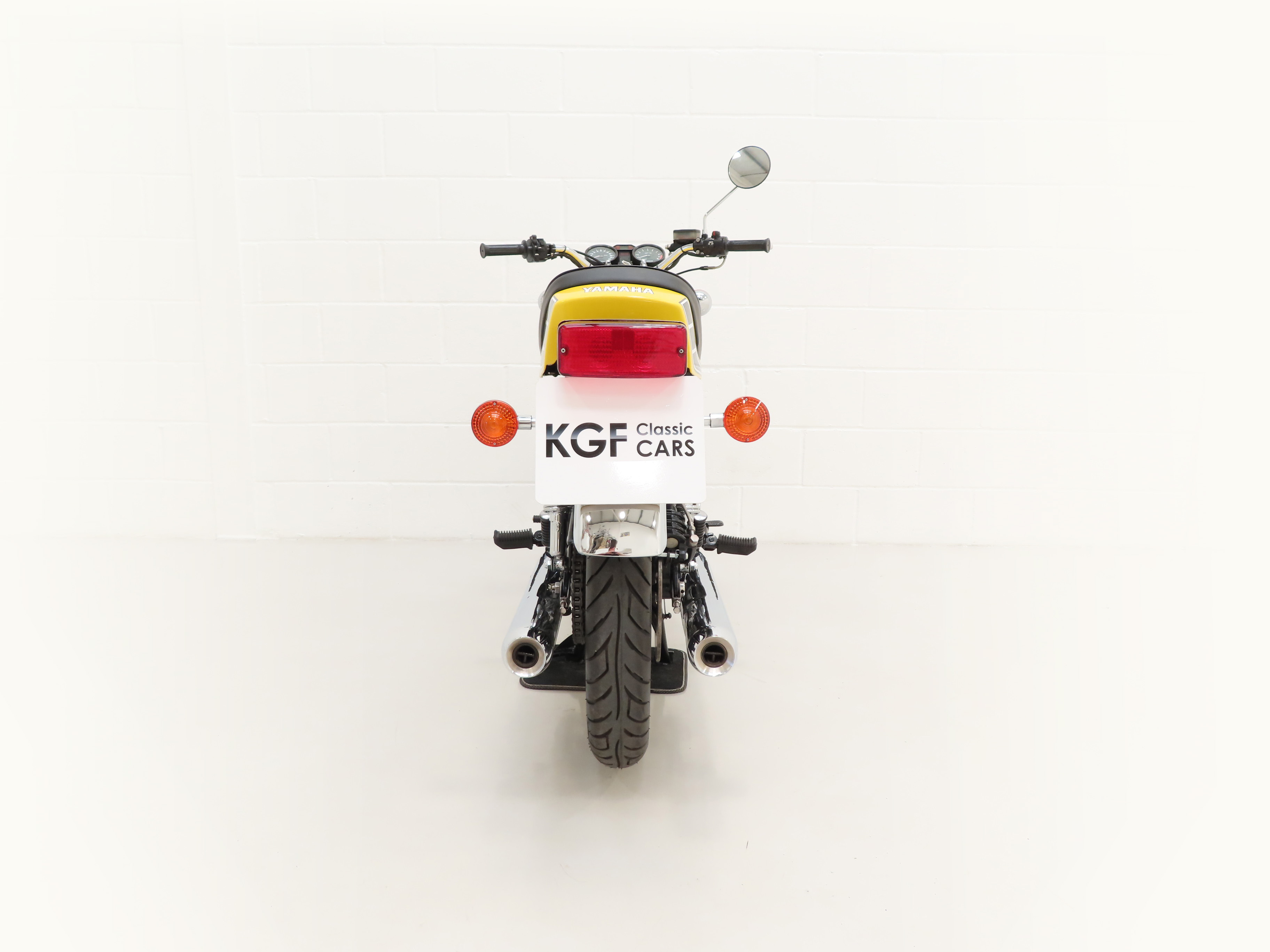 Finished in the iconic Kenny Roberts Yellow, the paintwork with matching side faring is in superb order with the famous and correct Black Yamaha speed block motif proudly on display. The chrome work boasts a mirror finish and the rear exhaust silencers clearly show the correct Yamaha part numbers to each pipe with a few minor dings. The downpipes have been replaced with stainless items and the seat base is a fibreglass item with the correct owner’s manual cover, seat rubbers, hinges and seat catch. It also has a brand new seat sponge and cover. The high-tensile steel tubular double-cradle frame has been powder-coated with the frame number visible and matches the engine number. All functions, lights and controls operate perfectly and the speedometer mph is marked in lower-case mph with a soft back-lit green glow only fitted to the E Model type. A very special air-cooled sports machine.