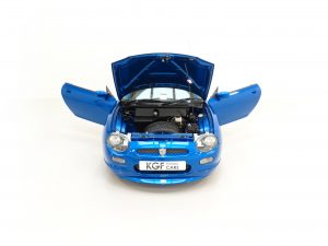Supplied new by MG Main Dealers, Osborne Garages Ltd of Colchester, this UK MGF Trophy 160 SE was purchased new by a Mr Decker who used the car for just two years before recognising its uniqueness and rarity and so deciding to place the car into dry storage. In 2017 the car was purchased from the original owner by a renowned MG Specialist where it became the owners showroom display piece for two years, at which point the second and only other keeper, Mr Fewtrell, purchased the car in 2019 to add to his fastidiously kept collection of classic cars and motorcycles. Whilst boasting collectors’ quality credentials of low owners and super-low mileage, this limited edition MGF Trophy 160 SE is ready to use and enjoy should the next owner wish as the coolant pipes have undergone the desirable stainless-steel upgrade and the cambelt, water pump and heavy-duty head gasket upgrade were carried out in August 2019.