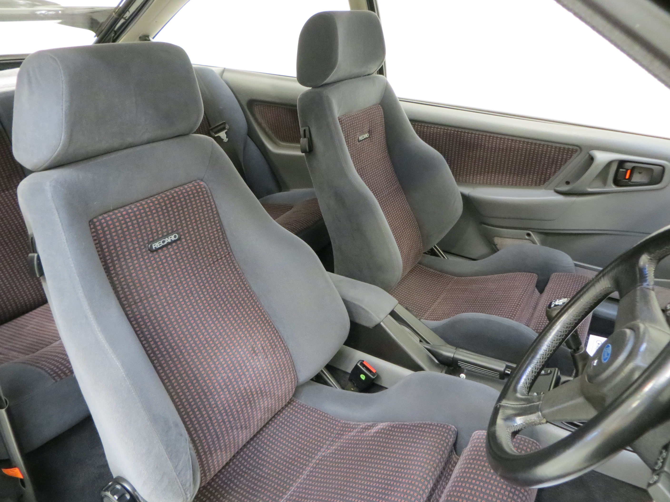Bodyside mouldings, integral front air dam, colour coded door mirrors, electrically adjustable and heated door mirrors, colour coded lockable fuel filler cap, bonnet cooling vents, halogen headlamps, colour coded bumpers, single plane rear wing spoiler with trailing edge fence, lower tailgate mounted spoiler, tinted glass all round, tailgate wash/wipe, laminated windscreen, central locking, extended centre console, cigar lighter, quartz digital clock, fascia light dimmer, leather gearknob, leather three spoke sports steering wheel, 3-speed heater fan , cassette storage, electronic sound system (model ECU2) with power amplifier, electric aerial, Recaro Sports front seats, split folding rear seats, tilt and slide sunroof, tachometer with turbo boost gauge, trip recorder, anti-locking brake system with failure warning light, electric front windows. Dealer options; Ford floor mats.