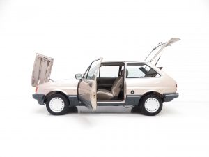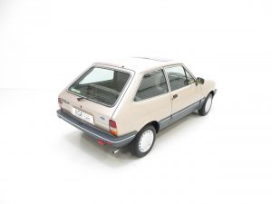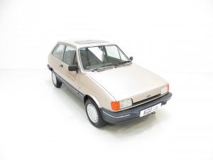 This superb and delightful Ford Fiesta Ghia has been beautifully preserved and cherished. The paintwork finished in Ford Quartz Gold (code O3) has a fantastic bright shine and uniform finish. The correct Mid Grey paintwork to the lower sections of the car remains exactly as Ford intended. All original panels are straight with linear gaps, and the car is preserved completely free from rust or corrosion. Close scrutiny will reveal nothing more than minor touched in scratches and two miniscule dings to the bonnet. The unmolested appeal of this special vehicle is accentuated by standard trim sections, bumpers and wide body-side mouldings, correct and in immaculate order. All glass is number plate etched and even the supplying dealer rear screen sticker remains in place! A truly impeccable example of Ford’s flagship luxury Fiesta.