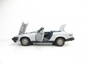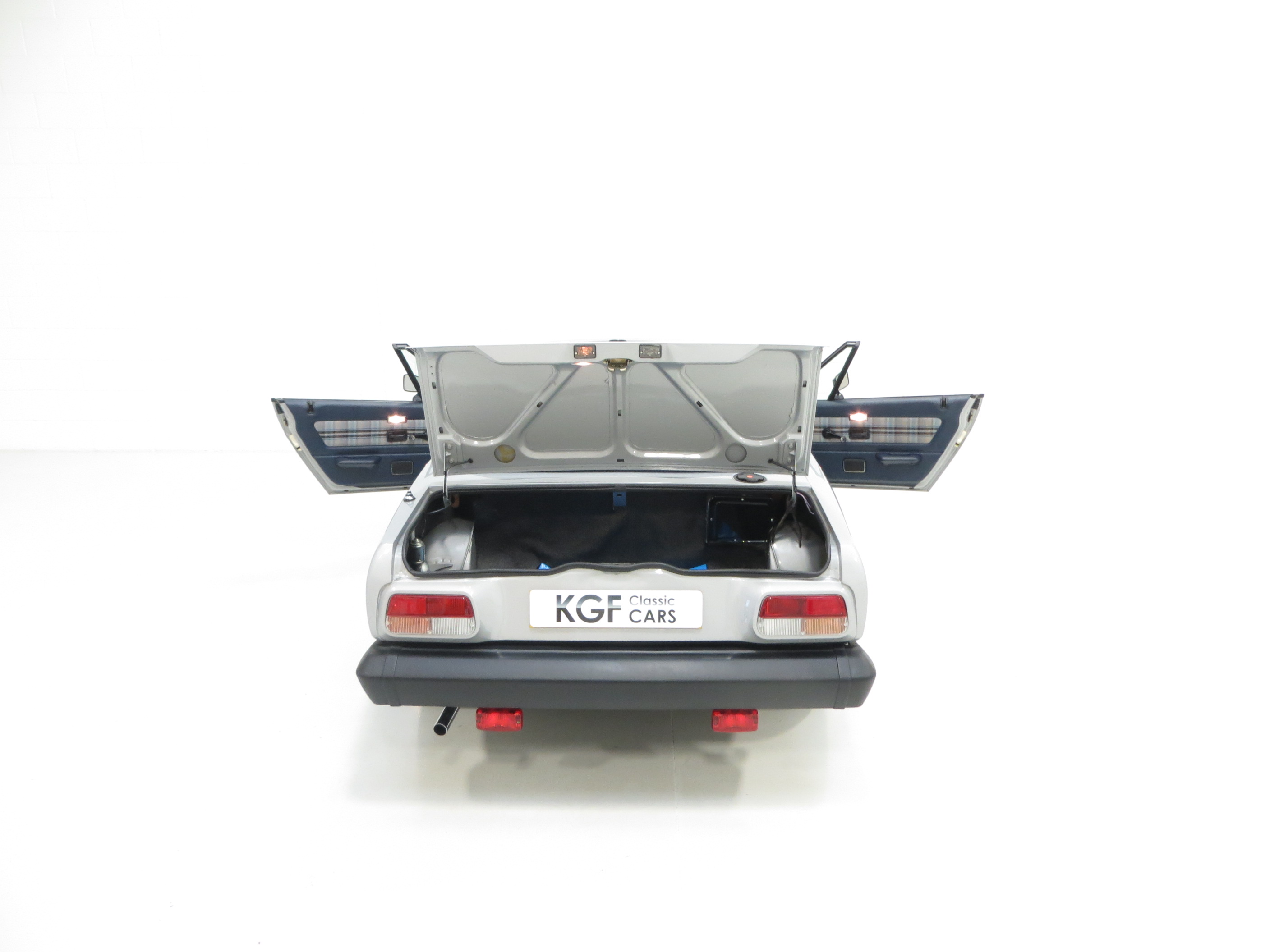 The iconic and unmistakable shape of the TR7 led enthusiasts and the motoring press alike to coin the nickname of the ‘Triumph Wedge’. This unrepeatable example finished in optional Argent Silver Metallic (code MCB) has been preserved in exceptional condition owing to the mere 11,039 miles covered under truly cossetted ownership. Only the closest scrutiny to this mind blowing example will reveal utterly trivial imperfections, namely a tiny ding to the nearside front wing. The trims and glass sections are perfect even down to the bright vibrant lens owing to careful storage and even the rubber door edge protectors remain fitted. The underside is structurally perfect with manufacturer’s stickers and labels visible. The blue folding hood is immaculate with all poppers intact. Without question one of the best in existence.