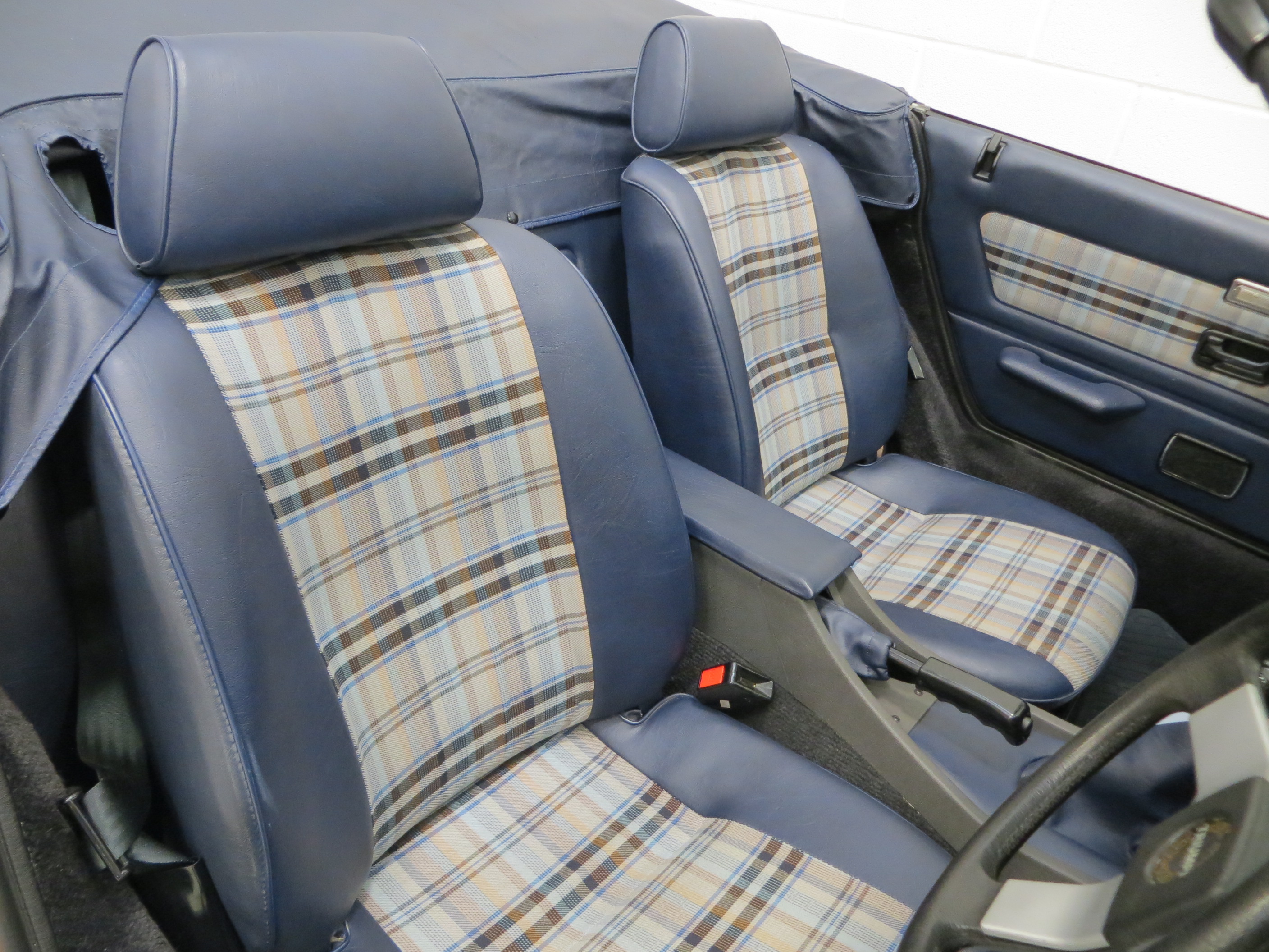 The incredible interior of this example is as new and surely the closest you can get to a Triumph showroom experience in 1981. The Navy blue (code JMN) seat facings trimmed in woven plaid material with vinyl borders and matching headrests are in perfect condition with no fading. The steering wheel displays the factory prominent veins of a low mileage example and all switchgear housed in the amusingly boxy fascia is functional and entirely intact. The pristine carpets have been protected from new by genuine Triumph rubber mats. Originality seekers will delight at items such as the supplying dealer tax disc holder, hood operation sticker and the spotless boot area with unused jack still in the blue plastic bag. The period Sharp Searcher Radio cassette operates well with the discreet electric switch for the working Maystar aerial still in place. The term showroom fresh can be misused but this example thoroughly deserves the accolade.