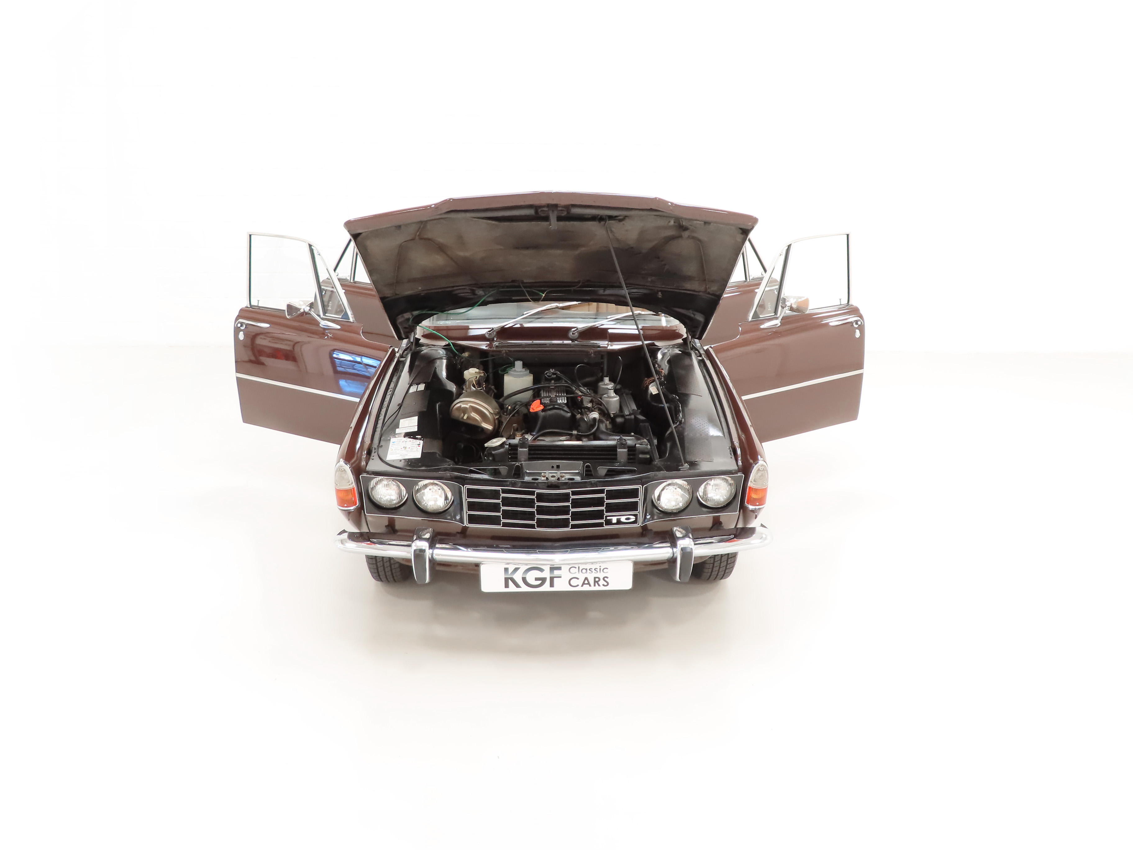 Powered by the factory fitted 2200TC specification engine, this four-cylinder unit with aluminium alloy head and twin S.U.HIF 6 carburettors produces 115bhp and 183Nm of torque. The engine breathes through a stainless-steel exhaust and performs brilliantly, is surprisingly swift and a real pleasure to drive. The unmolested engine bay is beautifully clean and displays factory stickers, labels and the inner wings both have the original chassis number stamp. The four-speed gearbox has synchromesh on all forward gears and operates brilliantly.