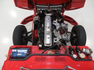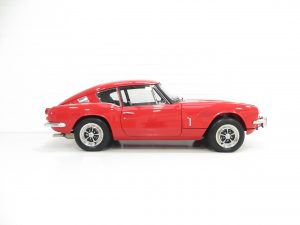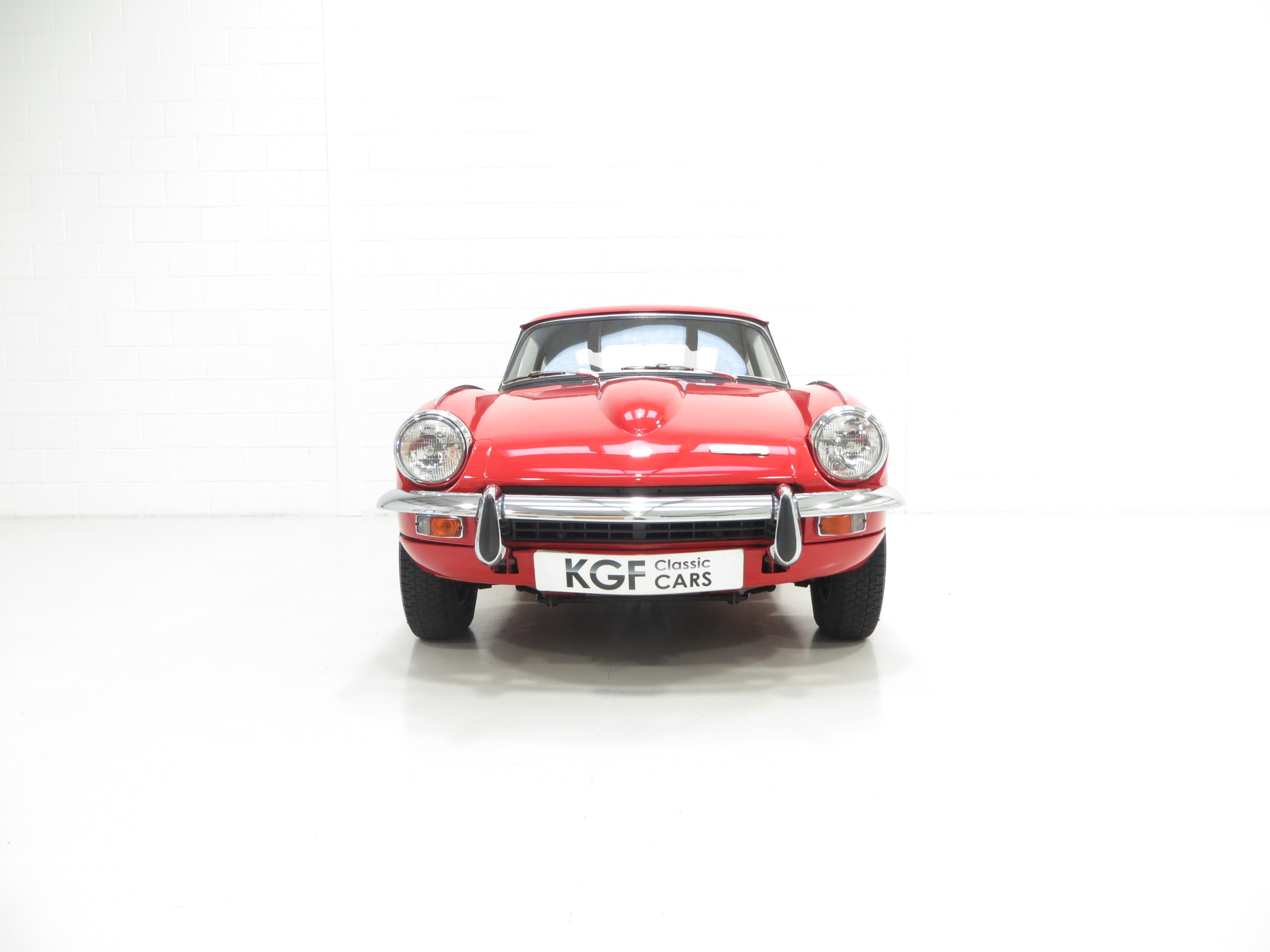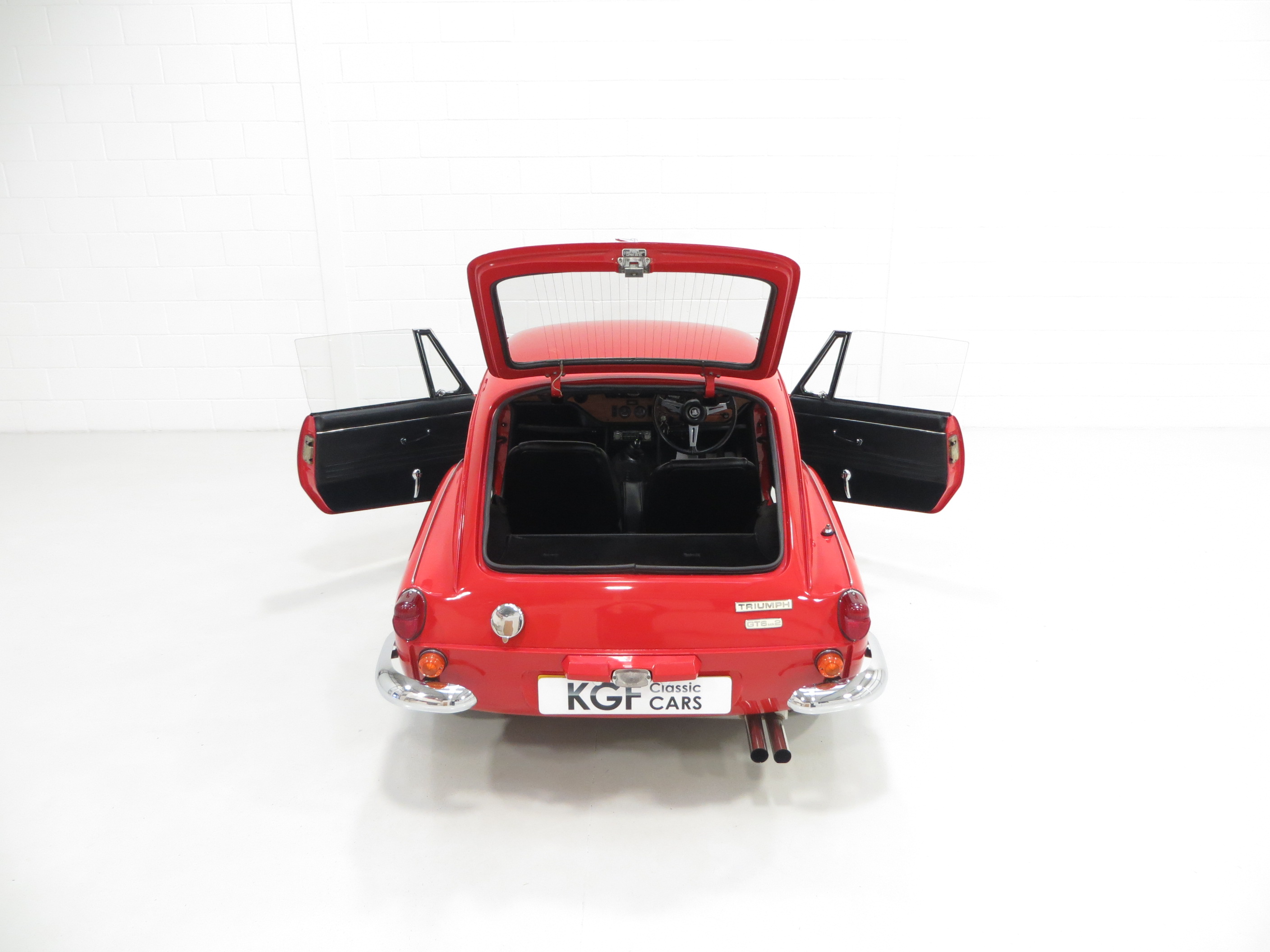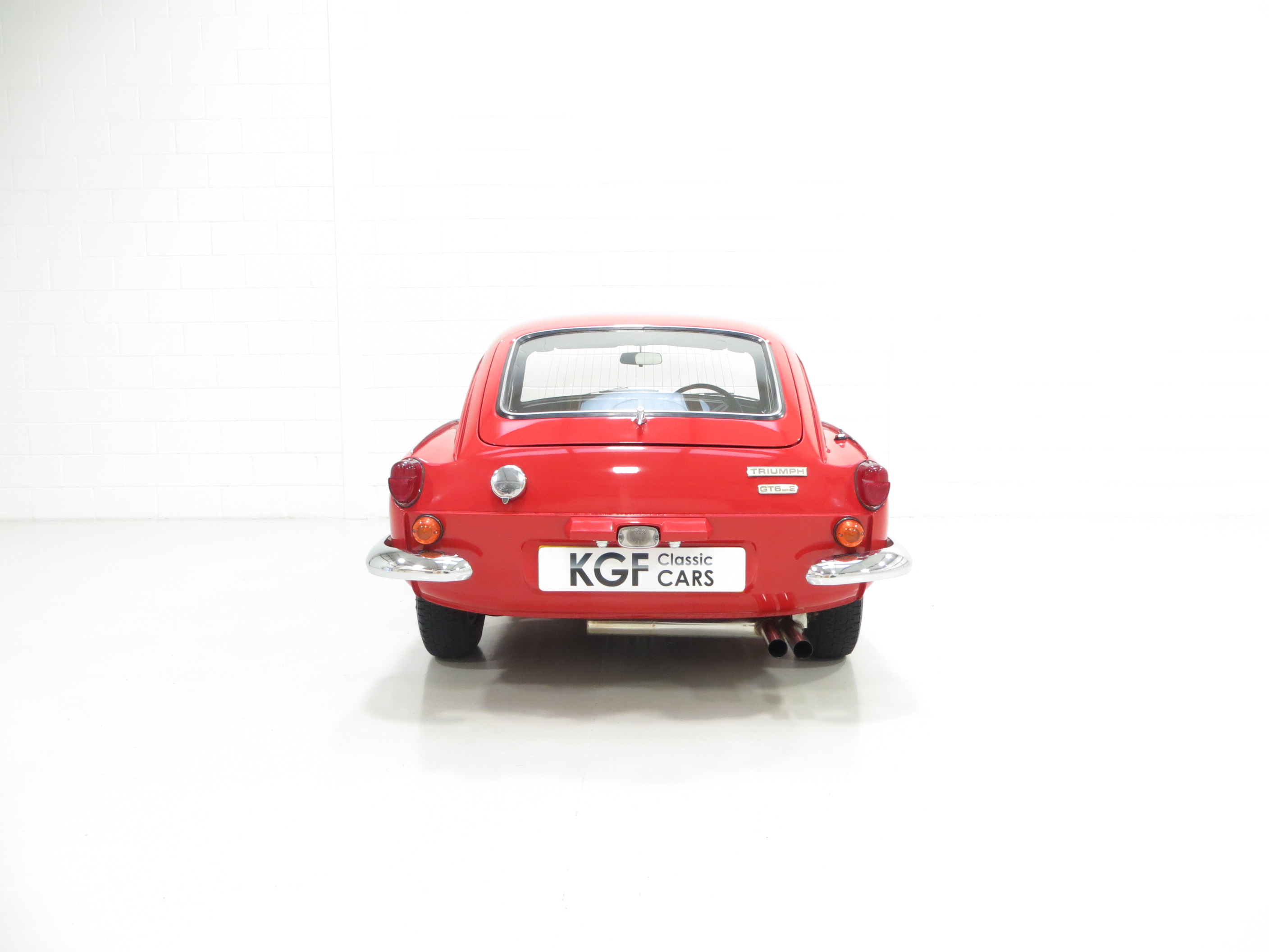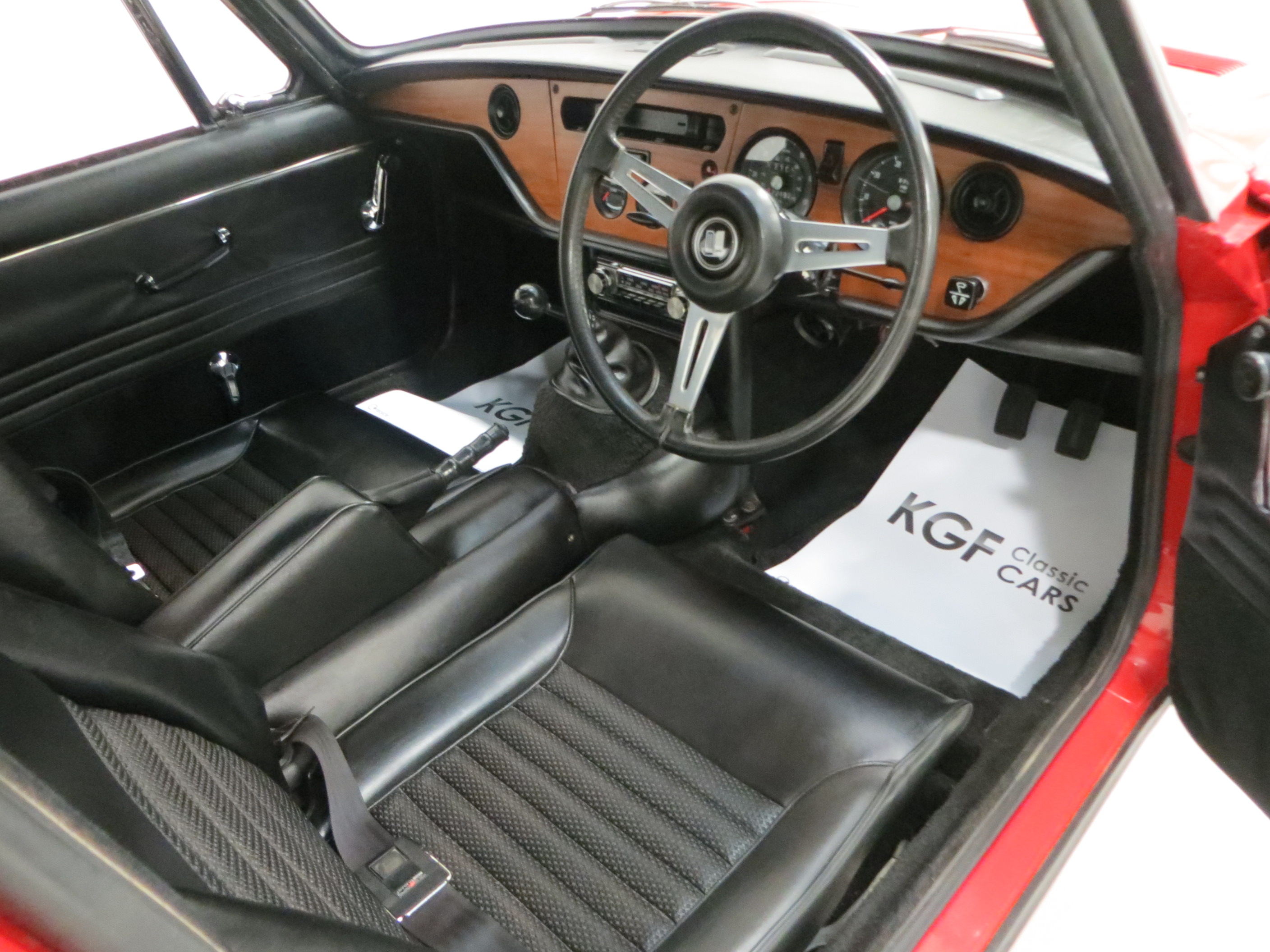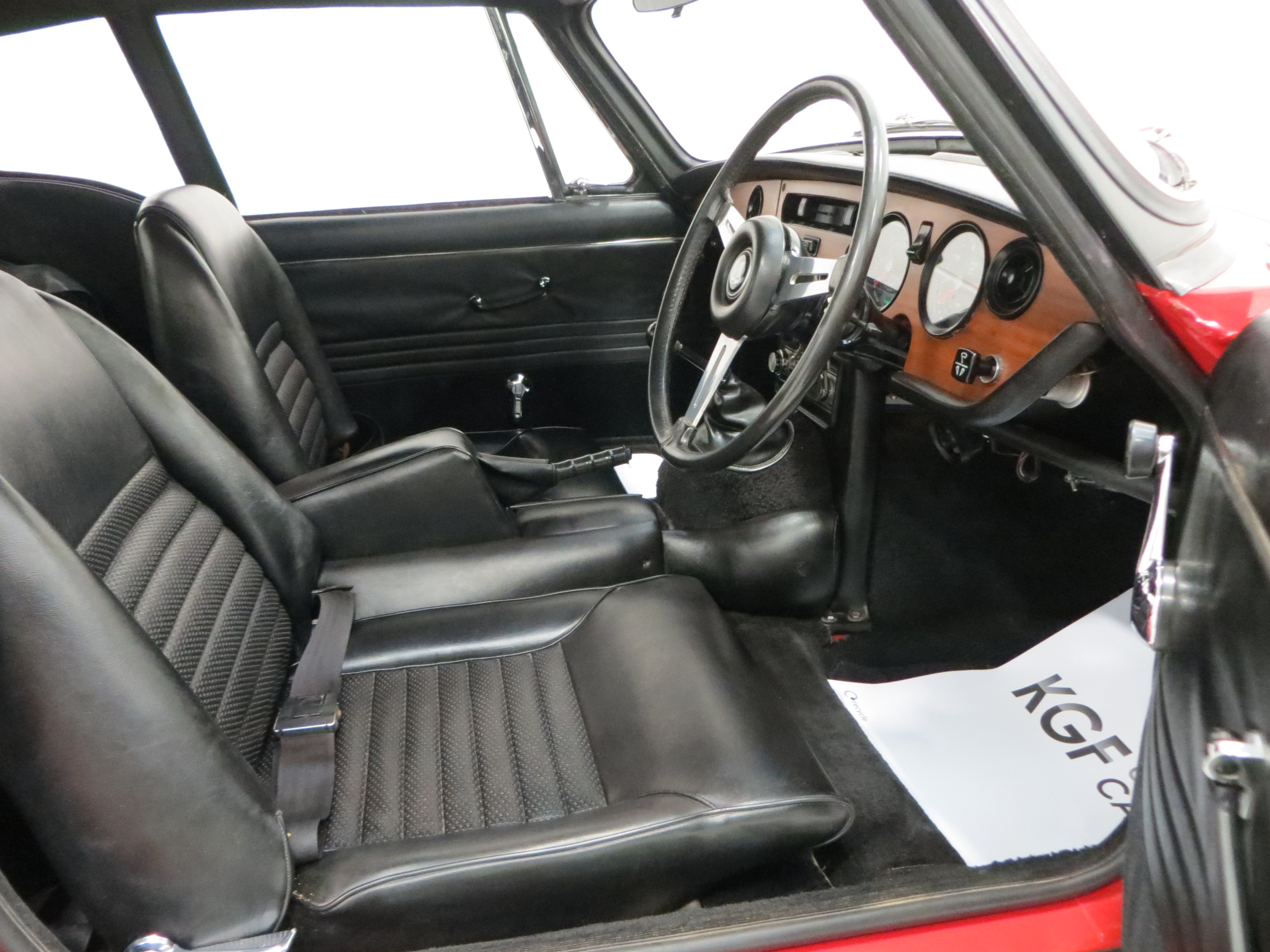 The breath taking pretty Michelotti designed grand touring body in the original colour of Triumph Signal Red (Code 32) is simply stunning from every angle. The paintwork to this ex-concours Mk2 has a glossy polished shine and uniform finish. Only very minor paintwork imperfections are visible upon close inspection and the vehicle is absolutely free from rust or corrosion. The beautifully cleaned and detailed underside and wheel arches proudly exude just how good this example is. All quality polished chrome bumpers and the stainless steel wing beadings are virtually flawless and exactly as Triumph intended. The original exterior badges, additional brightwork and rubbers all remain intact and in excellent order. A low owner and low mileage example presented in truly exceptional condition.
