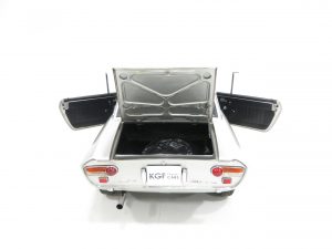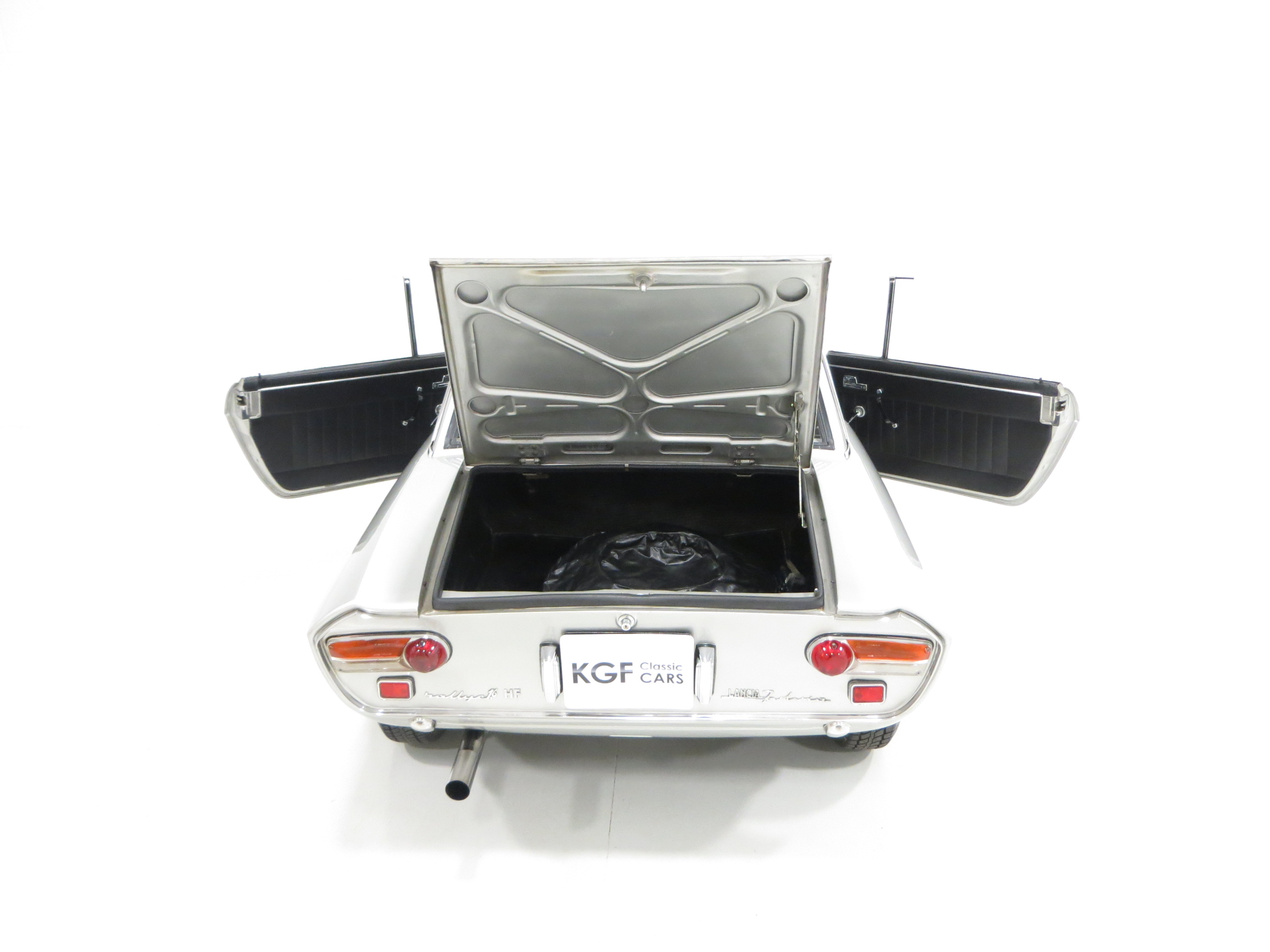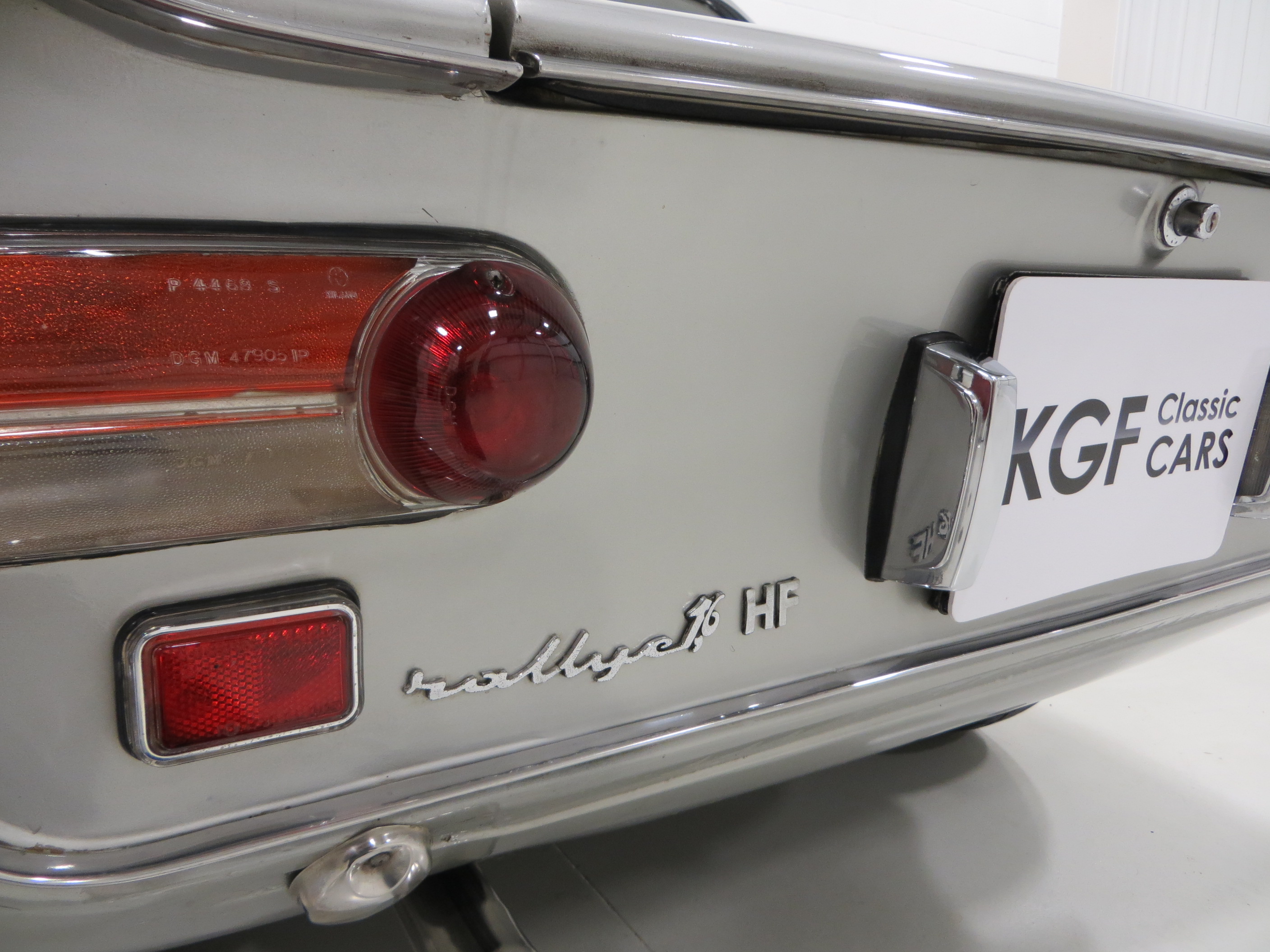 It takes a trained eye to spot a genuine UK-market Fulvia HF Fanalone and this unmolested, incredibly rare example finished in no-cost but optional metallic Grigio Escoli, is no exception. Still wearing the black glassfibre wheel arch extensions and 170mm main beam headlights that will help the knowledgeable differentiate but experts will relish in the uncut rear valance, holed in standard production cars to feed wiring and the blank pressing where a passenger interior light switch should be fitted. Rally pedigree is assured being one of the early 1258 homologation S1 Rallye specials and fortunately all the correct aluminium panels remain fitted helping to explain why the car only weighs 850kg. The chrome bumpers are retained, as fitted to the RHD drive cars, but not fitted. They are in excellent order as per the rest of the car. The paintwork shows some minor ageing but absolutely no corrosion and all the chrome badging is factory standard. The ultimate Series One and certainly one for the Lancia purist.