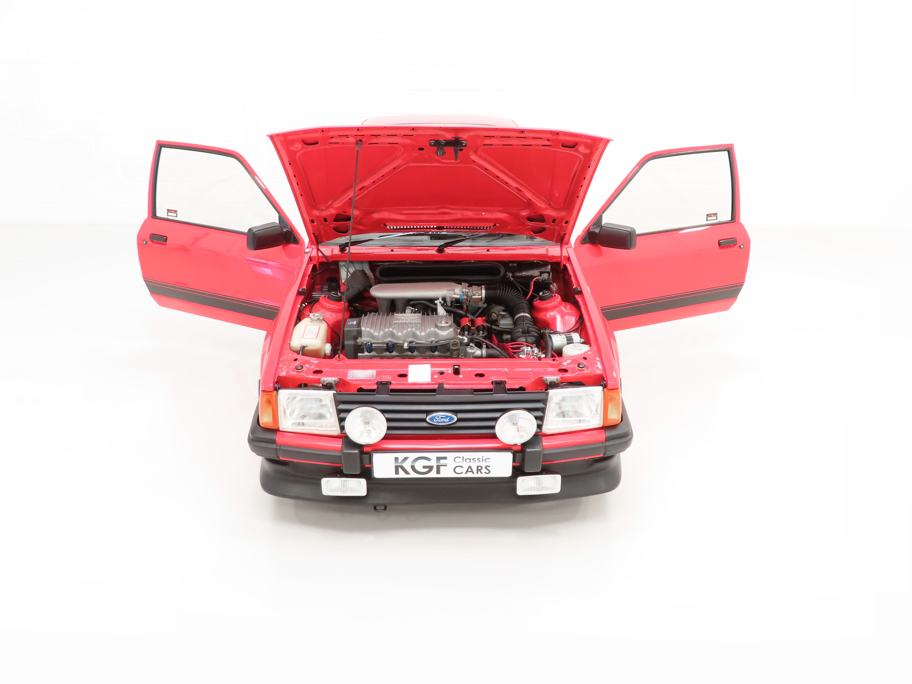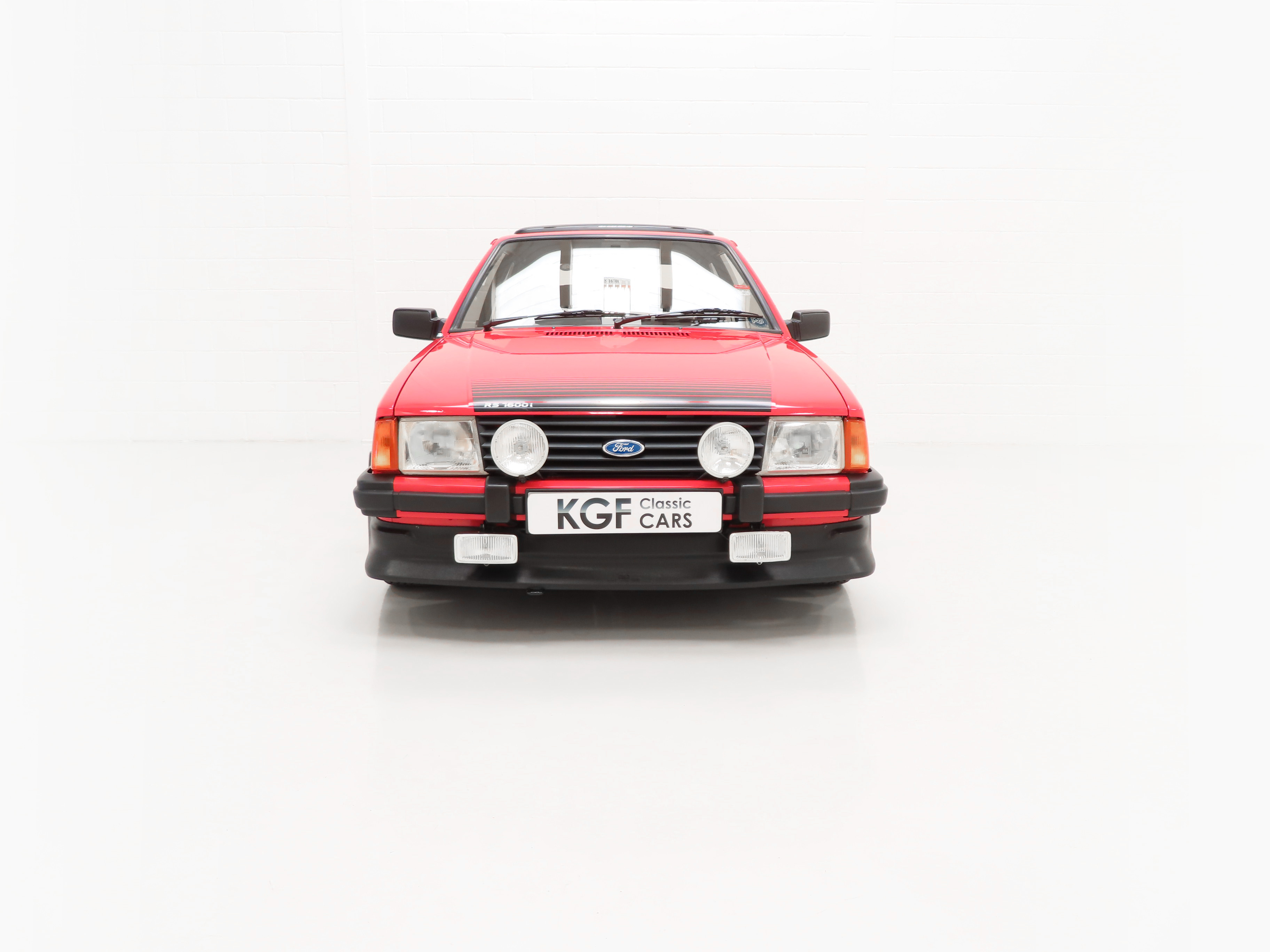 Prepare to be amazed. Introduced in September 1981, this stunning example was built in April 1983 and is one of 2,600 UK examples and just one of 560 in Sunburst Red. (Source: RS Owners Club). Registered new on the 11th May 1983 by Ford Rallye Sport Dealer, Bristol Street Motors (Cheltenham) Ltd, to Mr S Warwick. The new vehicle invoice totals £8259.28 and begins what can only be described as a colossal journey documenting every mile of this cars pampered life. Mr Warwick quite literally keeps a personal journal of every experience from visiting the car when it arrived at the dealer covered in wax to his correspondence with Ford where they eventually agree to upgrade the brakes and fit the Series X Sports Handling Kit at the Ford Boreham factory free under warranty. He was sworn to secrecy as every RS1600i customer would demand the upgrade! All Ford invoices are neatly filed and the list of jobs demanded by Mr Warwick on every visit highlight his perfection seeking nature. Mr Warwick also had tyres replaced by Dunlop. The car remained in his protective care until December 2015 when it was sold to RS enthusiast, Mr Wilcock, who entered the RS Concours circuit and immediately starting winning trophies including Novice Gold Cup Winner at RSOC National Day in 2017 amongst many all catalogued in the Concours Competition Logbook.
