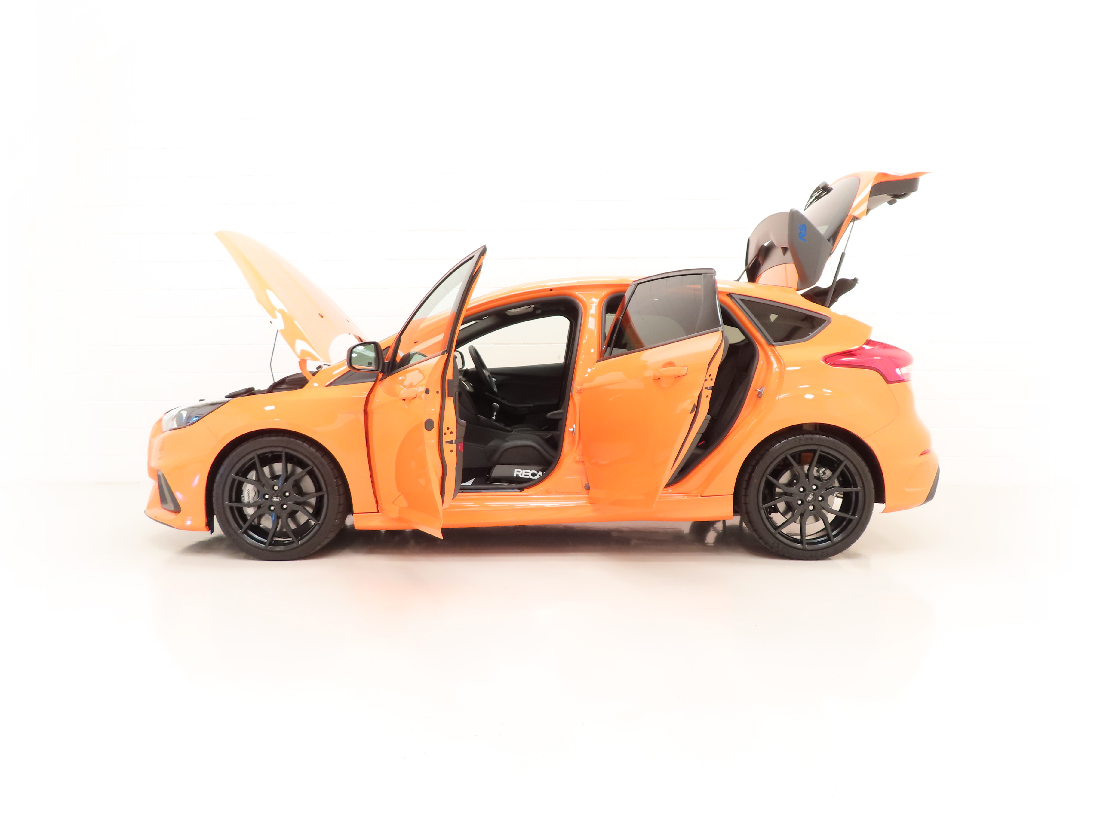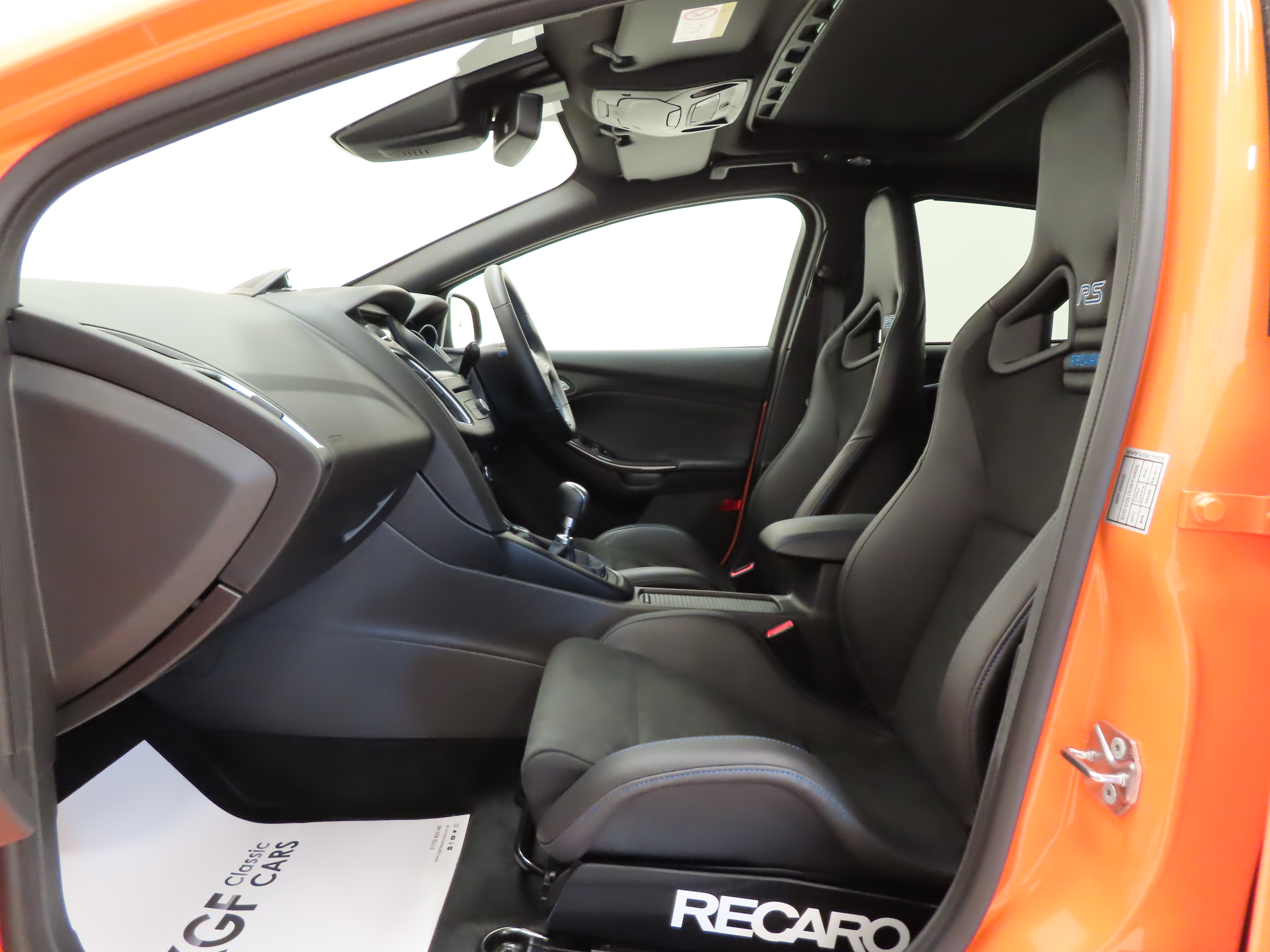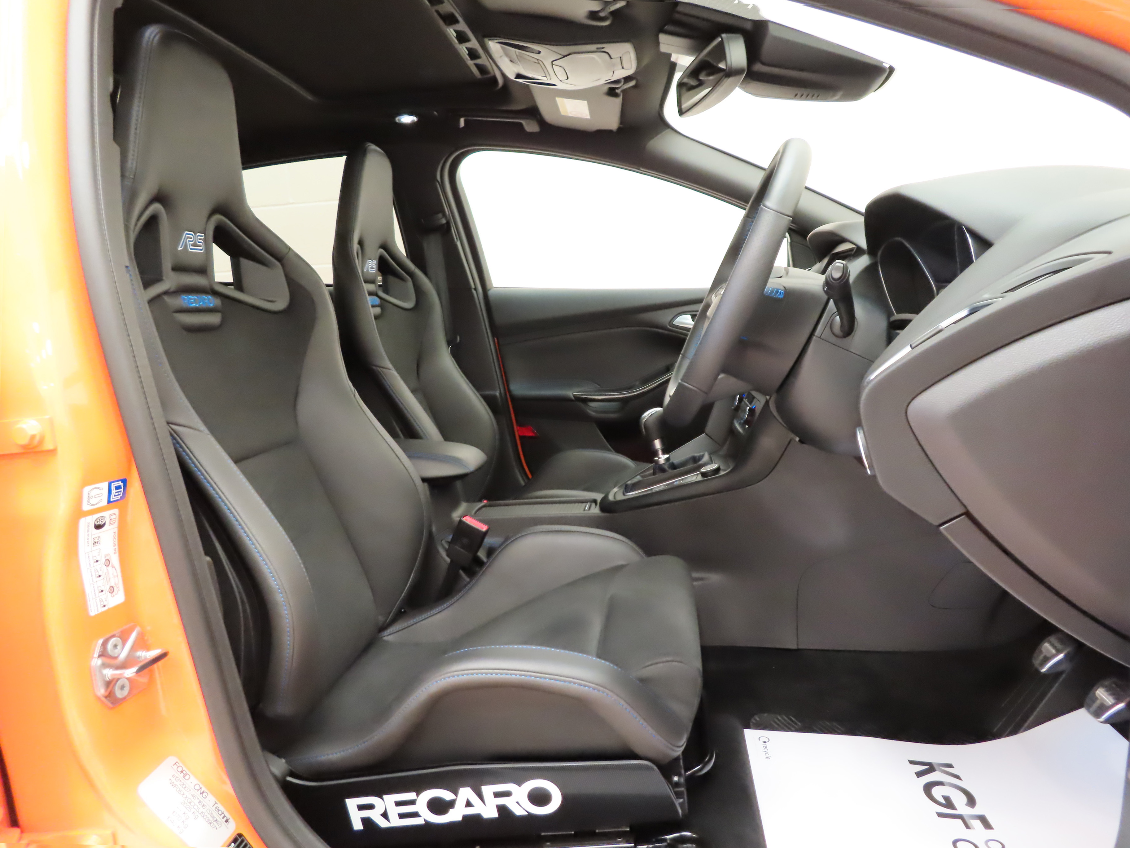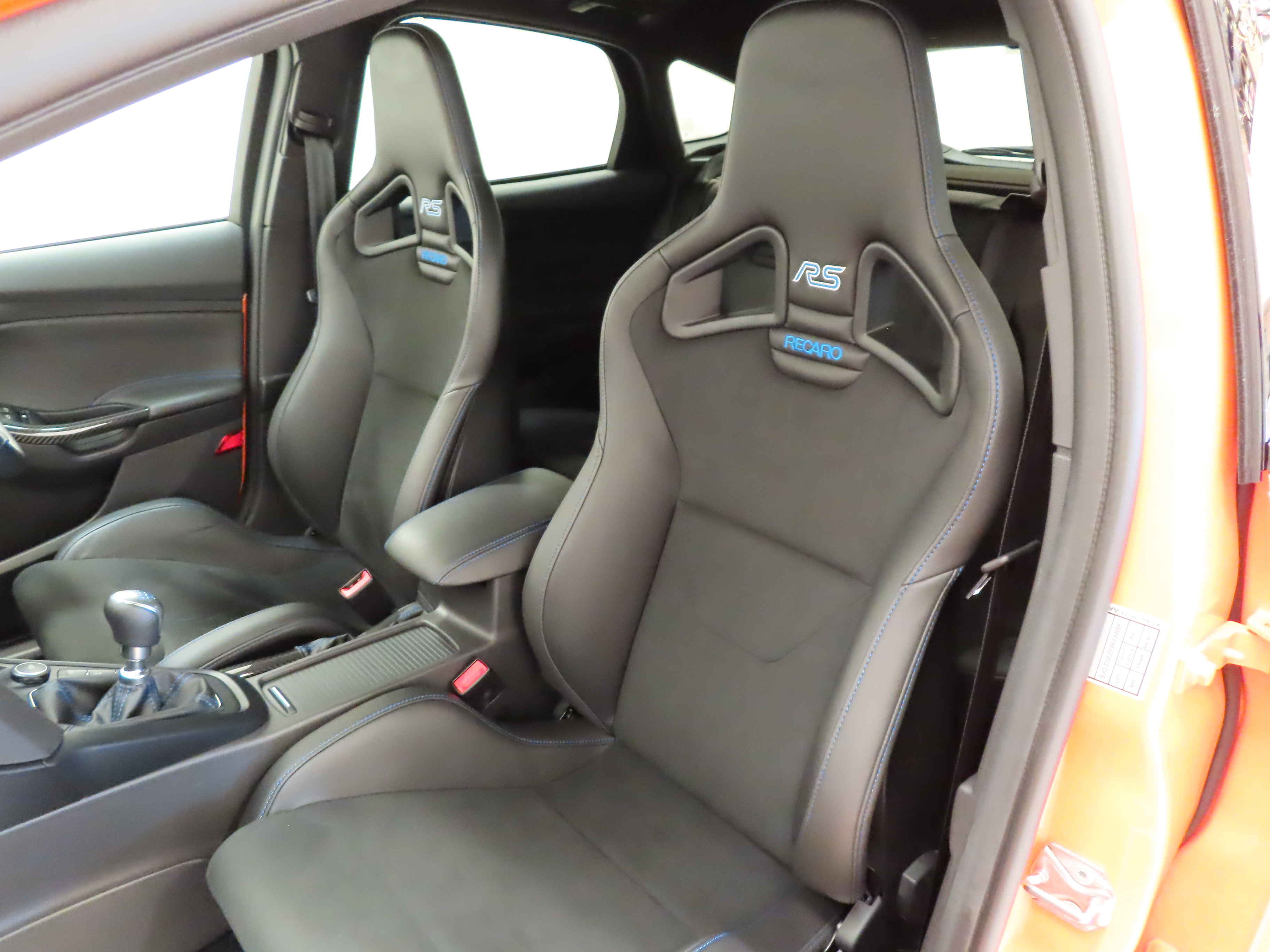 All-Wheel Drive with Dynamic Torque Vectoring, four selectable drive modes, SYNC3 8” touchscreen DAB audio nav system, Bi-Xenon HID headlamps, Ford Power Starter button, Tyre-Pressure Monitoring System, Performance gear-shift light. RS Heritage Special Equipment; Tief Orange paintwork, black forged alloy wheels, grey-finish brake callipers, contrasting black door mirrors and rear spoiler, privacy glass, sunroof, rear parking sensors, partial leather Recaro Race moulded seats, carbon fibre trim, power-fold door mirrors, cruise control/speed limiter, heated steering wheel, mechanical Quaife limited-slip differential, FPM375 Mountune power upgrade. Dealer accessories; Ford tailored carpet mats, RS dashboard protector.