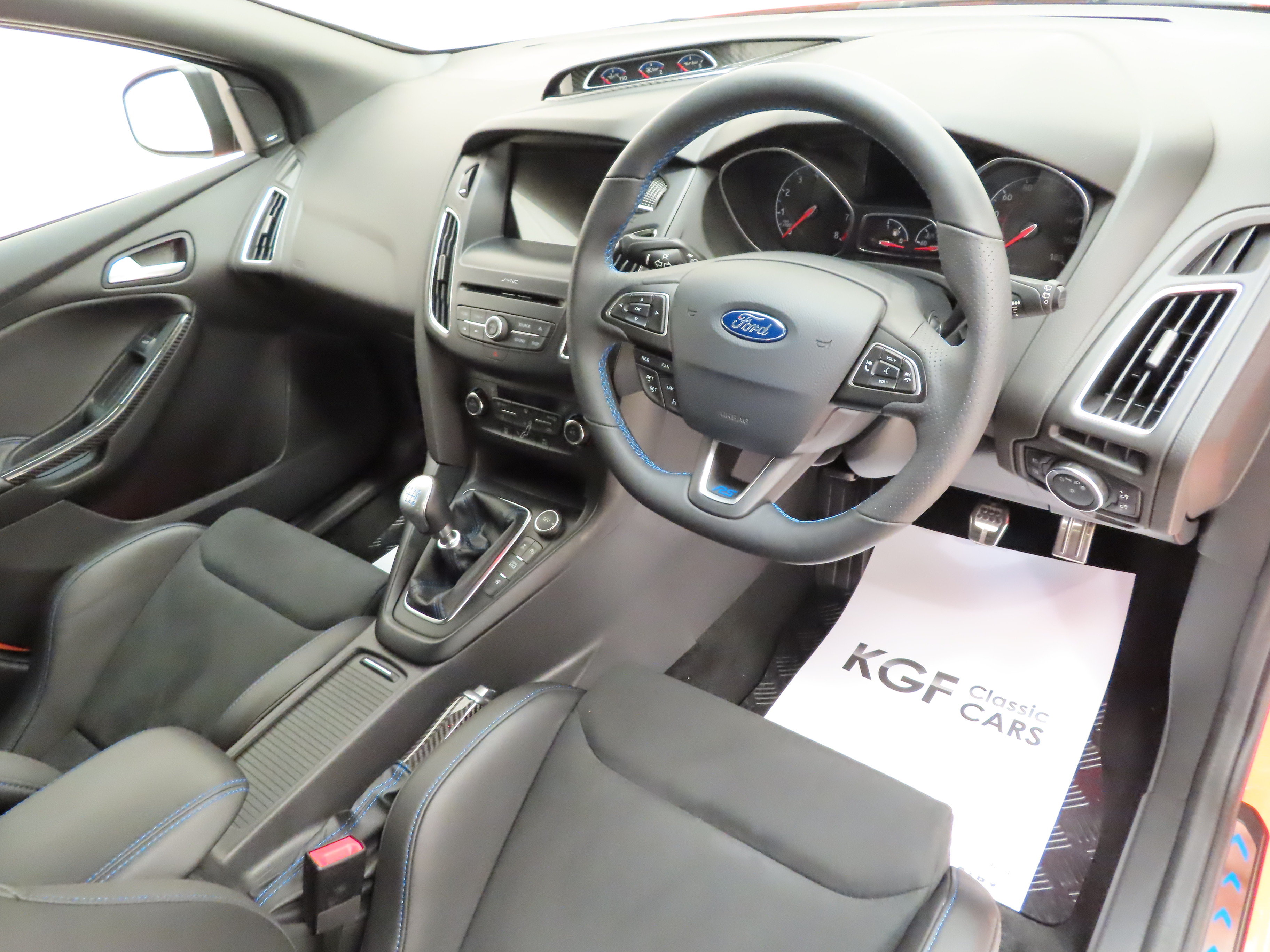 Upon opening the door of this volcanic Focus, you are instantly greeted with extrovert styling including the naked seat frame emblazoned with Recaro lettering, bright blue contrast stitching throughout and brushed aluminium tread plates with RS logo. Climb into the phenomenal Recaro Race moulded seats with huge bolsters and harness holes and you are instantly aware this is a cockpit like no ordinary Focus! The partial leather/Alcantara seat upholstery, (Code AR), is in perfect condition as is the rest of the trim and soft-touch material in a car that has covered just 2,618 miles. The carpets are as new having being protected by three sets of carpet mats and further preservation measures include the tailored RS dashboard protector. All functions, gauges and controls are as new and fully functional including the SYNC3 8” touchscreen DAB audio nav system.
