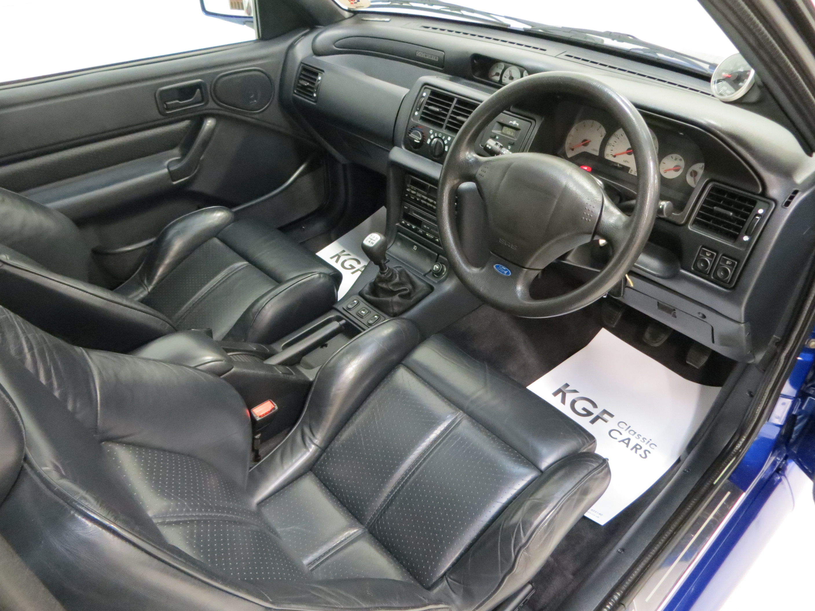 Body colour front bumper with black lower extension, lower front splitter, front airdam, louvred bonnet air intakes, wing air extraction grilles, aerodynamic rear wing with lower boot spoiler, integral driving lights and fog lights, driver airbag, seat-belt grabbers, central double locking, tailgate wiper, padded armrest with cassette storage, oil pressure gauge, turbo gauge, voltmeter, quartz digital clock with ambient temperature, white sports dials, delayed courtesy light, map reading lights, glove box illumination , Ford 2007 RDS radio/cassette. Factory Options; Luxury Pack comprising of; electrically operated and heated door mirrors, ‘Quickclear’ heated windscreen, heated washer jets, three-spoke leather covered steering wheel, rear centre armrest, rear head restraints, electric sunroof, electric windows. Air conditioning, CD player model 2040. Aftermarket; Clifford 650 Concept alarm, boost gauge.