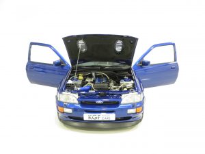 The Ford Escort RS Cosworth was a sports derivative and rally homologation special of the fifth generation Ford Escort. It was designed to qualify as a Group A car for the World Rally Championship. It was available as a road car from 1992-96 in limited numbers from Ford’s Specialist Vehicle Engineering, (SVE), team. It combines the hand-assembled engine expertise of Cosworth and the coach-building crafts of Karmann. In order to accommodate the larger Cosworth engine and transmission Ford developed the car around the chassis and mechanicals of its predecessor, the Sierra Cosworth. A very rare car with only 7,145 examples being produced and this one of the early 2500 built for homologation. (Source Wikipedia, 1995 Edition One RS Brochure and the RS Owners Club).