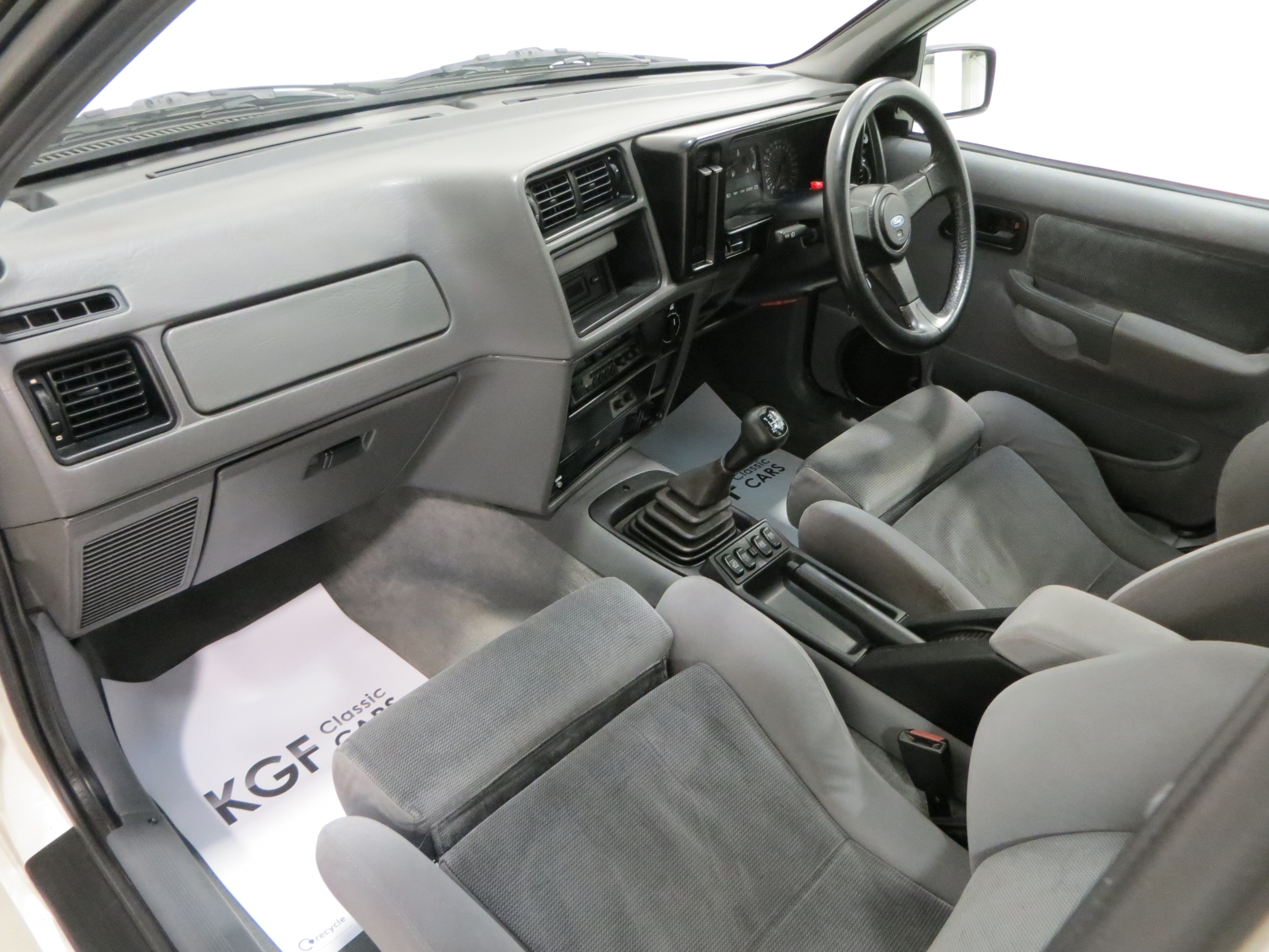 The factory standard interior of this truly special example remains exactly as Ford intended. Trimmed in the original attractive Halley and Angora fabric (code L) the supportive Recaro seats are virtually perfect and hold the front seat occupants tightly. The driver inclined dashboard is completely free from any cracks and all incorporated switches and functions are intact and operate as they should. The three spoke leather trimmed sports steering wheel and leather gear knob display only light signs of wear. The standard electronic sound system with power amplifier remains fully operational, although aftermarket speakers have been neatly fitted. The clean shark grey carpeting is largely wear free and the headlining is pristine. An iconic and instantly recognisable classic Ford RS interior, the ultimate sports saloon car.