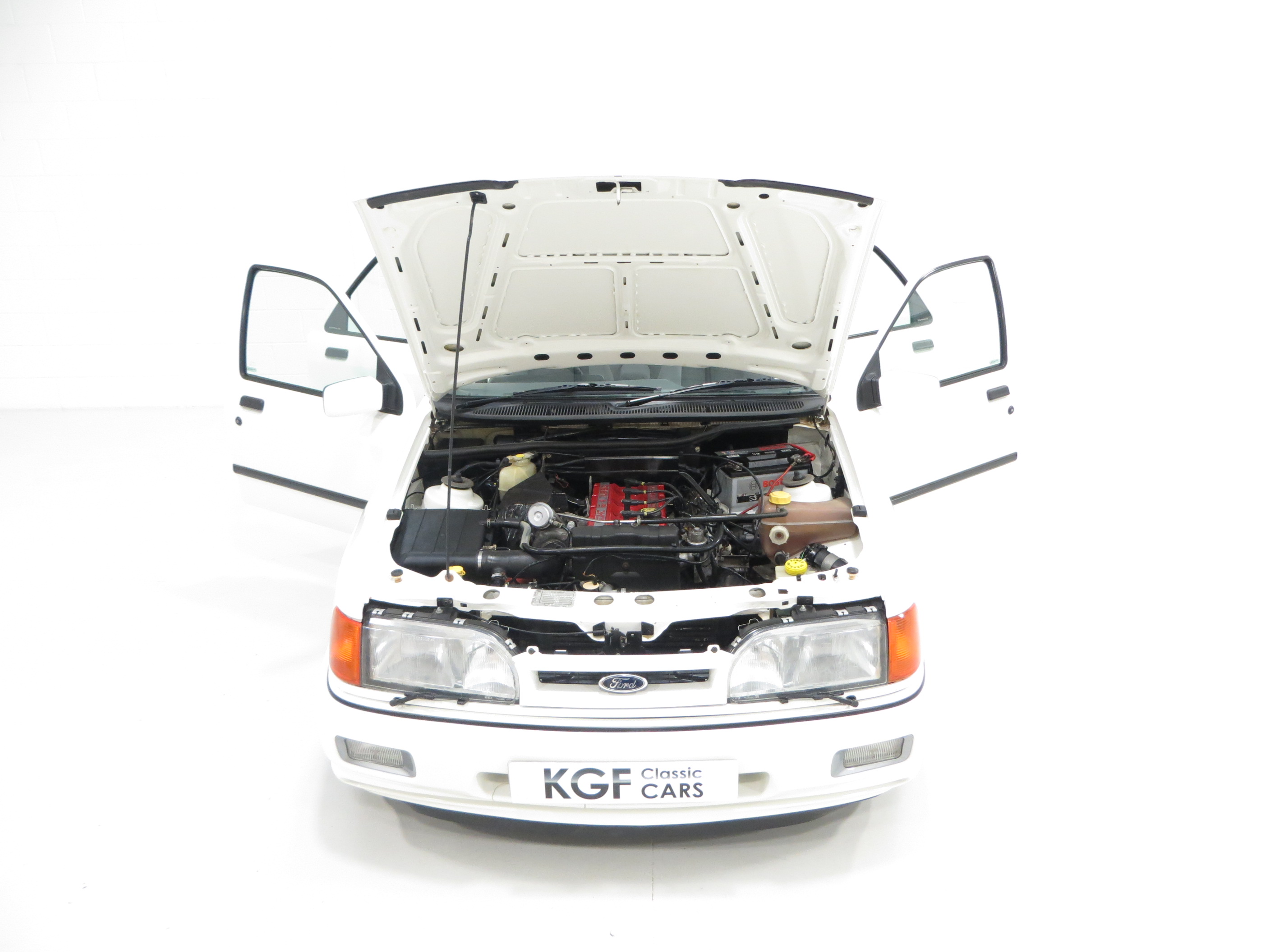 Fitted with the standard 1993cc Dual Over Head Cam (DOHC) engine with the Garrett AiResearch T.03B turbocharger and intercooler, the racing pedigree of this car is truly evident. The engine bay is spotlessly clean and still has the original headshield and Ford stamped fuse box cover. Output figures of 204bhp and 278Nm torque enable the published performance figures of 0-60mph in 6.1 seconds and a top speed of 150mph. The five speed manual gearbox is reassuringly, crisp and precise.