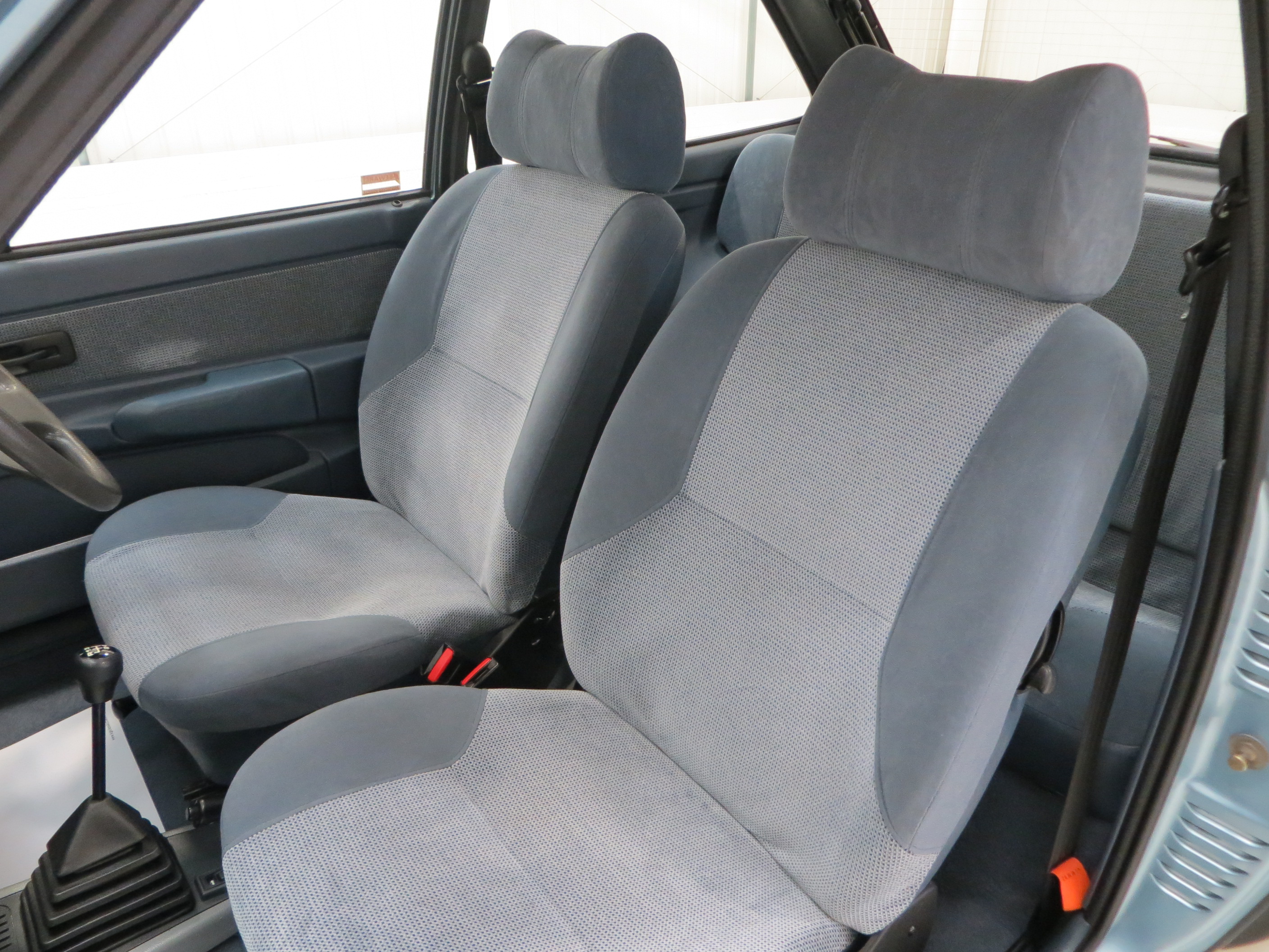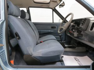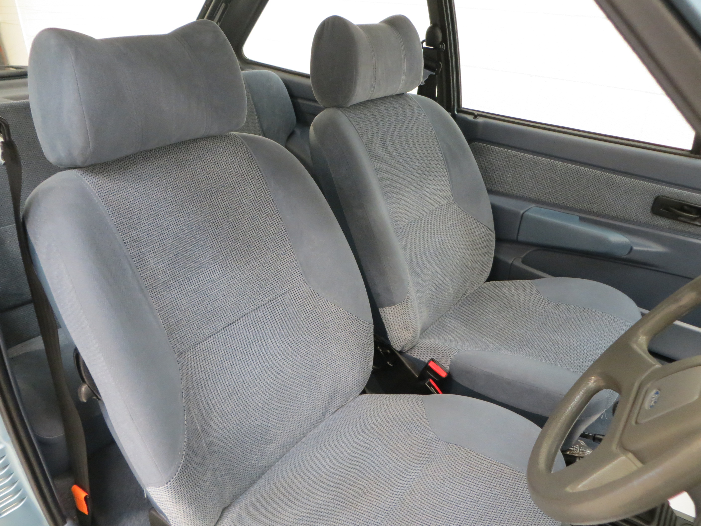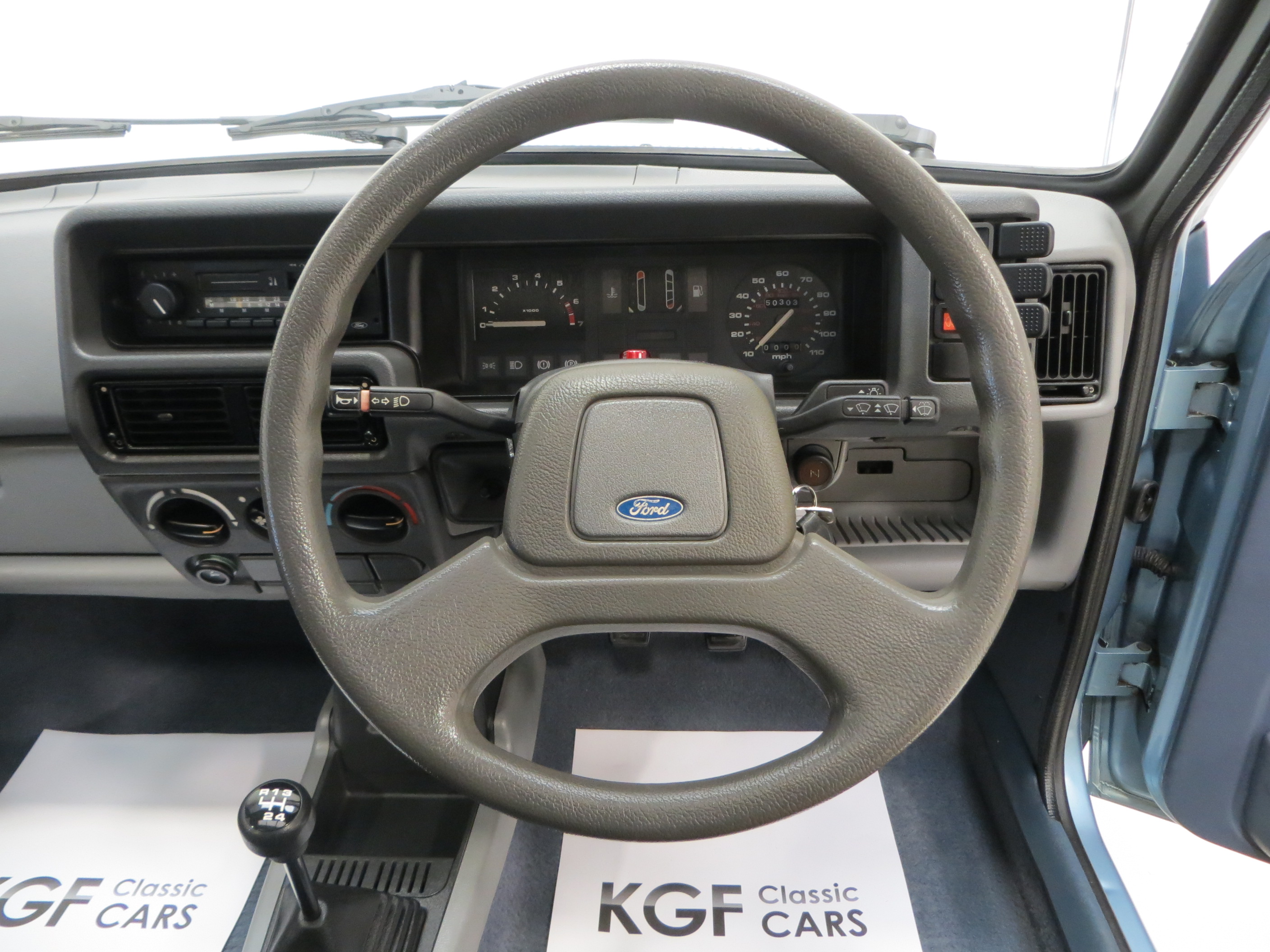 The interior of this remarkable example is in exceptional original condition and exactly as Ford intended. The Savoy fabric trim in Blue colour scheme (code DR) is spotlessly clean and the common vulnerable areas for wear such as the seat bases and bolsters are undamaged. The colour-keyed velour carpet is clean and the perforated neutral tone headlining is flawless. Some of the factory protective plastic wrapping is still attached underneath the seats and even the date tags on the seatbelts remain attached! All switchgear is functional and intact, and the soft finish dashboard is perfect. The header mounted digital clock retains the correct green LCD display and the original Ford stereo radio/cassette remains fitted and functional. The hugely difficult to source trimmed parcel shelf is intact, straight and complete with the correct rubber hangers. This well-appointed Fiesta is the embodiment of a prized modern classic Ford.